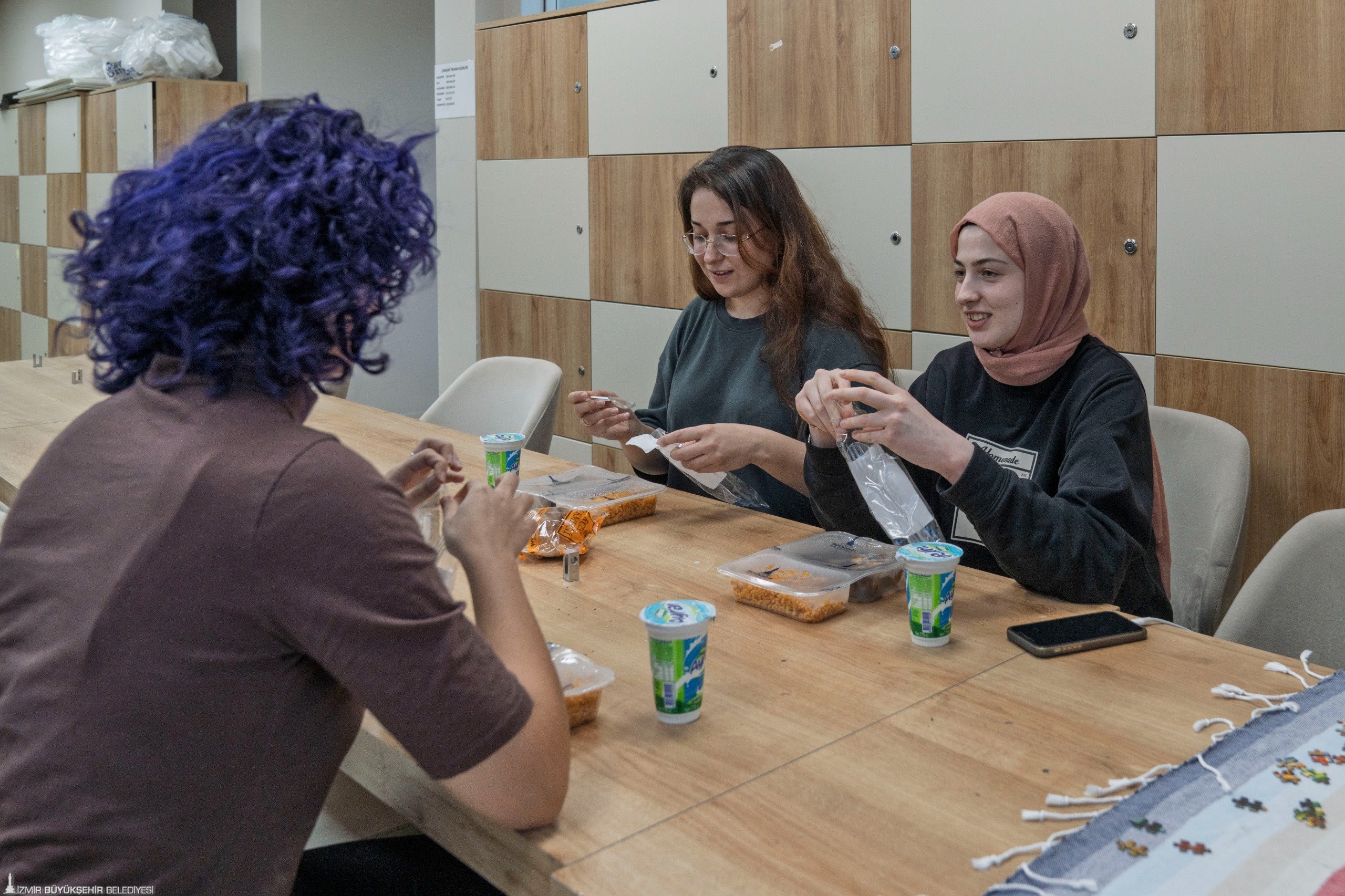 Ekonomik krize karşı üniversite öğrencileri ve ailelerine çeşitli desteklerde bulunan İzmir Büyükşehir Belediyesi, kız öğrencilere yönelik hizmet veren İZELMAN Örnekköy Sosyal Tesisi’nin aylık ücretine bu yıl da zam yapmadı. İzmir Büyükşehir Belediye Başkanı Dr. Cemil Tugay’ın talimatıyla aylık ücreti 2 bin TL olan 72 kişi kapasiteli sosyal tesis, öğrencilere adeta yuva oluyor. Güvenli bir ortamda barınma imkânına kavuşan öğrenciler, kahvaltı ve akşam yemeği olmak üzere günde iki öğün yemek hizmetinden de yararlanabiliyor. Tesiste ayrıca çalışma alanları, kütüphane ve ortak mutfak da yer alıyor.