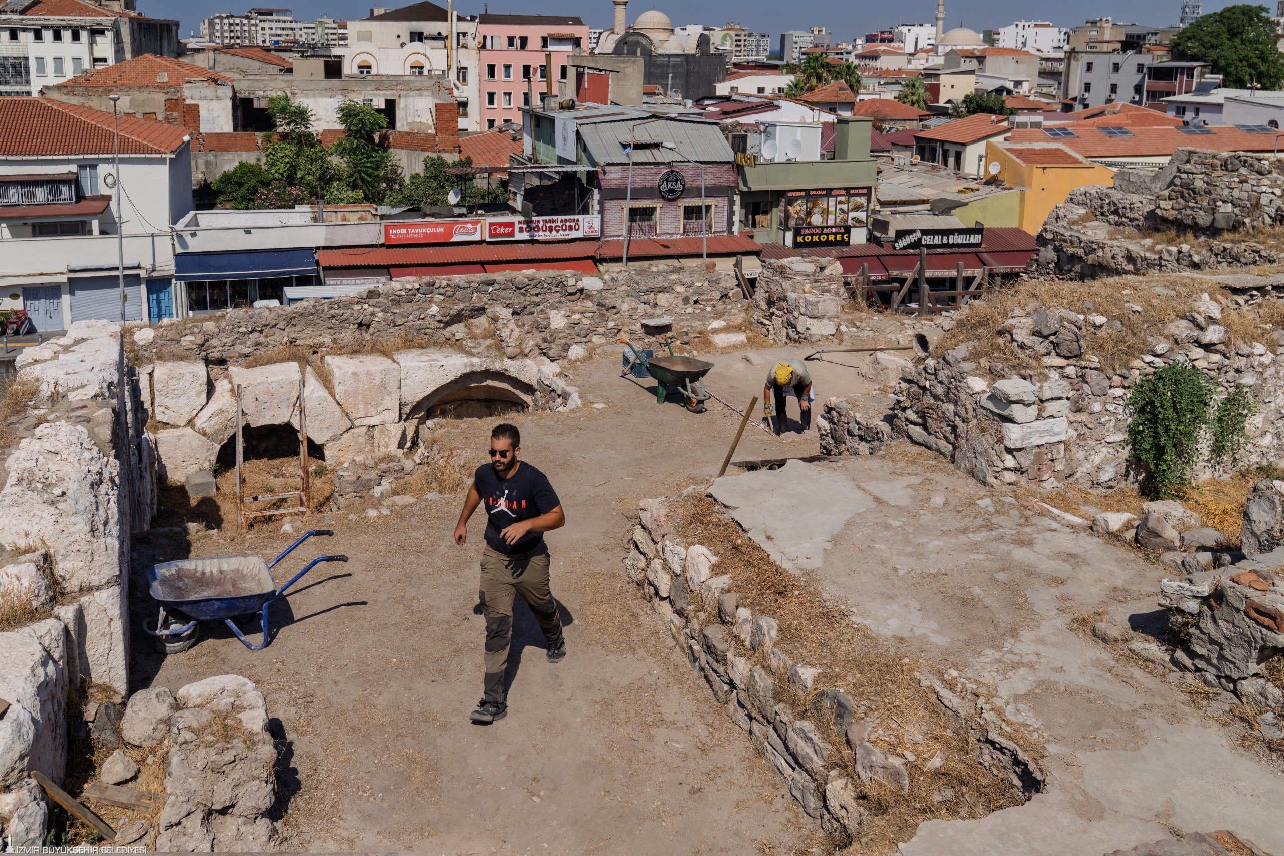 2007 yılından itibaren İzmir’in tarihi kent merkezindeki arkeolojik kazı çalışmalarını yürüten Smyrna Antik Kenti Kazı Başkanı ve İzmir Katip Çelebi Üniversitesi Türk İslam Arkeolojisi Bölümü Öğretim Üyesi Prof. Dr. Akın Ersoy, “Çalışmalarımızda Kültür ve Turizm Bakanlığının maddi desteğinin yanı sıra İzmir Büyükşehir Belediyesi’nin önemli ölçüde destekleri söz konusu. Ayrıca başka sponsorlarımız da bulunuyor. Smyrna Antik Kenti kazılarını şu an özellikle iki noktada yürütüyoruz. Antik Smyrna Agorası’nda güncel olarak Kemeraltı’na bakan tarafta bir hamamın gymnasium bölümünün ortaya çıkarılması için çalışma yürütüyoruz. İkinci çalışma alanımız da özellikle İzmirlilerin de çok beklediği Antik Smyrna Tiyatrosu’nda sürüyor” diye konuştu. Ören yeri içinde Osmanlı dönemine ait sarnıçlı çeşmeler ve şehir içi han yapısı olduğunu belirten Prof. Dr. Akın Ersoy, Osmanlı Dönemi yapılarını da koruyarak altında kalan gymnasium bölümünün ortaya çıkarılması için çalıştıklarını kaydetti.