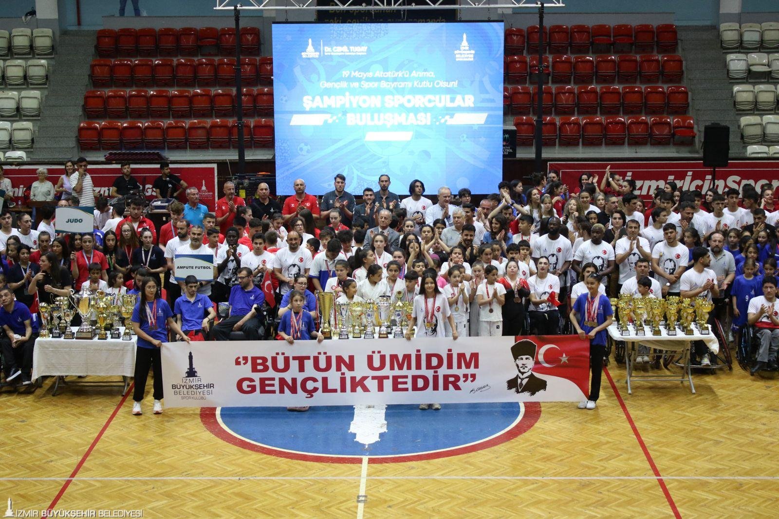 19 Mayıs Atatürk’ü Anma, Gençlik ve Spor Bayramı etkinlikleri kapsamında düzenlenen törende İzmir Büyükşehir Belediyesi Spor Kulübü’nün başarılı sporcuları bir araya geldi. Kulüp Başkanı Ertuğrul Tugay ve kulüp yönetim kurulu üyeleri, 2024 ve 2025 sezonunda ulusal ve uluslararası turnuvalarda başarı elde eden ve milli takımlara davet edilen sporcu ve antrenörlerle Celal Atik Spor Salonu'nda buluştu. 2024 ve 2025 sezonunda ulusal ve uluslararası turnuvalarda 123’ü altın olmak üzere 400 madalya kazanan, 13 farklı branştan 84 sporcusu ile 23 antrenörünü milli takımlara uğurlayan İzmir Büyükşehir Belediyesi Spor Kulübü, madalyalı sporcuları ve milli takım antrenörleri için özel bir etkinliğe imza attı. Törene katılan sporcu ve antrenörler hem başarılarını kutladı hem de bayram coşkusunu takım arkadaşlarıyla birlikte yaşadı.