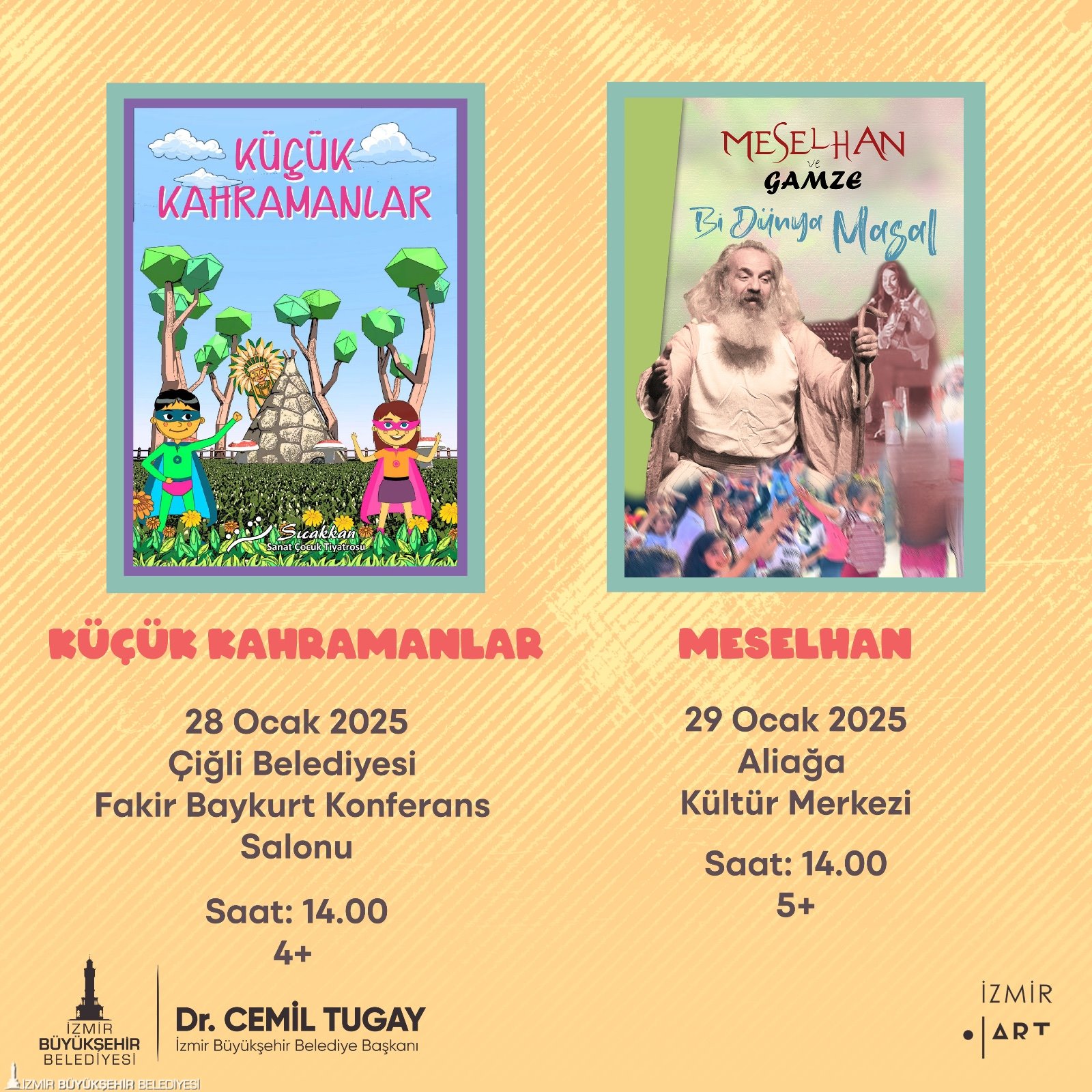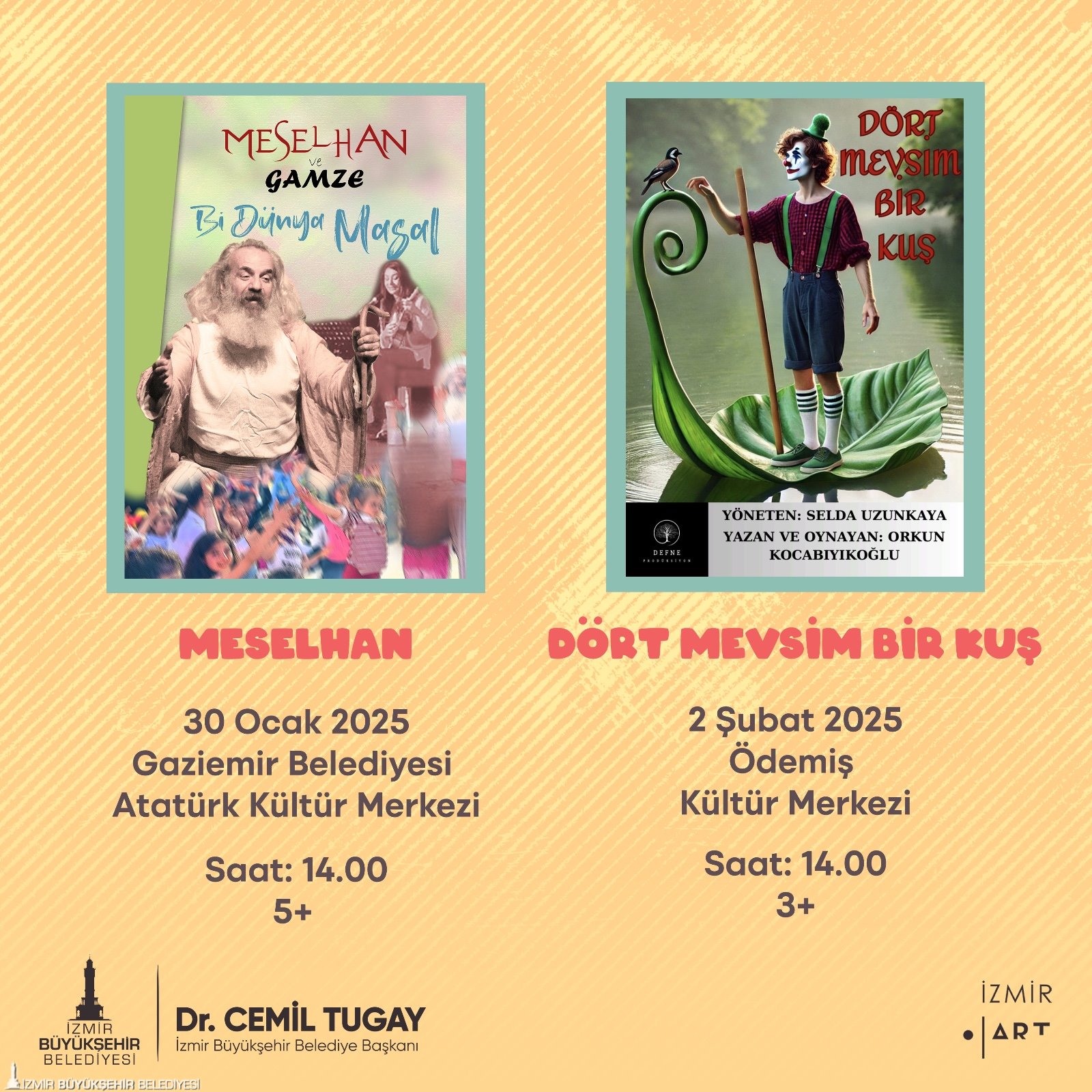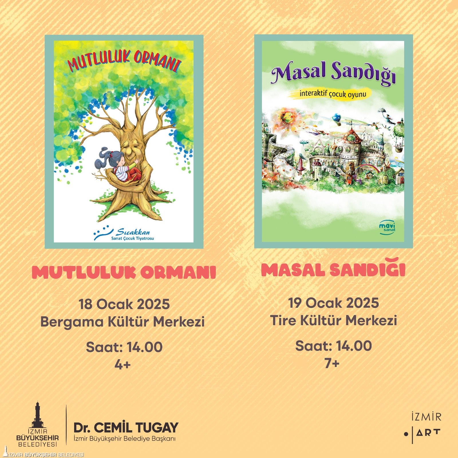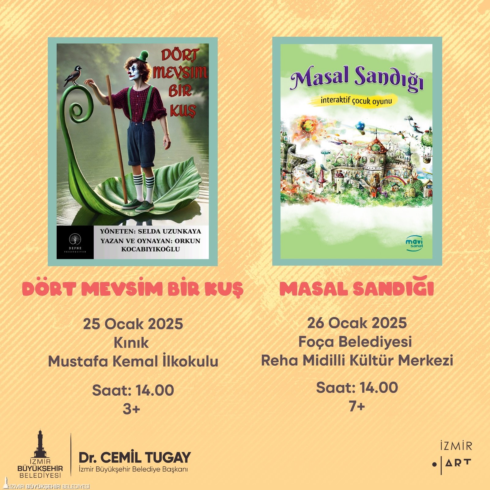 18 Ocak günü Bergama Kültür Merkezi’nde 4 yaş üzeri çocuklar için Mutluluk Ormanı, 19 Ocak günü Tire Kültür Merkezi’nde 7 yaş üzeri çocuklar için Masal Sandığı, 20 Ocak günü Kemalpaşa Belediyesi Mesire Alanı Atatürk Düğün Salonu’nda ve 21 Ocak günü Bornova Belediyesi Altındağ AKM Yıldız Kenter Sahnesi’nde 4-10 yaş arası çocuklar için Masal Karnavalı, 22 Ocak günü Kiraz Belediyesi Düğün Salonu’nda ve 23 Ocak günü Beydağ Kültür Merkezi’nde 4-9 yaş arası çocuklar için Mucit Palyaço, 25 Ocak günü Kınık Mustafa Kemal İlkokulu’nda 3 yaş üzeri çocuklar için Dört Mevsim Bir Kuş, 26 Ocak günü Foça Belediyesi Reha Midilli Kültür Merkezi’nde 7 yaş üzeri çocuklar için Masal Sandığı, 28 Ocak günü Çiğli Belediyesi Fakir Baykurt Konferans Salonu’nda 4 yaş üzeri çocuklar için Küçük Kahramanlar, 29 Ocak günü Aliağa Kültür Merkezi’nde 5 yaş üzeri çocuklar için Meselhan ve Gamze Bi Dünya Masal, 30 Ocak günü Gaziemir Belediyesi Atatürk Kültür Merkezi’nde 5 yaş üzeri çocuklar için Meselhan ve Gamze Bi Dünya Masal, 2 Şubat günü Ödemiş Kültür Merkezi’nde 3 yaş üzeri çocuklar için Dört Mevsim Bir Kuş tiyatro oyunları ücretsiz olarak sahnelenecek. Tüm oyunlar saat 14.00’te başlayacak.