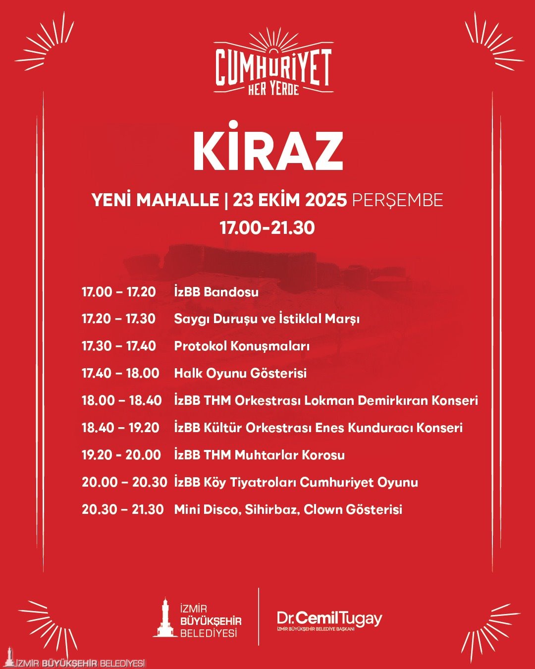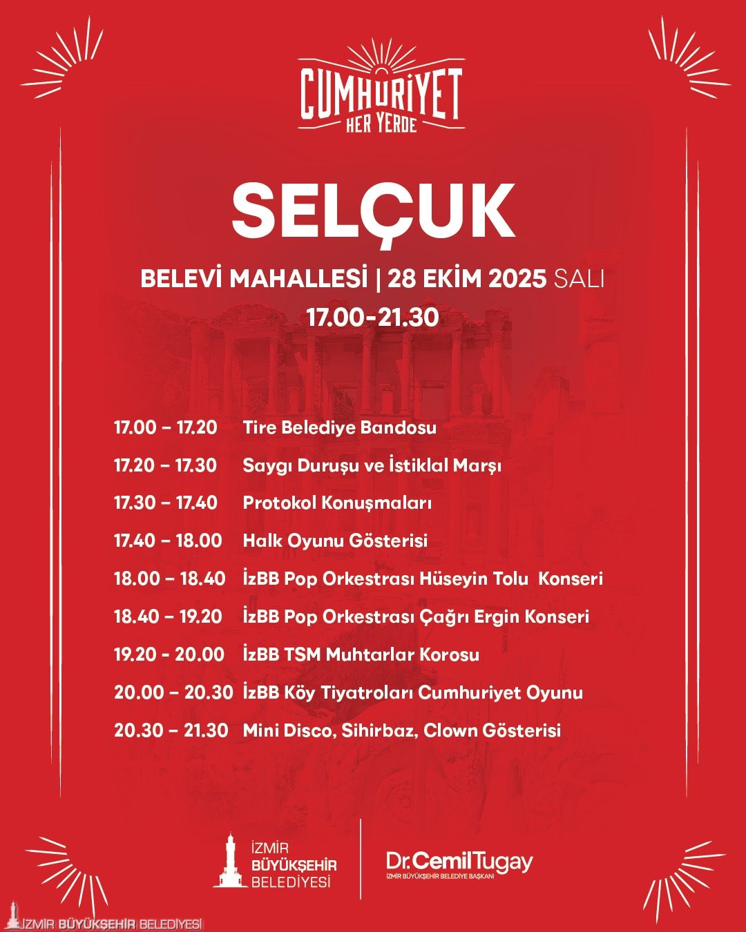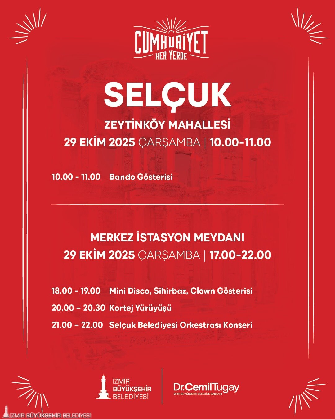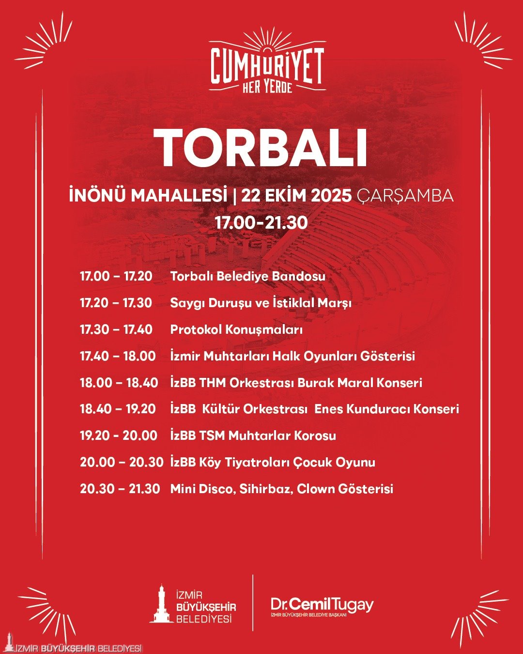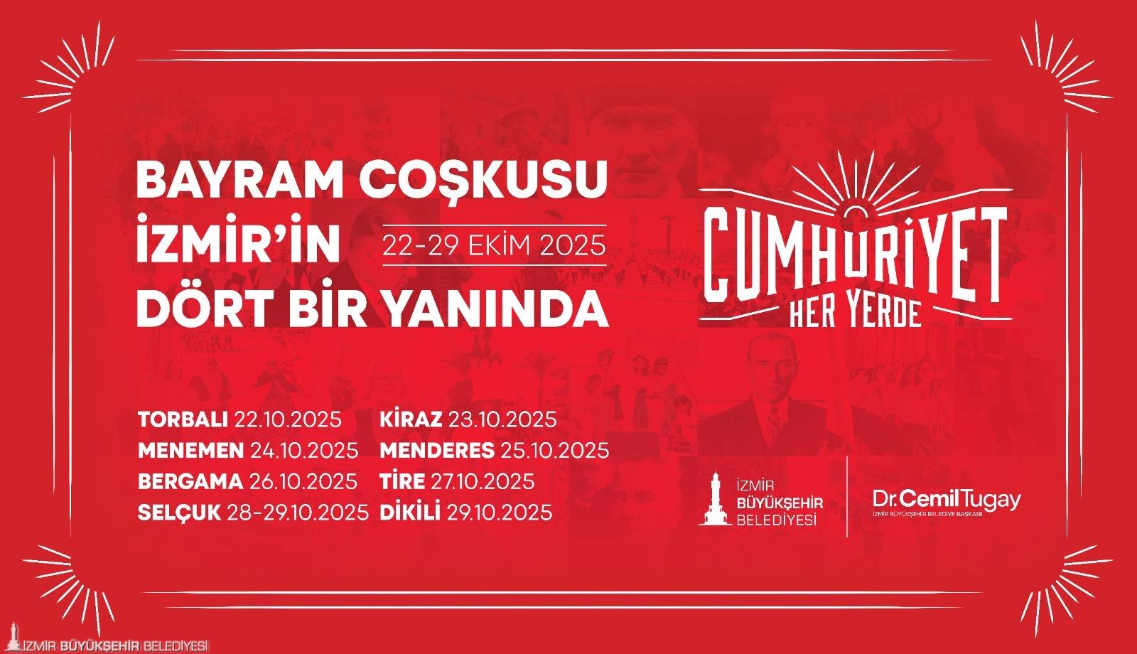 “Cumhuriyet Her Yerde” etkinlikleri, 22 Ekim günü Torbalı İnönü Mahallesi’nde başlayacak. 23 Ekim’de kutlamaların adresi Kiraz Yeni Mahalle olacak. 24 Ekim’de Menemen Gazi Mustafa Kemal Mahallesi, 25 Ekim’de Menderes Şehit Astsubay Ömer Halis Demir Parkı, 26 Ekim’de Bergama Ayaskent Mahallesi’nde, 27 Ekim’de Tire Merkez Gölet’te, 28 Ekim’de Selçuk Belevi Mahallesi’nde birbirinden farklı etkinlikler gerçekleştirilecek. 29 Ekim Cumhuriyet Bayramı’nda saat 10.00’da Selçuk Zeytinköy Mahallesi’nde bando gösterisi yapılacak. Saatler 18.00’i gösterdiğinde ise Selçuk Merkez İstasyon Meydanı’nda kortej yürüyüşü, Selçuk Belediyesi Orkestrası Konseri, çocuklar için mini disco, sihirbaz, clown gösterileri gerçekleştirilecek. 29 Ekim Cumhuriyet Bayramı’nda ayrıca Dikili merkezde saat 20.00’de düzenlenecek konserler coşkuyu doruğa çıkaracak.