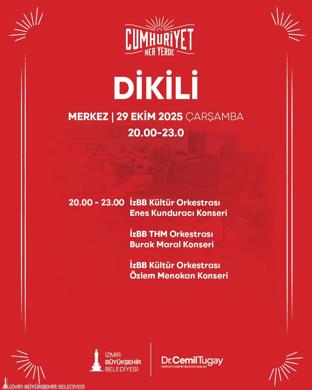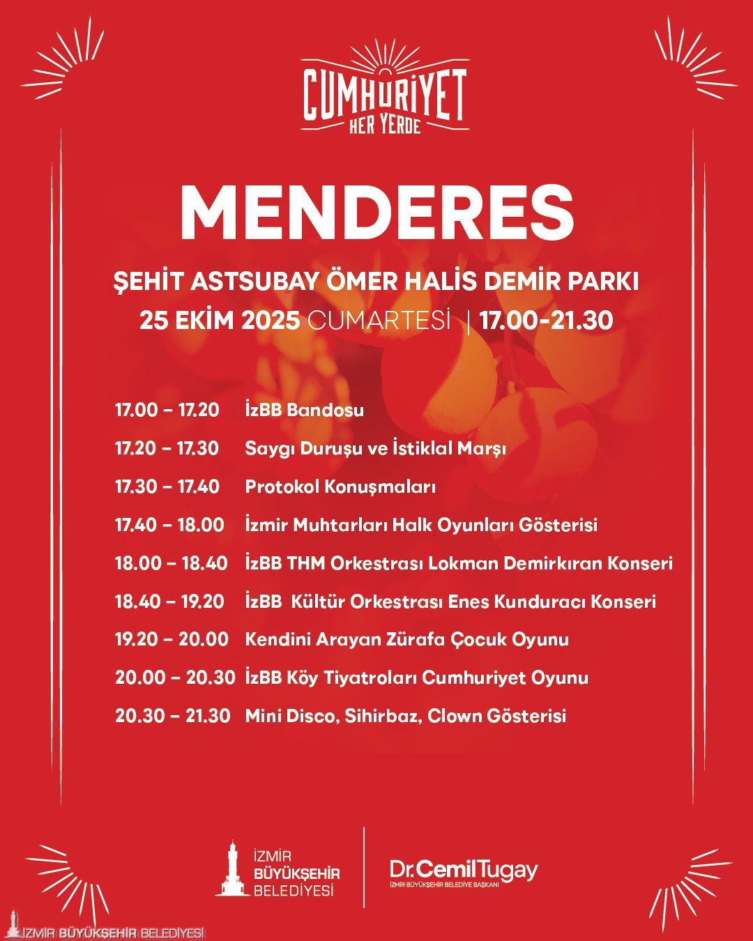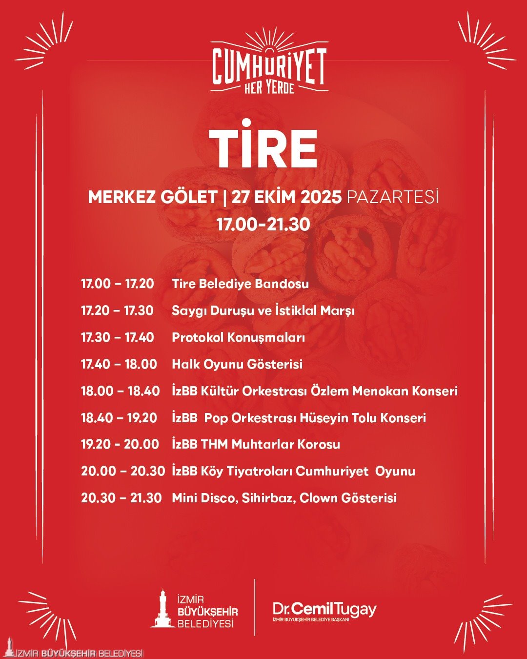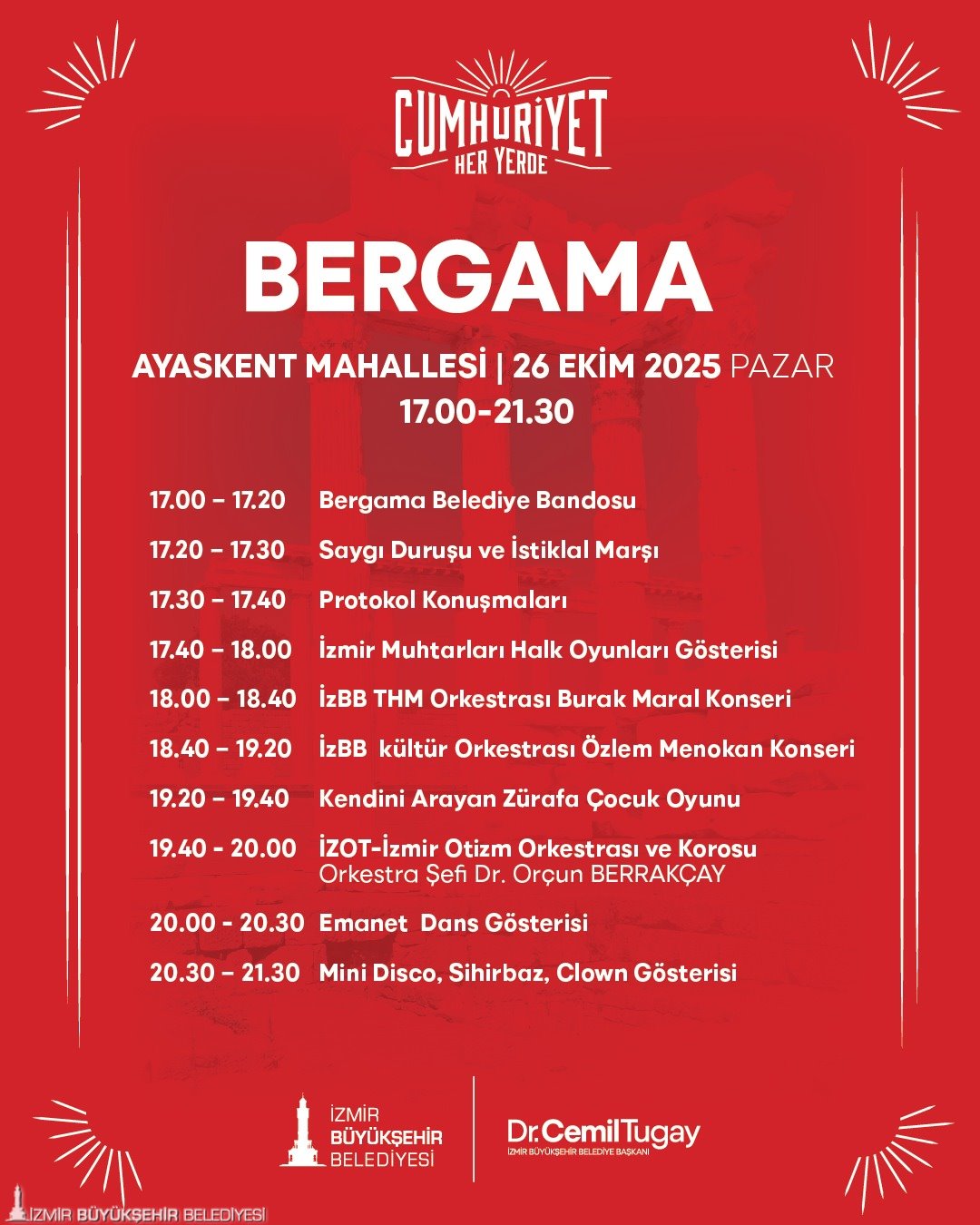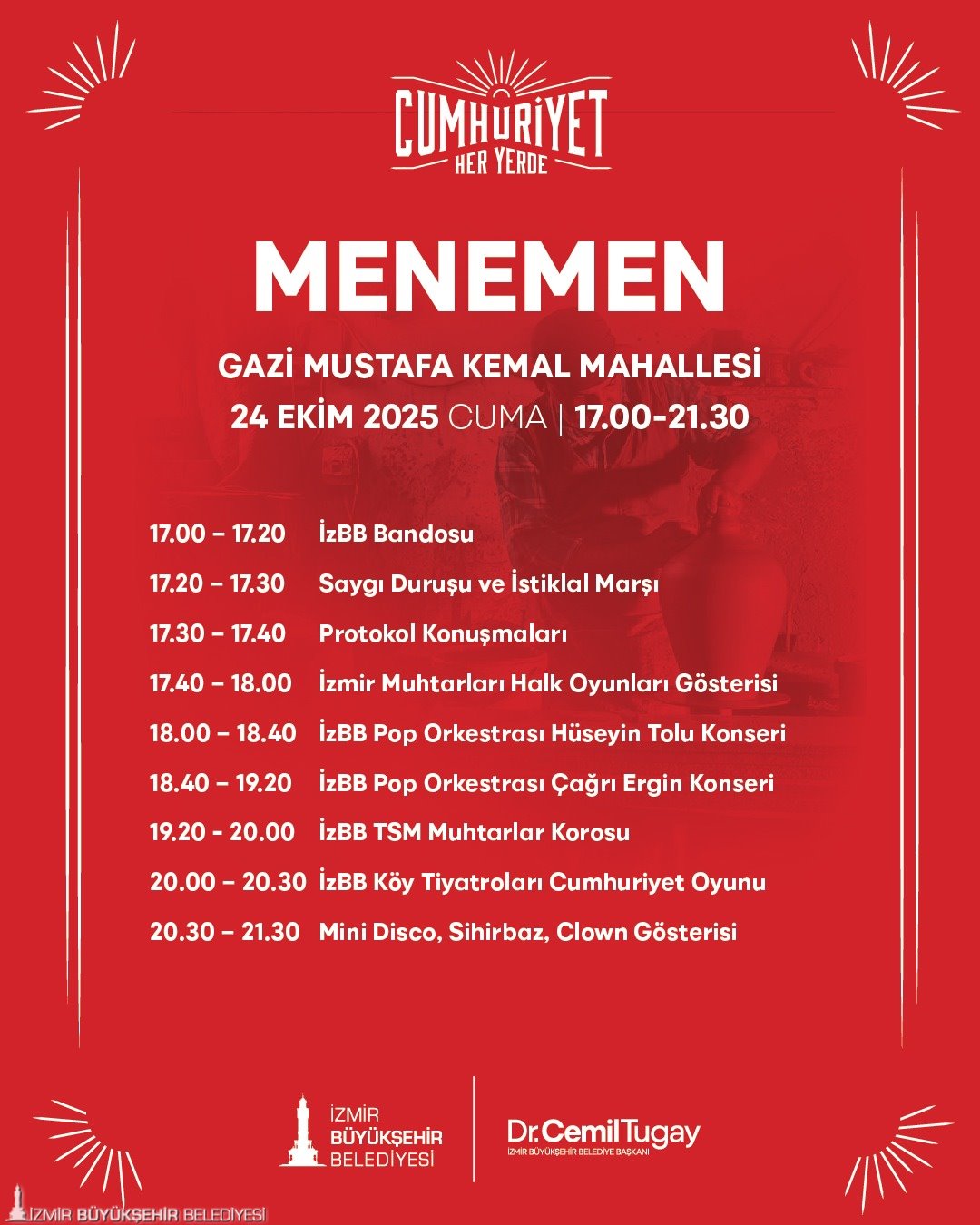 “Cumhuriyet Her Yerde” etkinlikleri, 22 Ekim günü Torbalı İnönü Mahallesi’nde başlayacak. 23 Ekim’de kutlamaların adresi Kiraz Yeni Mahalle olacak. 24 Ekim’de Menemen Gazi Mustafa Kemal Mahallesi, 25 Ekim’de Menderes Şehit Astsubay Ömer Halis Demir Parkı, 26 Ekim’de Bergama Ayaskent Mahallesi’nde, 27 Ekim’de Tire Merkez Gölet’te, 28 Ekim’de Selçuk Belevi Mahallesi’nde birbirinden farklı etkinlikler gerçekleştirilecek. 29 Ekim Cumhuriyet Bayramı’nda saat 10.00’da Selçuk Zeytinköy Mahallesi’nde bando gösterisi yapılacak. Saatler 18.00’i gösterdiğinde ise Selçuk Merkez İstasyon Meydanı’nda kortej yürüyüşü, Selçuk Belediyesi Orkestrası Konseri, çocuklar için mini disco, sihirbaz, clown gösterileri gerçekleştirilecek. 29 Ekim Cumhuriyet Bayramı’nda ayrıca Dikili merkezde saat 20.00’de düzenlenecek konserler coşkuyu doruğa çıkaracak.