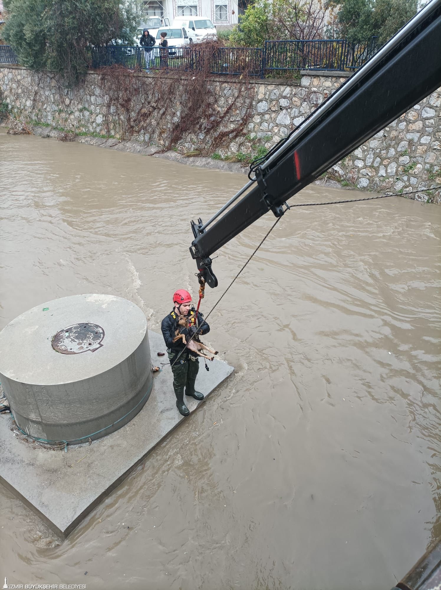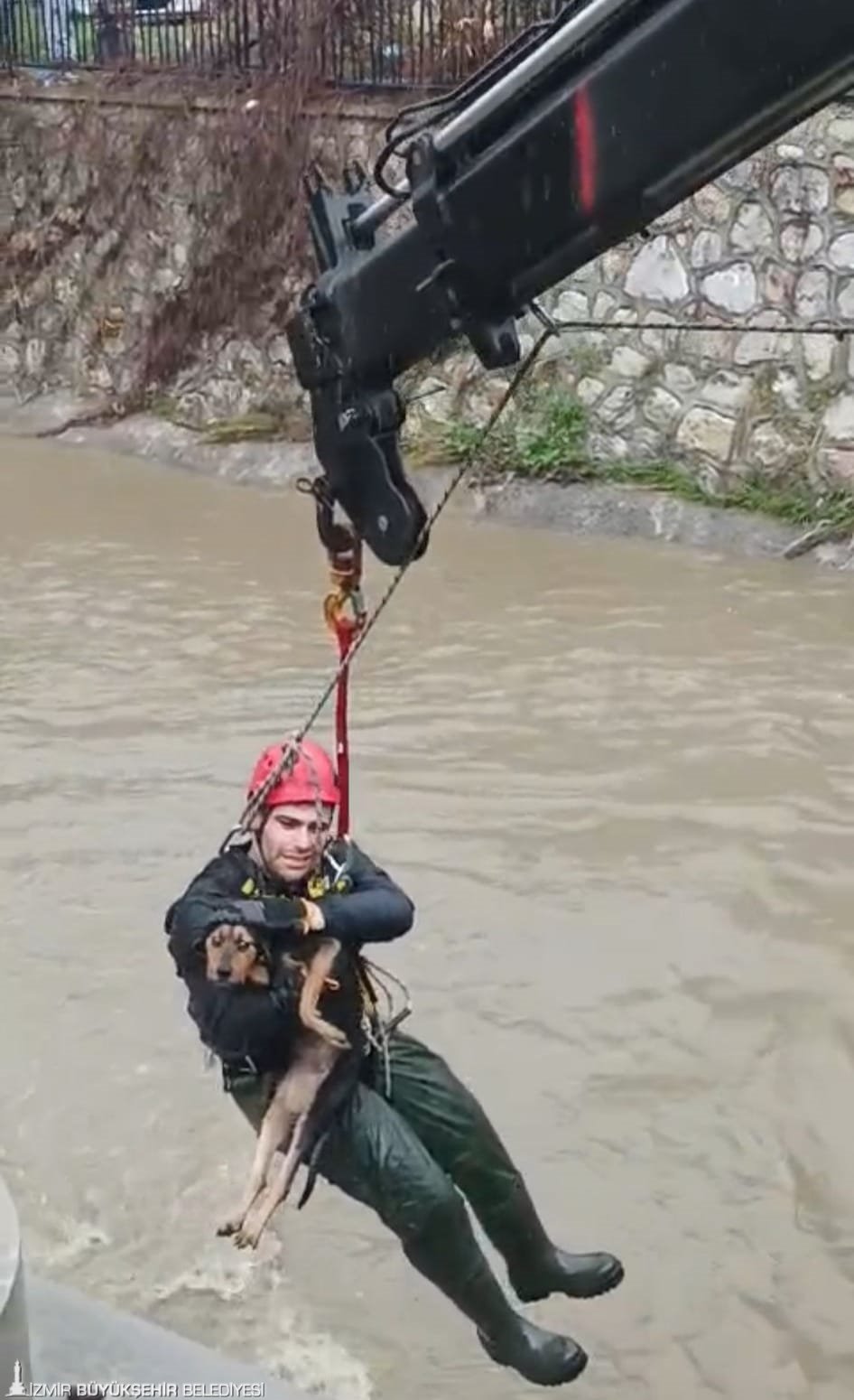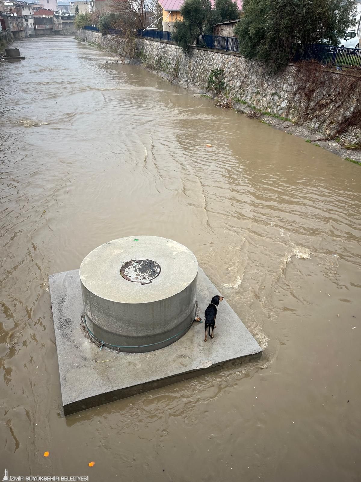 Karabağlar ilçesi Aşık Veysel Mahallesi’nde dere yatağına düşen bir köpeğin fark edilmesi üzerine çevre sakinleri durumu 112 Acil Çağrı Merkezi’ne bildirdi. Yağış nedeniyle su seviyesinin yükseldiği dereden köpeğin kurtarılması için bölgeye İzmir Büyükşehir Belediyesi İtfaiye Dairesi Başkanlığı ekipleri, arazöz ve kurtarma aracıyla sevk edildi. Olay yerine kısa sürede ulaşan ekipler, dere yatağında mahsur kalan köpeği kurtarmak için çalışma başlattı. Yaklaşık 10 dakika içerisinde bulunduğu yerden güvenli bir şekilde çıkarılan köpeğin sağlık durumunun iyi olduğu öğrenildi.