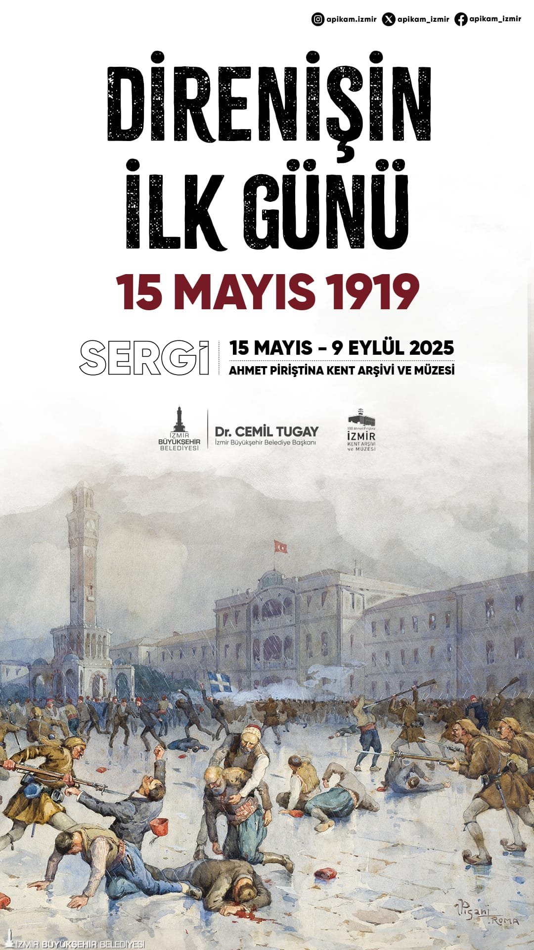 İzmir Büyükşehir Belediyesi APİKAM tarafından hazırlanan "Direnişin İlk Günü, 15 Mayıs 1919" sergisi, 15 Mayıs Perşembe günü 17.30’da ziyaretçilerini ağırlamaya başlayacak. 15 Mayıs 1919'da, İzmir'in Yunanistan tarafından işgalinin 106. yılında ziyarete açılacak sergi, işgale karşı düzenlenen mitinglerle başlayan sivil direniş hareketlerine ve milli mücadele ruhunun uyanışına odaklanıyor. Nejat Yentürk koleksiyonundan nadir belge ve fotoğraflar ile APİKAM arşivi ve İstanbul Büyükşehir Belediyesi Şişli Atatürk Müzesi’nde bulunan İtalyan ressam Vittorio Pisani’nin işgal gününe ait tablolarının görselleriyle zenginleşen sergi, aynı zamanda işgal günü İzmir’de yaşanan olayları da gözler önüne serecek. Ulu Önder Gazi Mustafa Kemal Atatürk’ün İzmir’in işgalinden bir gün sonra 16 Mayıs 1919’da, İstanbul’dan Samsun’a hareketi ve 19 Mayıs 1919’da Milli Mücadele’yi buradan başlatması vurgusunu taşıyan sergi, 15 Mayıs-9 Eylül tarihleri arasında ziyaret edilebilecek.