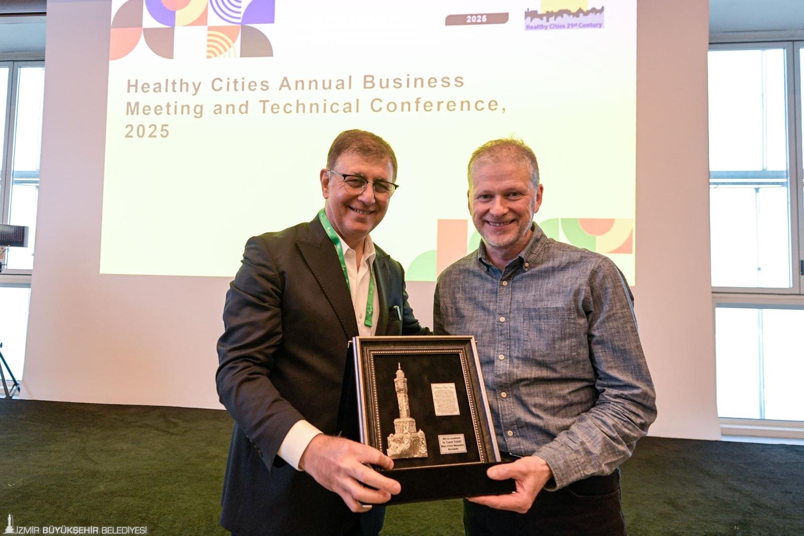 Başkan Tugay, program sonunda DSÖ ve Avrupa Sağlıklı Şehirler temsilcilerine plaket takdiminde bulundu.