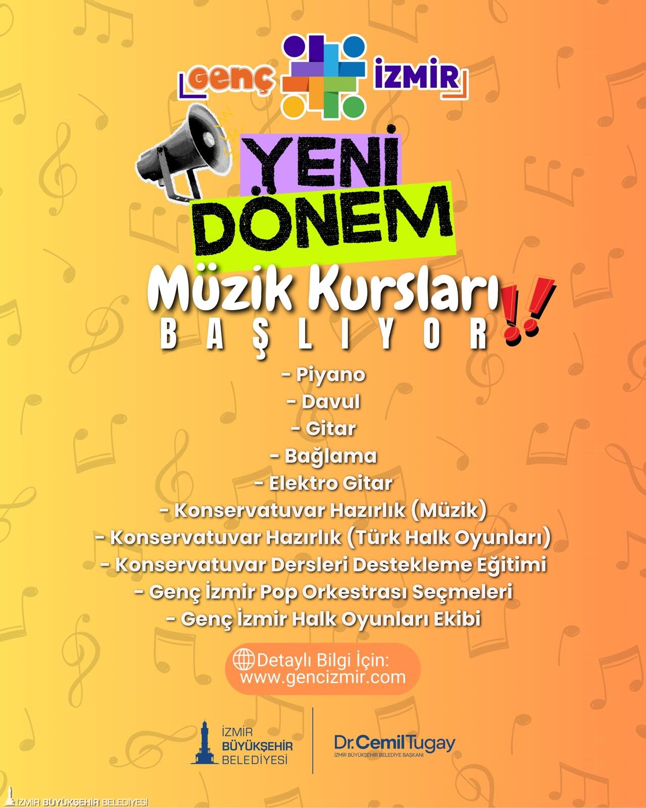İzmir Büyükşehir Belediyesi, 18-30 yaş arasındaki gençler için müzik kurslarından konservatuvara hazırlığa kadar farklı başlıklarda ücretsiz kurslar açıyor. Başvuru süreci 3 Ekim’de sonlanacak.