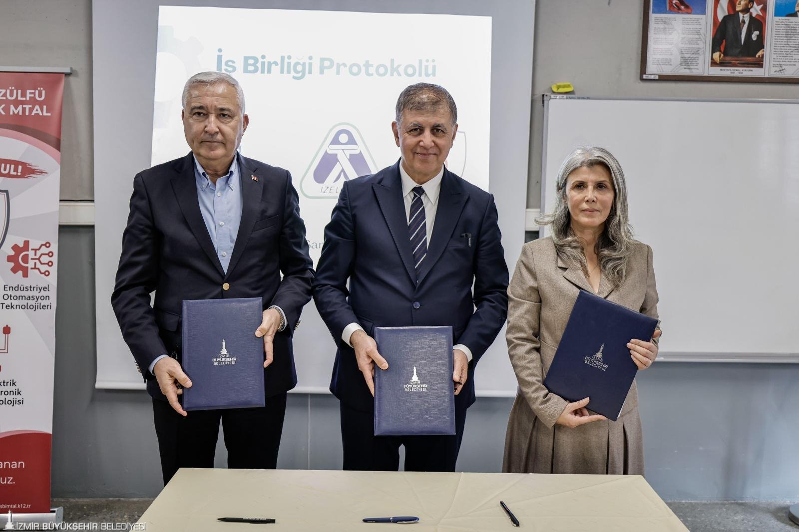 İzmir Büyükşehir Belediyesi ve Kemalpaşa Organize Sanayi Bölgesi (KOSBİ) ortaklığında Türkiye’ye örnek olacak bir iş birliği protokolüne imza atıldı. Mesleki eğitim alan gençlerin güvenli, donanımlı ve güçlü bir geleceğe hazırlanması amacıyla başlatılan protokolle, Kemalpaşa Organize Sanayi Bölgesi Zülfü-Mevlüt Çelik Mesleki ve Teknik Anadolu Lisesi öğrencilerine İzmir Büyükşehir Belediyesi İZELMAN AŞ İş Sağlığı Güvenliği Birimi (İSG) bünyesinde iş sağlığı güvenliği eğitimleri verilecek ve ekipman desteği sağlanacak. Öğrenciler için kültürel geziler, farkındalık etkinlikleri, sağlık taramaları gibi birçok farklı etkinlik ve seminer düzenlenecek. Türkiye’de kamu eliyle doğrudan sanayi bölgelerinde çalışan gençlere yönelik en kapsamlı yerel yönetim İSG destek uygulamalarından biri olma özelliğini taşıyan programla, gençlere farklı bakış açısı kazandırılması hedefleniyor.