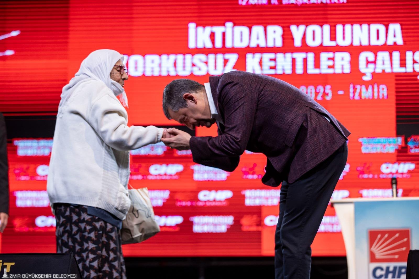 Programın sonunda CHP İzmir İl Örgütü’nün en yaşlı üyesi olan 106 yaşındaki Nuriye Koç, CHP Genel Başkanı Özgür Özel için ördüğü atkıyı sahnede takdim etti.