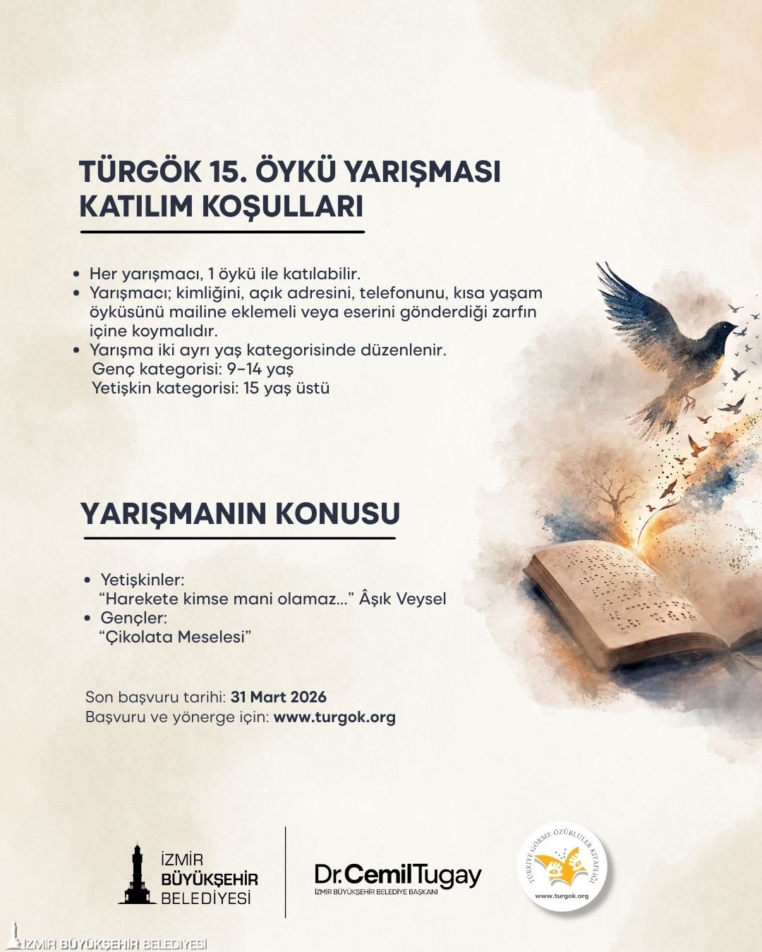 Türkiye Görme Özürlüler Kitaplığı ve İzmir Büyükşehir Belediyesi Engelli Çalışmaları Şube Müdürlüğü tarafından Kütüphane Haftası kapsamında görme engellilere yönelik TÜRGÖK 15. Öykü Yarışması yapılacak. Son başvuru tarihinin 31 Mart olarak belirlendiği yarışmayla ilgili bilgi için www.turgok.org adresi ziyaret edilebiliyor.
