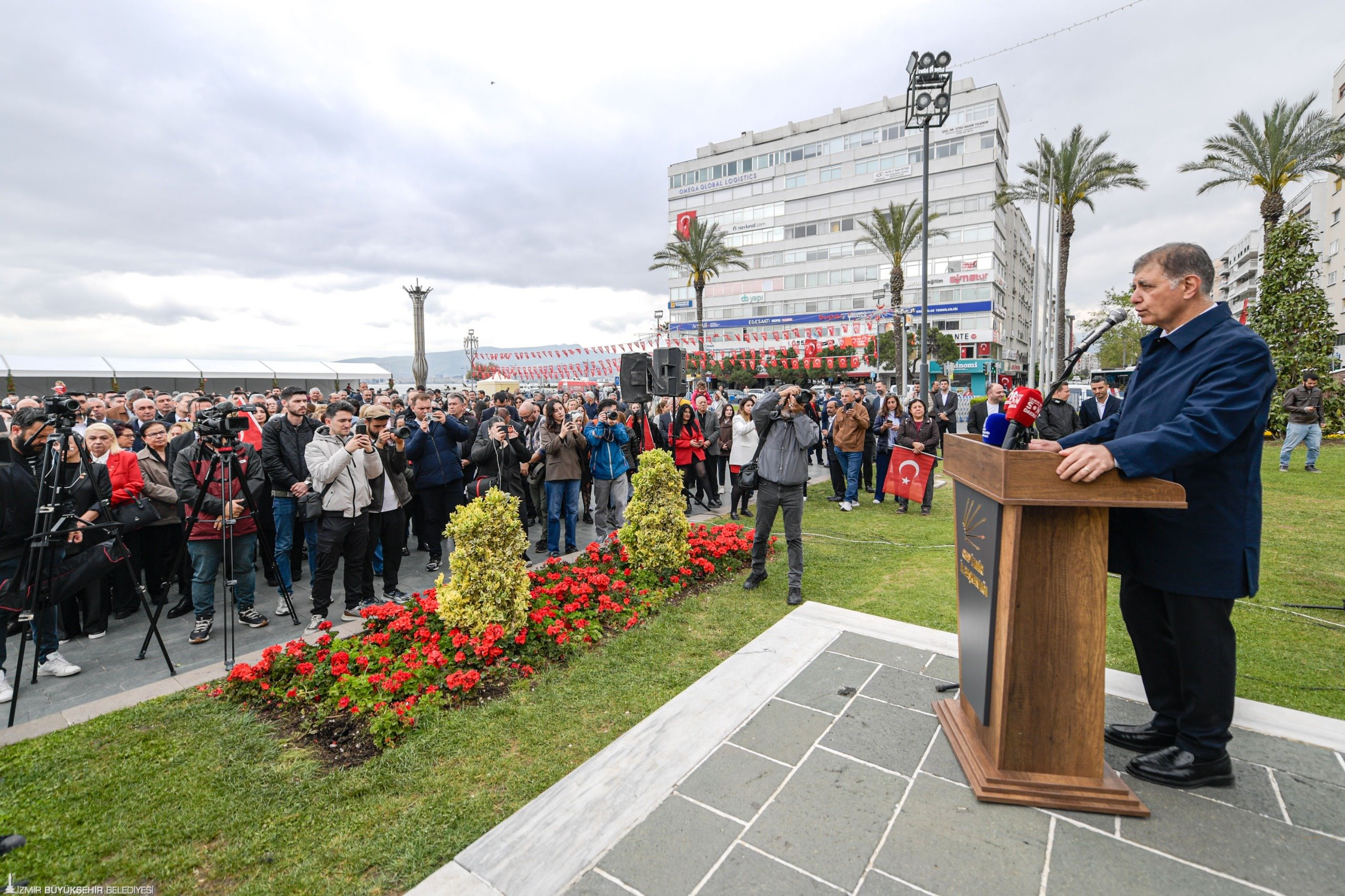 Törende konuşan İzmir Büyükşehir Belediye Başkanı Dr. Cemil Tugay, 23 Nisan’ın, millet iradesini esas alan Türkiye Büyük Millet Meclisi’nin açılışının 106. yılı olduğunu hatırlatarak bayramı coşkuyla kutladıklarını söyledi. Gazi Mustafa Kemal Atatürk’ün bu anlamlı günü çocuklara armağan ettiğini belirten Tugay, bunun hem çocuklara duyduğu sevginin hem de topluma verilen güçlü bir mesajın göstergesi olduğunu ifade etti. Ulusal egemenlik, demokrasi ve hukuk devletinin vazgeçilmez olduğunu vurgulayan Tugay, “Demokrasinin ekmek kadar, su kadar hayati olduğunu biliyoruz ve bundan asla ödün vermeyiz” dedi. Cumhuriyet öncesinde halkın yönetimde söz hakkı olmadığını, ülkenin kapitülasyonlar nedeniyle dışa bağımlı hale geldiğini hatırlatan Tugay, “İnsanlar vatandaş değil, tebaa olarak görülüyordu ve her türlü yanlış uygulama dayatılıyordu. Sonunda işgaller de yaşandı” diye konuştu.