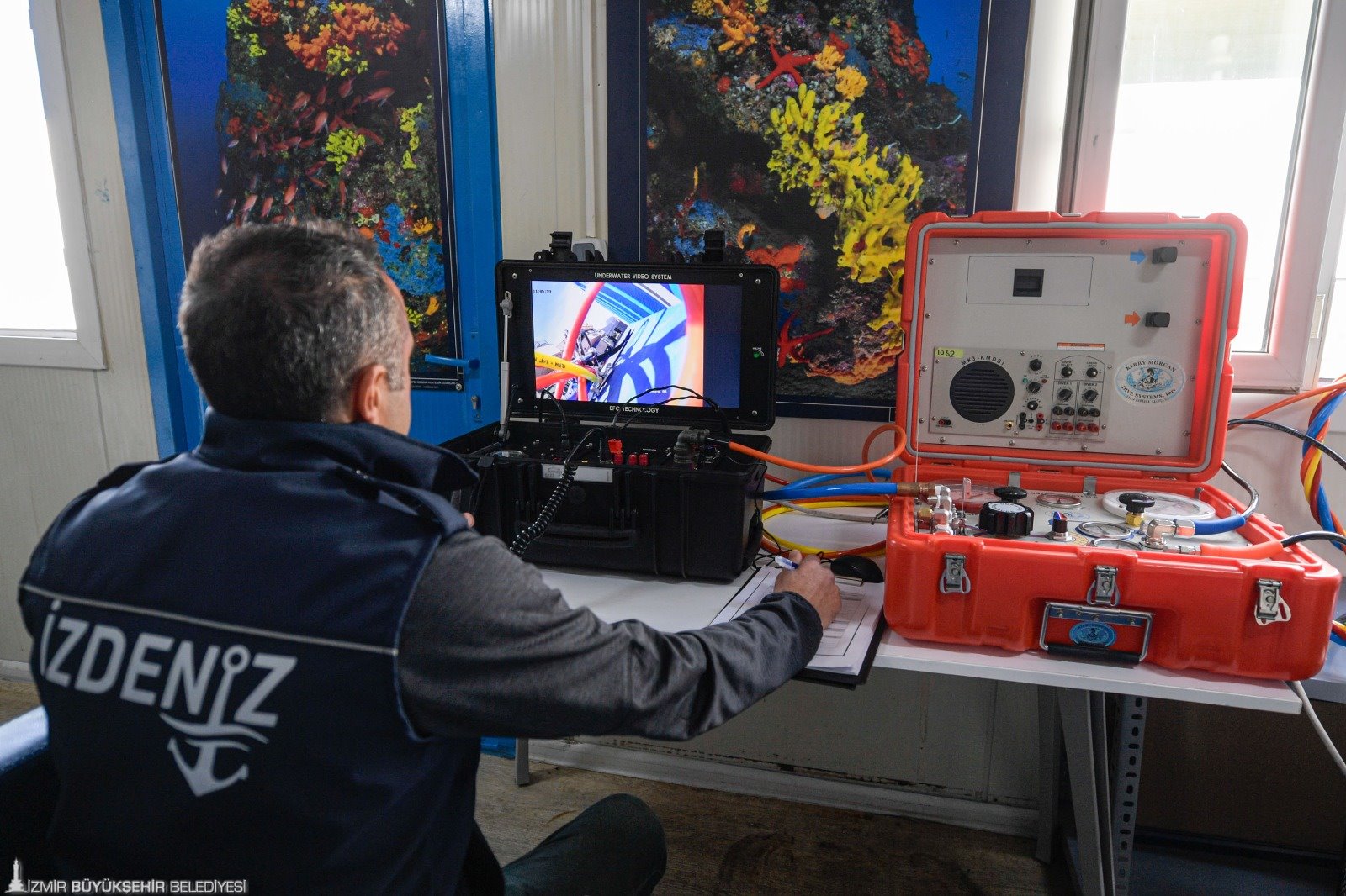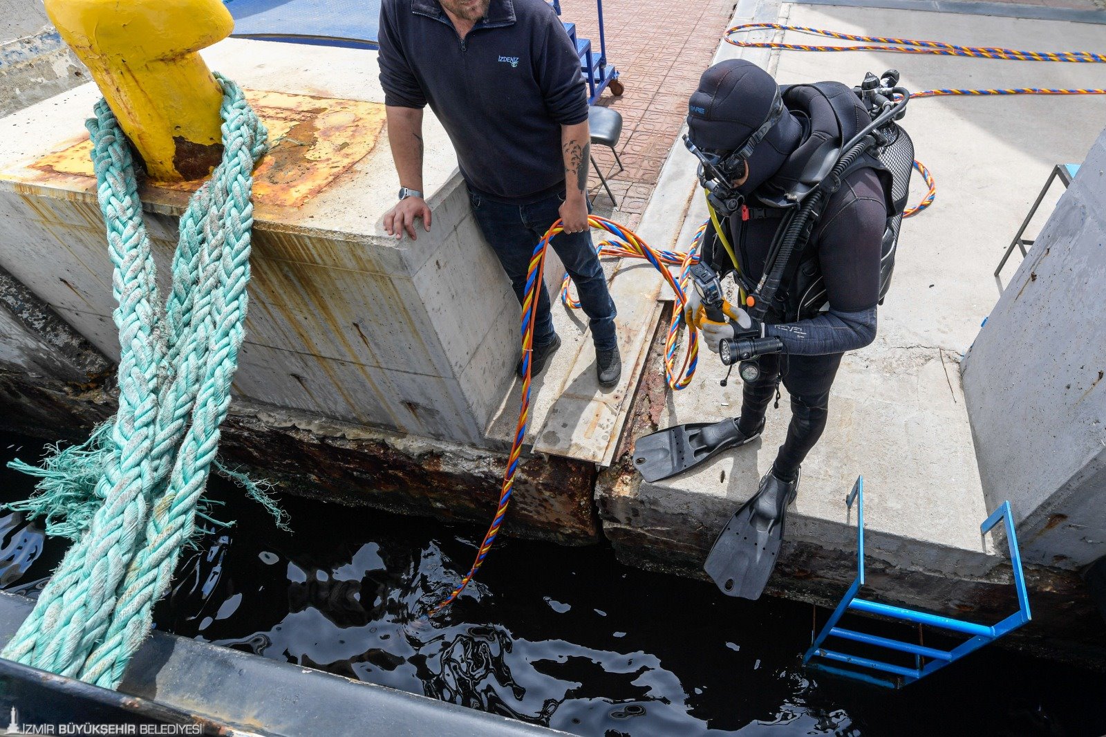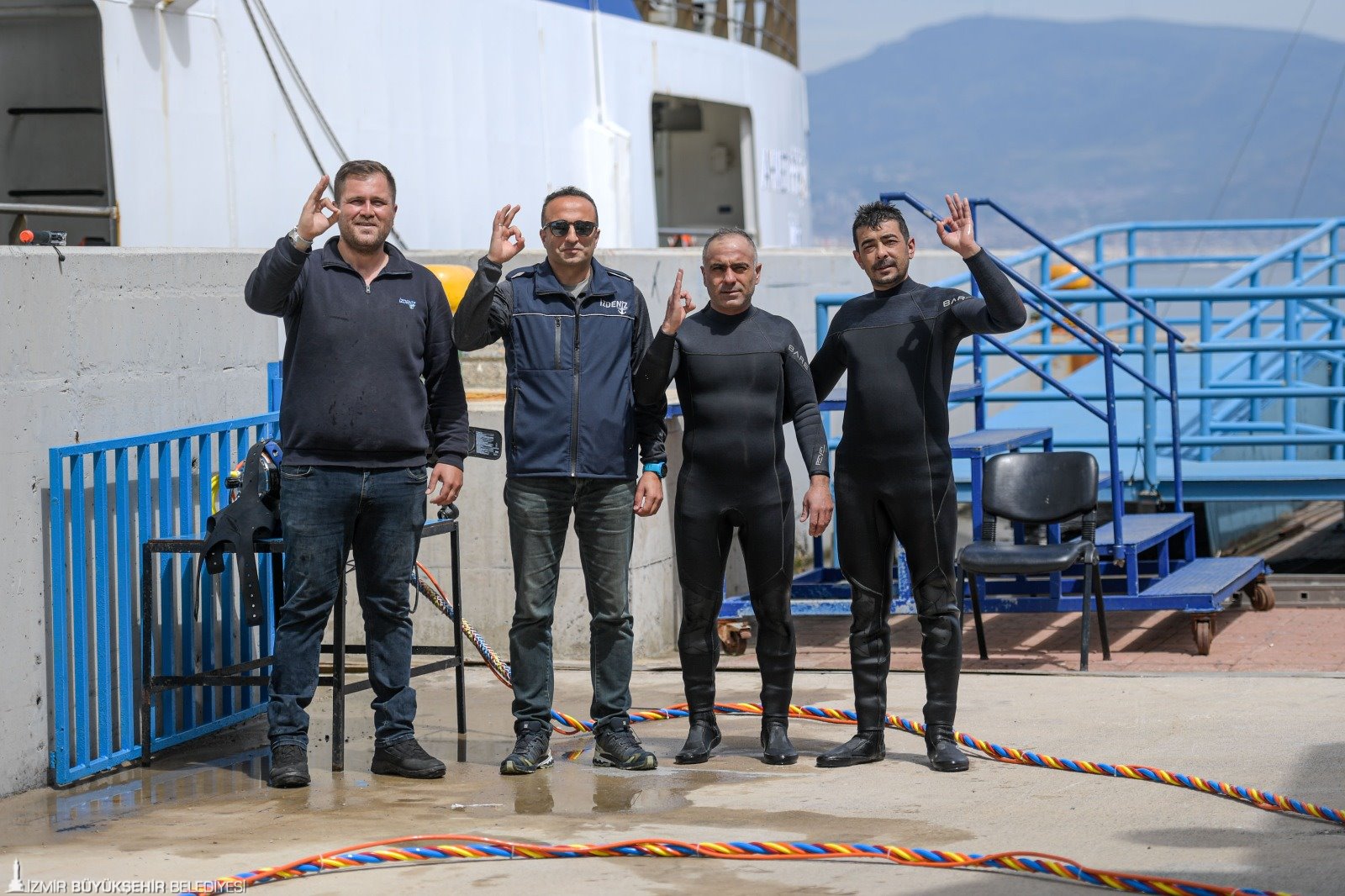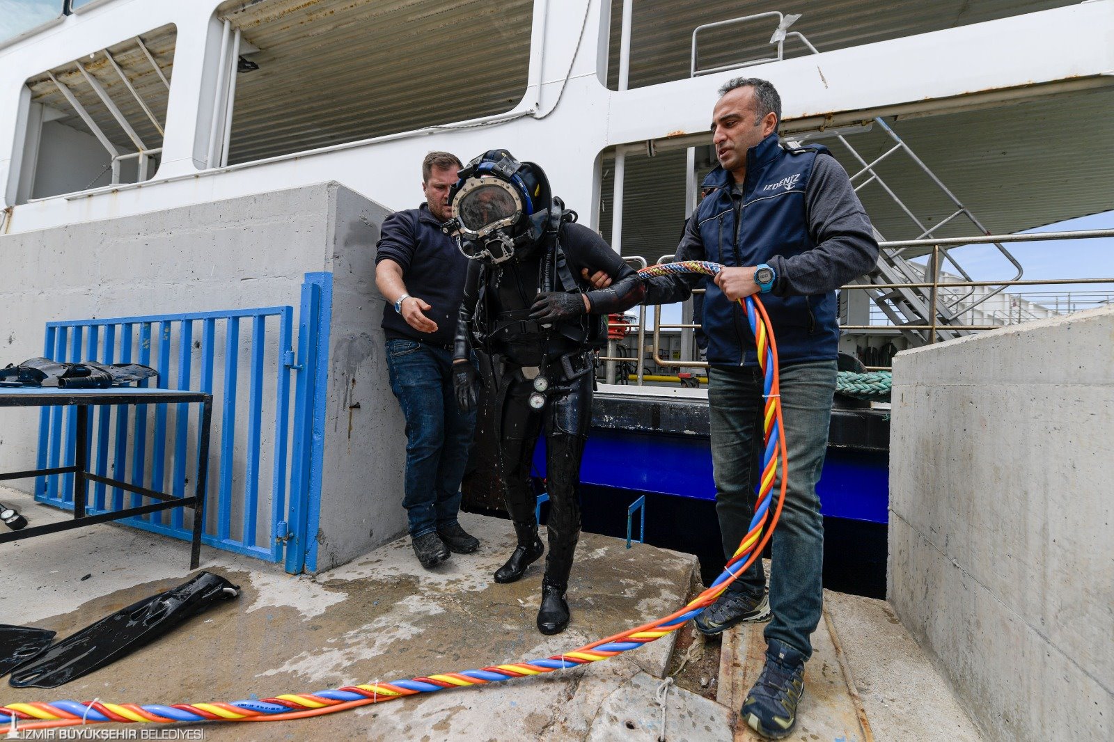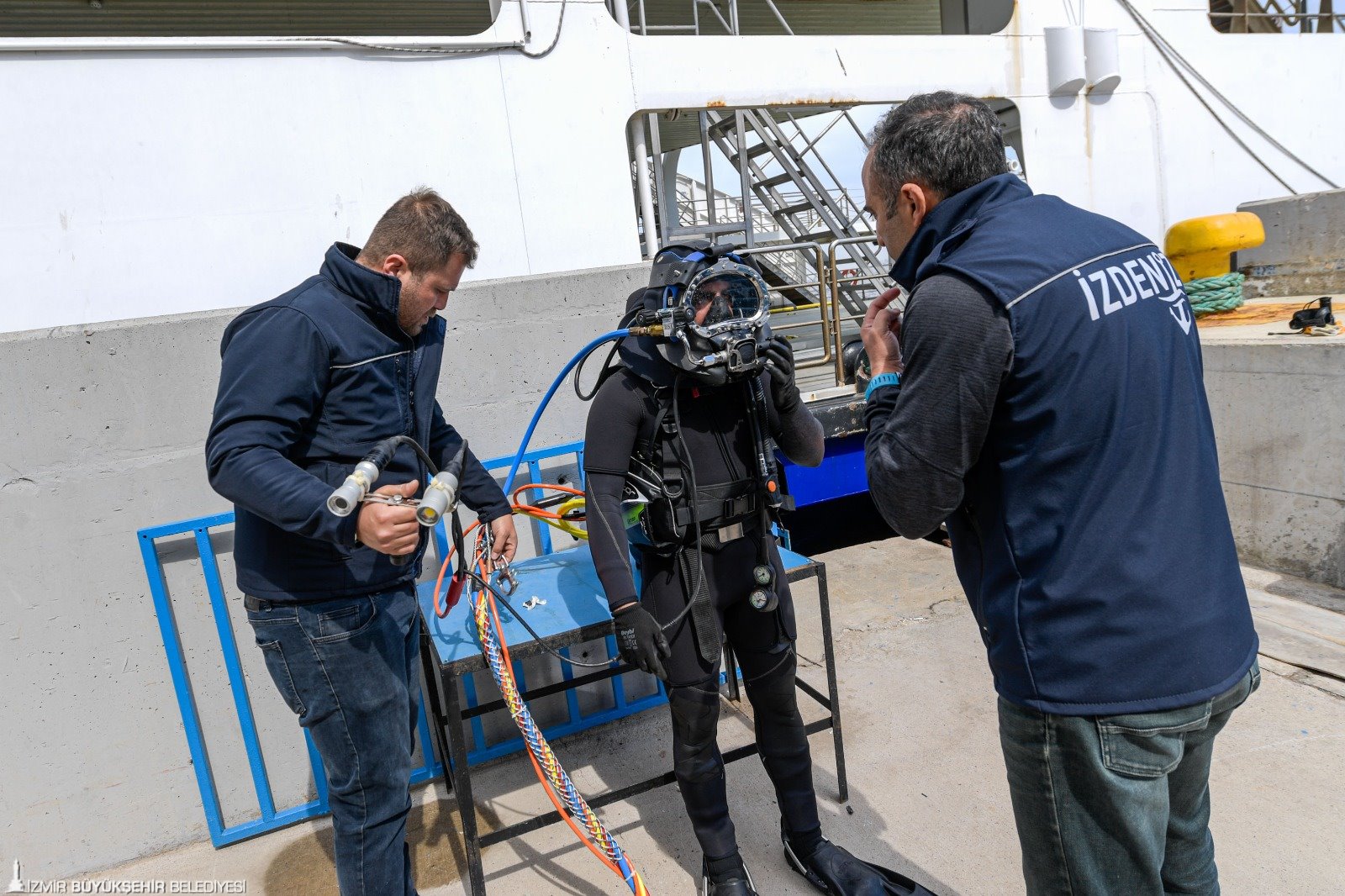İzmir Büyükşehir Belediyesi’nin denizcilik şirketi İZDENİZ AŞ, yolcu gemileri ve feribotlarda yaşanabilecek arızaları hızlı çözmek, acil bakım ve onarım hizmeti sağlamak için dalgıç ekibi kurdu. Balık adam, birinci sınıf dalgıç, aday dalgıç ve dalış amirinden oluşan 4 kişilik ekip, İzmir Marina ve İZDENİZ’e ait iskelelerde görev alıyor, sık sık kontrol dalışı da yapıyor. Gemilerin sefere çıkmaya elverişli olup olmadığını da tespit eden (survey) İZDENİZ dalış ekibi, ihtiyaç duyulması halinde İzmir Büyükşehir Belediyesi’nin birimlerine su altı çalışmalarında destek veriyor. Ekibin önümüzdeki süreçte marina bulunan ilçelerde görev alması ve sportif dalış eğitimleri vermesi de planlanıyor.