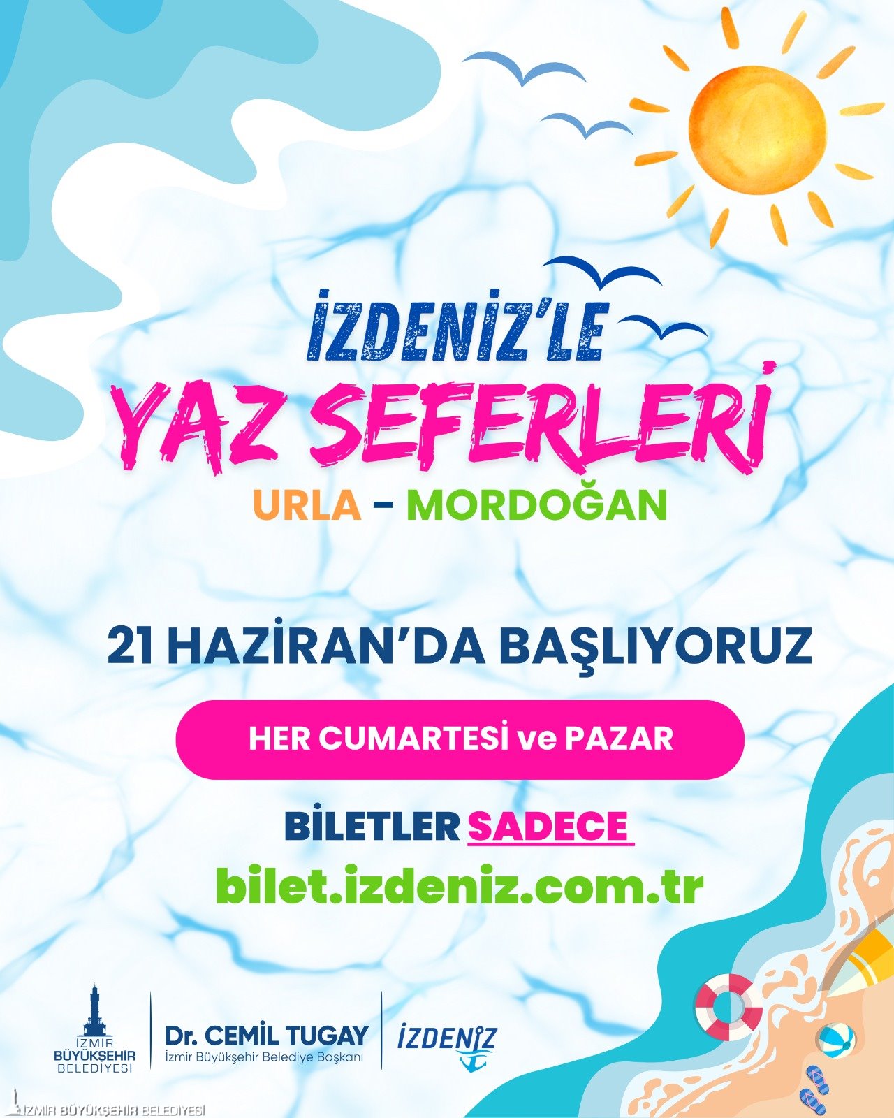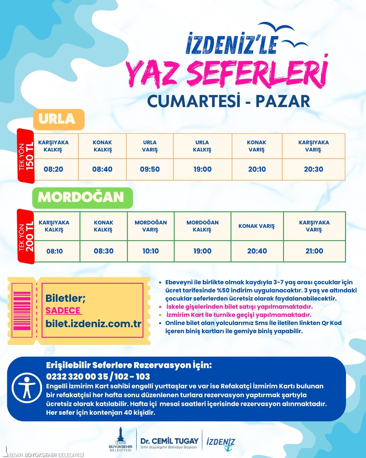 İzmir Büyükşehir Belediyesi’nin deniz ulaşımı şirketi İZDENİZ AŞ’nin kentin sayfiye yerlerine düzenlediği günübirlik “Yaz Seferleri” 21 Haziran’da başlıyor. Seferler Mordoğan ve Urla’ya, cumartesi ve pazar günleri olacak. Ayrıca resmi tatillerde de seferler düzenlenecek. Hava ve deniz müsaadeli yapılacak yaz seferleri 22 Eylül’e kadar devam edecek. Biletler sadece online olarak bilet.izdeniz.com.tr adresinden satın alınabilecek. İskeleden bilet satışı yapılmayacak. İzmirimkart ile de turnikeden geçiş olmayacak. Online bilet alan yolcular, kısa mesaj ile kendilerine iletilen linkten QR kod içeren biniş kartlarıyla gemiye binebilecek. Ebeveyni ile birlikte olmak kaydıyla 3-7 yaş arası çocuklar için ücret tarifesinde yüzde 50 indirim uygulanacak. 3 yaş ve altındaki çocuklar seferlerden ücretsiz olarak faydalanabilecek.