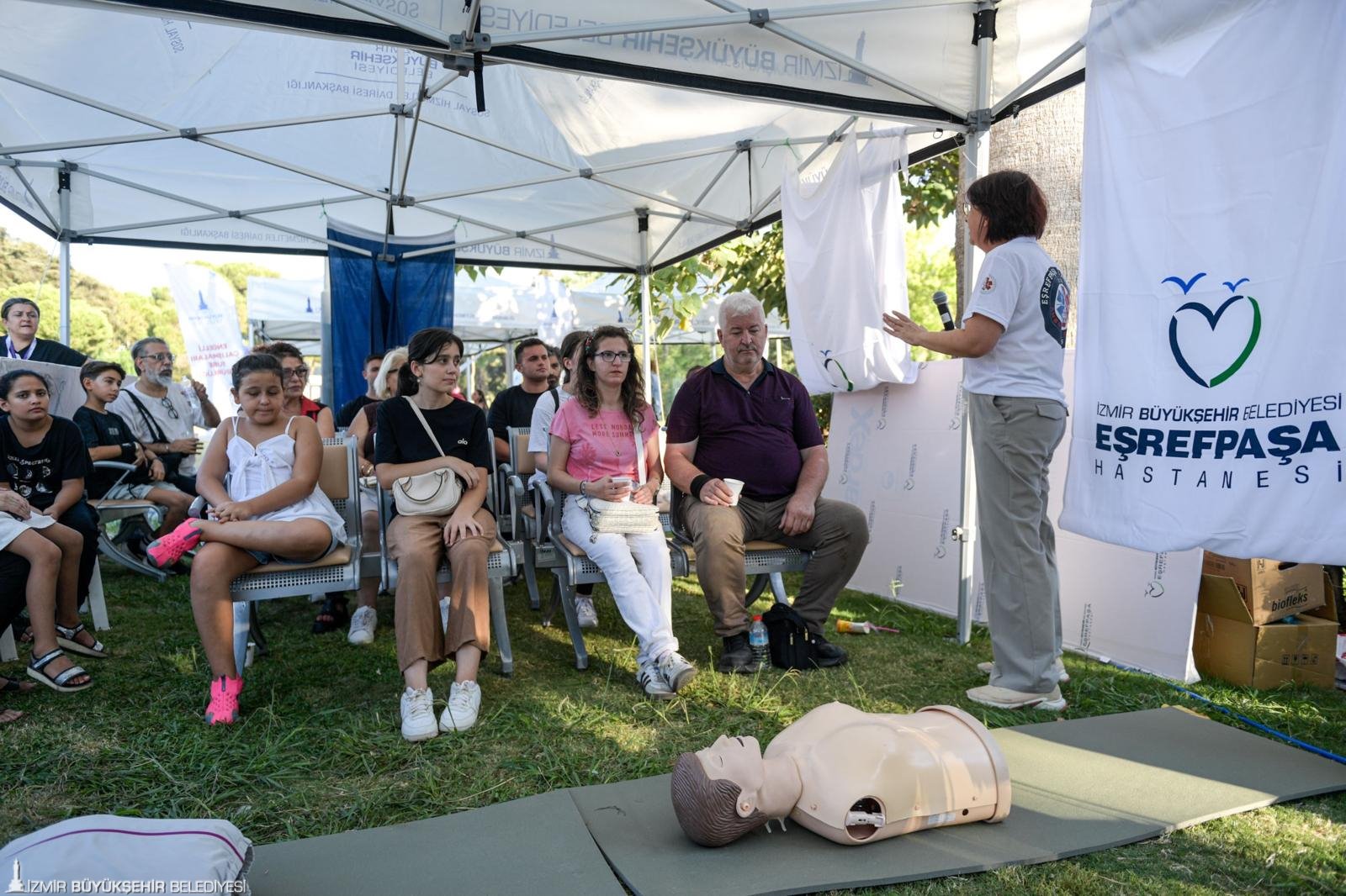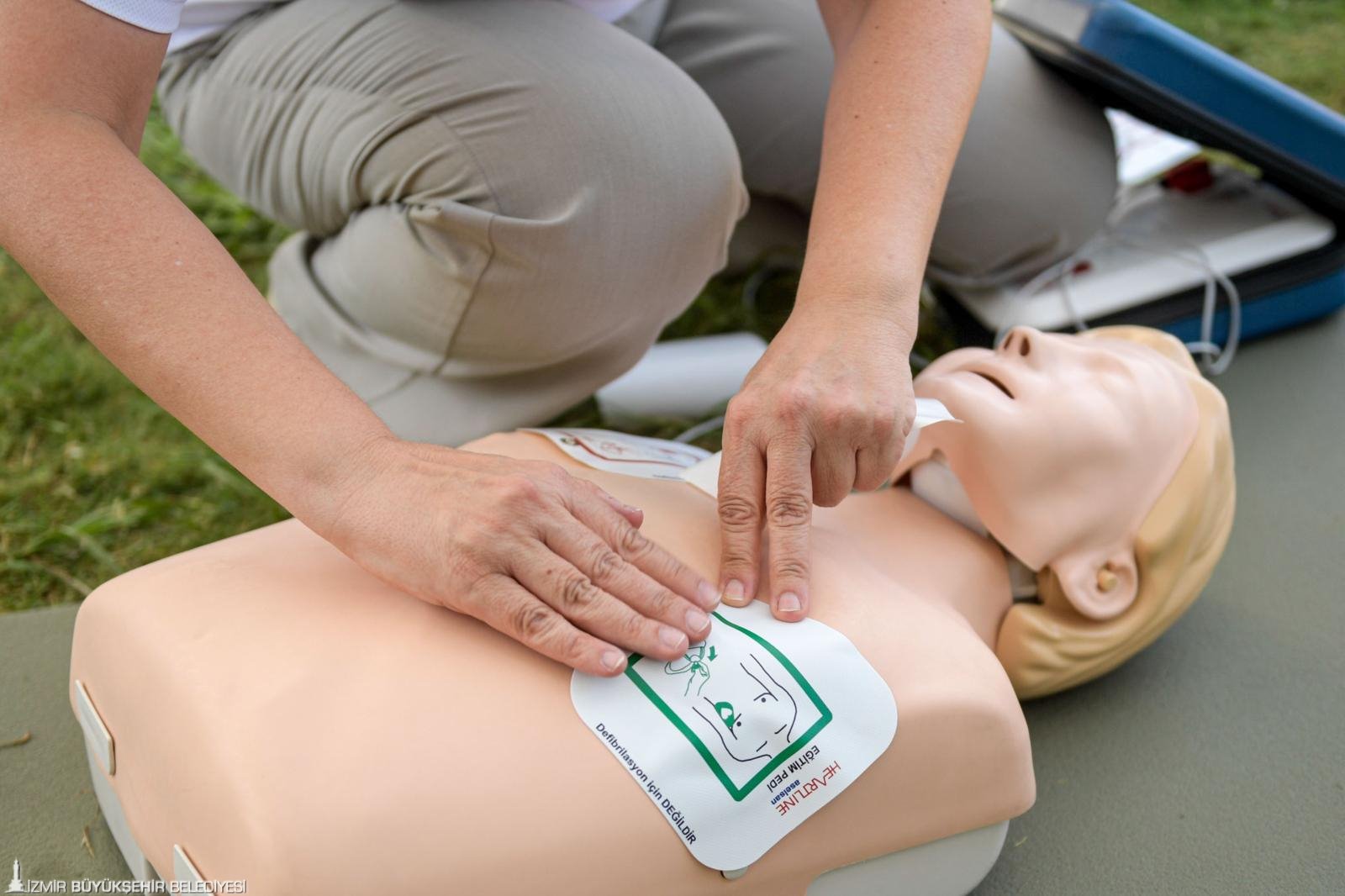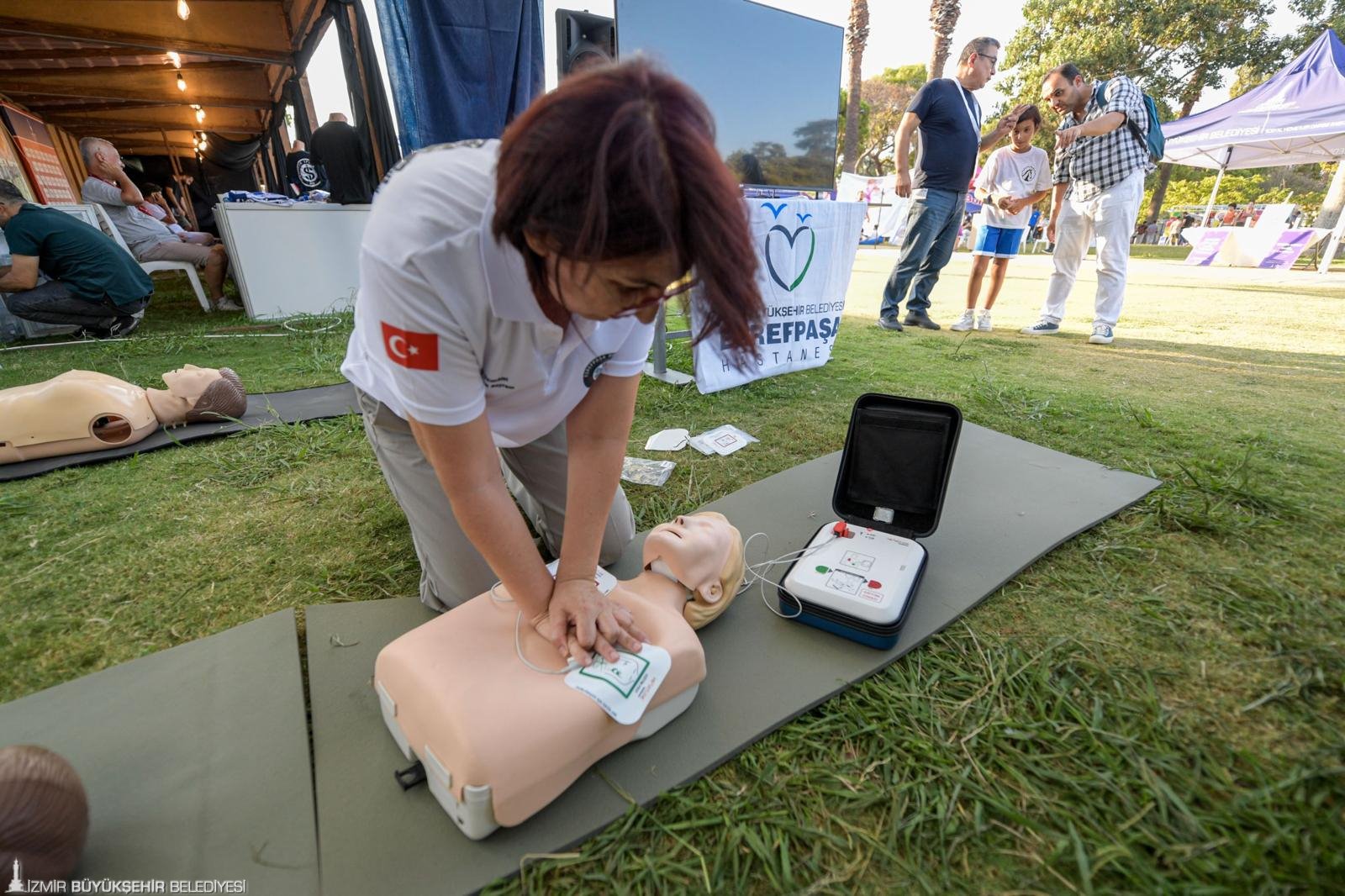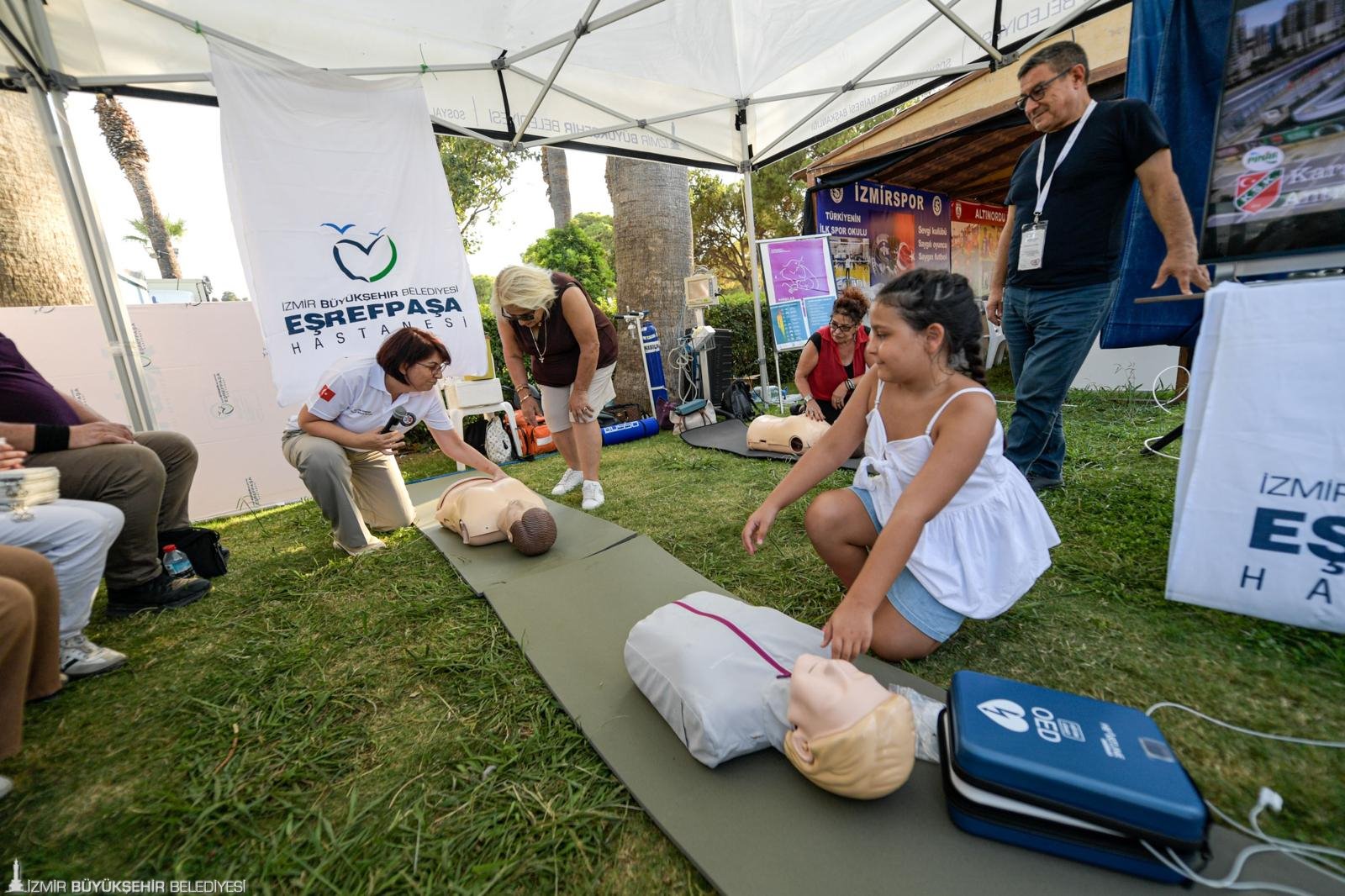 94. İzmir Enternasyonal Fuarı’nda yerini alan Türkiye’nin ilk ve tek belediye hastanesi İzmir Büyükşehir Belediyesi Eşrefpaşa Hastanesi, fuar ziyaretçilerine ilkyardım eğitimleri verdi. Hastane dışında gerçekleşen ani kalp durması vakalarında hayati önem taşıyan kalp masajı uygulaması, 90 saniye gibi kısa bir sürede stant ziyaretçilerine uzman hekimler ve hemşireler tarafından uygulamalı olarak anlatıldı. Aynı zamanda Acil Tıp Uzmanı olan Eşrefpaşa Hastanesi Başhekimi Doç. Dr. Başak Bayram, İzmir Büyükşehir Belediyesi tarafından şehrin farklı noktalarına yerleştirilmesi planlanan otomatik elektroşok cihazını da tanıttı. İlk müdahale sırasında başarı oranını artıracak cihaz, ani kalp durma vakalarında vatandaşlar tarafından sesli komut desteği sayesinde rahatlıkla kullanılabilecek.