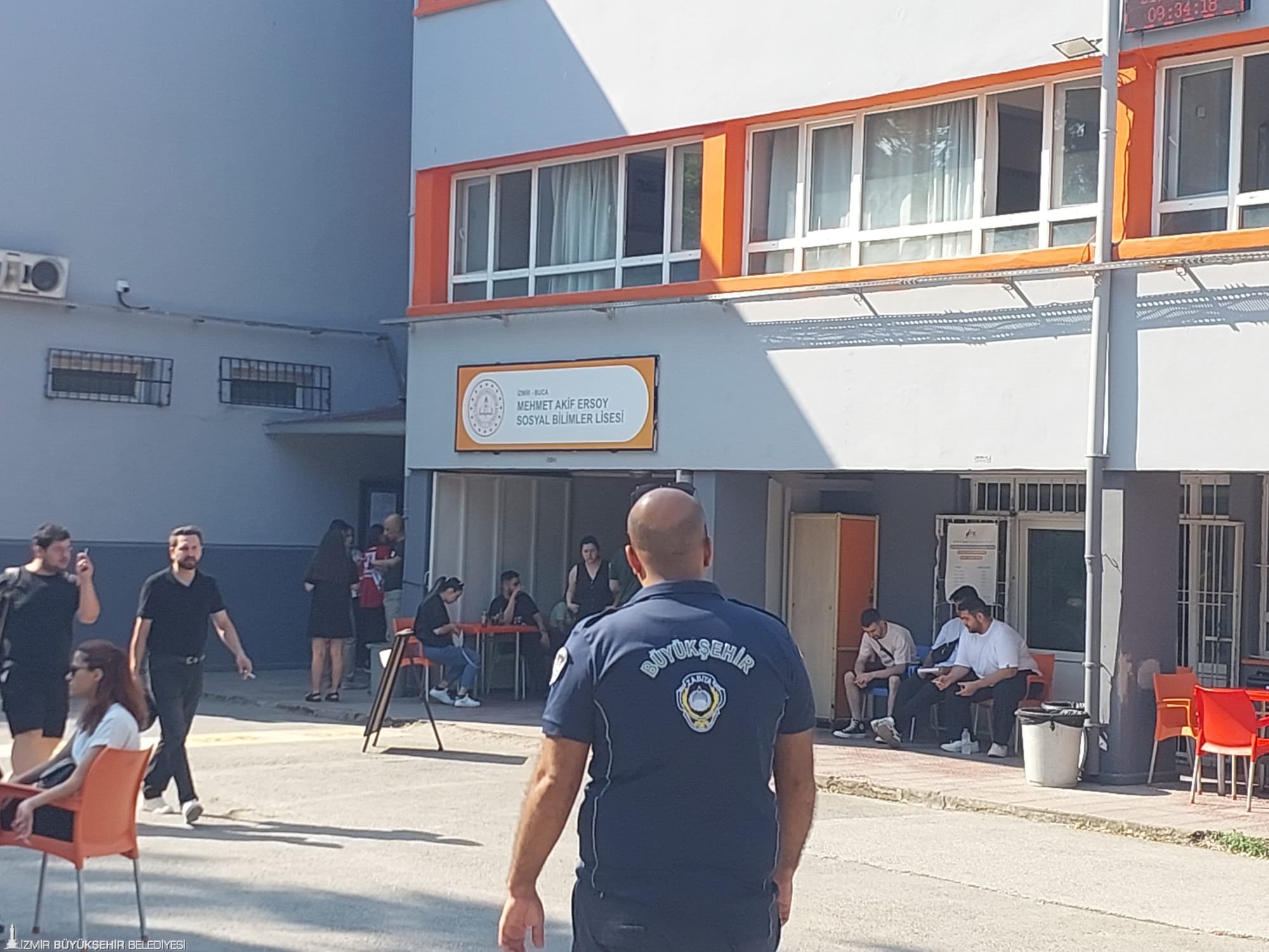 İzmir Büyükşehir Belediyesi Zabıta Dairesi Başkanlığı ekipleri YKS’nin ilk oturumu olan Temel Yeterlilik Testi’ne (TYT) katılan öğrencilerin sınava girdiği okul çevrelerinde önlem aldı. Sürücülerden okul önlerinden geçerken korna çalmamasını isteyen ekipler, gürültü yapılmasını önledi. Sınav yerlerine geç kalan kimi adayların da imdadına yetişti. Öğrencileri sınava girecek okullara yetiştiren zabıta personeli, yine sınava girecek okulu arayan adayların da yardımına koştu. Ekipler, sınav süresince okul çevrelerindeki denetimlerini sürdürecek.