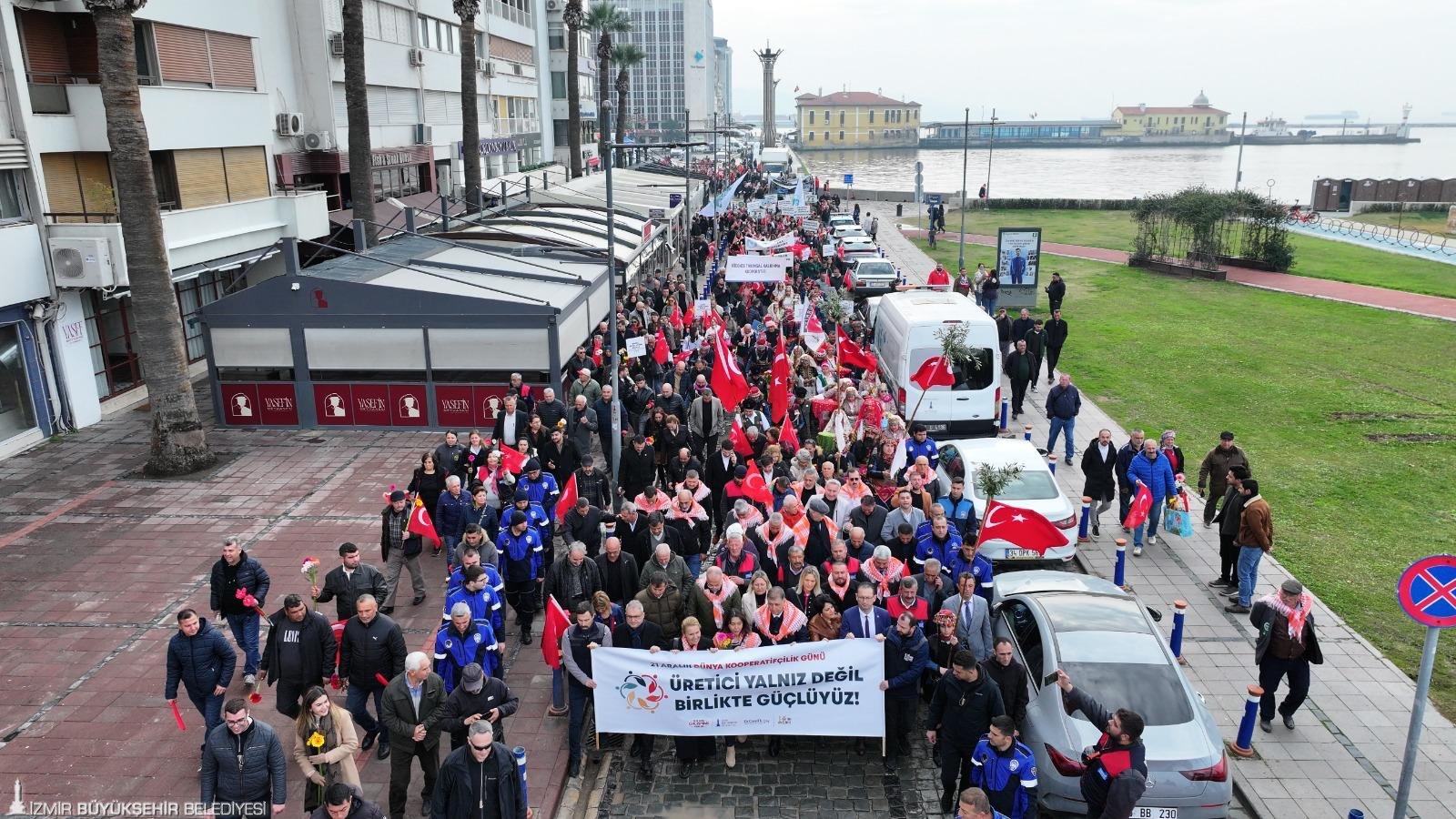 İzmir Büyükşehir Belediyesi, Türkiye’nin zorlu ekonomik koşullarında yaşam mücadelesi veren çiftçileri, 21 Aralık Dünya Kooperatifçilik Günü’nde İzmir’de buluşturdu. Birleşmiş Milletler Genel Kurulu tarafından 2025 yılının “Uluslararası Kooperatifler Yılı” ilan edilmesi nedeniyle “Kooperatifler Daha İyi Bir Dünya Kurar” temasıyla düzenlenen etkinlikler kapsamında, İzmir’in dört bir yanından kooperatif üyeleri Cumhuriyet Meydanı’nda toplandı. İzmir Büyükşehir Belediye Başkanı Dr. Cemil Tugay’ın ev sahipliğindeki etkinliğe Tire Belediye Başkanı Hayati Okuroğlu, Beydağ Belediye Başkanı Şakir Başaran, Gaziemir Belediye Başkanı Ünal Işık, Ödemiş Bademli Fidancılık Tarımsal Kalkınma Kooperatifi Başkanı Hurşit Nallı, Simurg Kadın Kooperatifi Başkanı Sibel Uyar başta olmak üzere kentin her bölgesinden kooperatif başkanları, siyasi parti temsilcileri, üreticiler, muhtarlar ve vatandaşlar katıldı. Halk oyunları gösterilerinin de yapıldığı meydanda tüm vatandaşlar Harmandalı oynadı. Kutlamaların ardından kortej İzmir Büyükşehir Belediyesi Bandosu ve traktörler eşliğinde Vasıf Çınar Bulvarı’nı geçerek Lozan Kapısı’ndan Kültürpark’a ulaştı. Traktörlerin kornalarına çevreden vatandaşlar da destek verdi. Başkan Tugay ve katılımcılar Kültürpark’ta bugüne özel kurulan üretici pazarını gezdi.