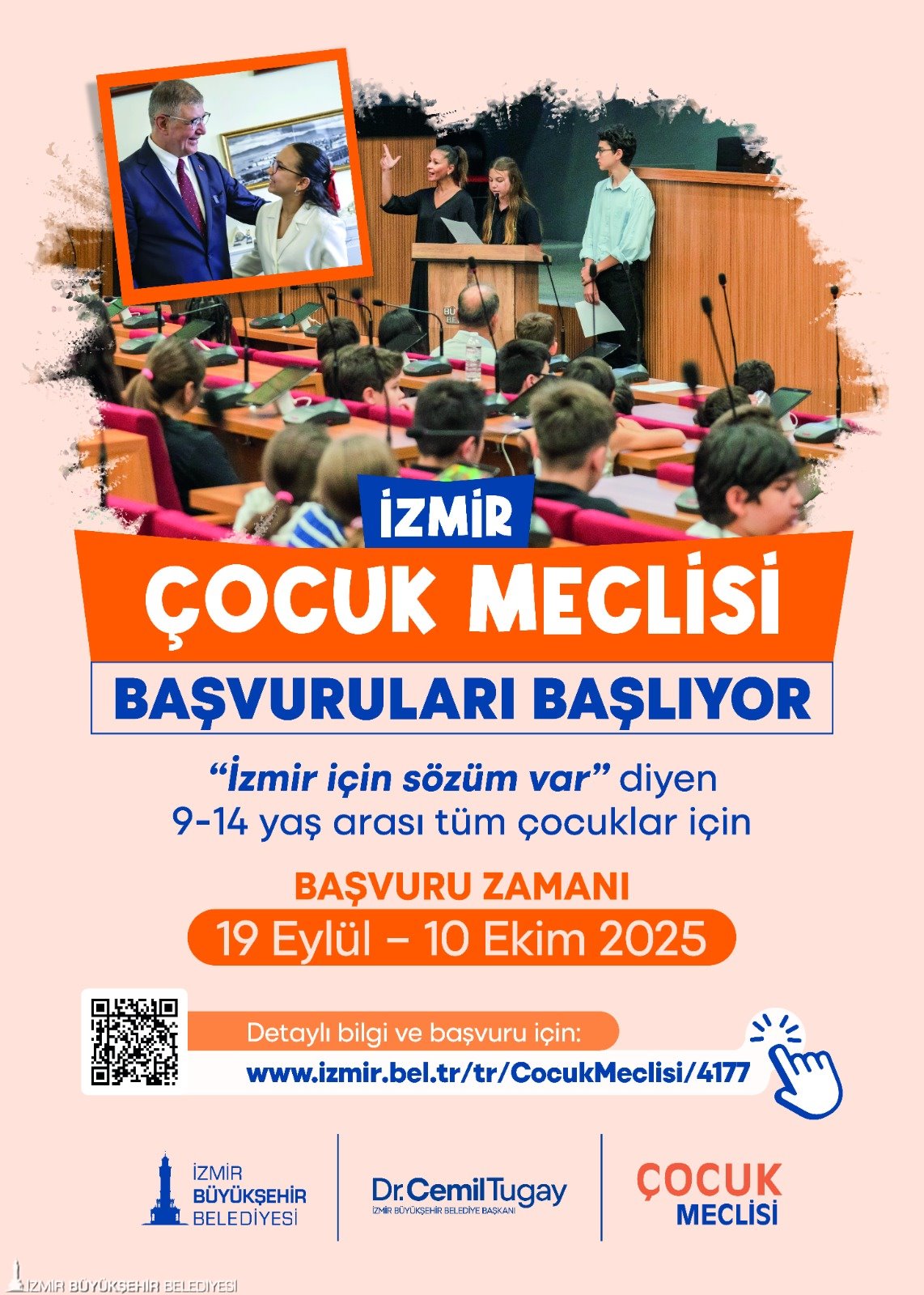 İzmir Büyükşehir Belediyesi Kadın ve Aile Hizmetleri Dairesi Başkanlığı Çocuk Çalışmaları Şube Müdürlüğü tarafından sürdürülen çalışmalar kapsamında, İzmir Çocuk Meclisi’nin yeni dönem başvuruları 19 Eylül’de başlıyor. İzmir’de yaşayan 9-14 yaş arası tüm çocuklar, 19 Eylül - 10 Ekim tarihleri arasında, https://www.izmir.bel.tr/ ve https://www.bizizmir.com/ internet sitelerinde yer alan başvuru formunu doldurarak veya kentin çeşitli noktalarında yer alan duyuru afişlerindeki QR kodu okutarak başvurularını yapabilecek. İnternet erişimi olmayan çocuklar İzmir’in çeşitli noktalarında faaliyet gösteren İzmir Çocuk Merkezlerinden başvuru ekranına erişebilecek.