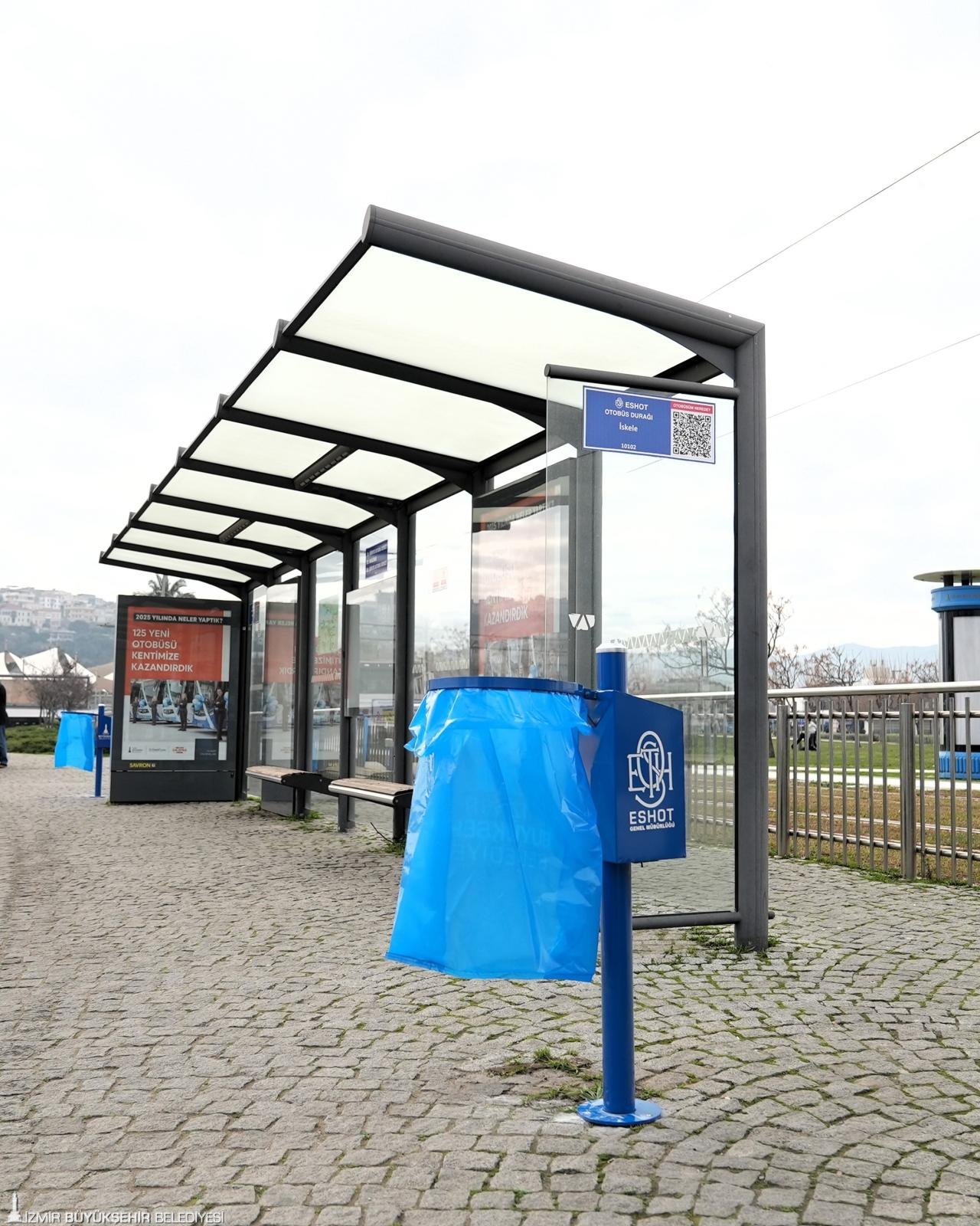 ESHOT Genel Müdürlüğü tarafından otobüs duraklarında kullanılacak yeni çöp kovalarının tasarımı tamamlandı, montaj çalışmalarına başlandı. Kentlilerin en yoğun kullandığı alanlardan biri olan otobüs duraklarında daha düzenli, temiz ve estetik bir ortam oluşturmayı amaçlayan çalışma kapsamında, İzmir genelinde 3 bin 150 adet çöp kovasının üretimi ve montajı planlanıyor. Pratik kullanım ve kolay bakım esas alınarak tasarlanan pota tipi çöp kovalarında, çöp poşetleri rahatlıkla değiştirilebiliyor. Çöp kovalarında sigara izmaritleri için ayrı bir bölüm, diğer atıklar için ise ayrı bir alan bulunuyor. Mavi-beyaz renklerde tasarlanan çöp kovaları, ESHOT’un nazar boncuklu otobüsleriyle görsel bir bütünlük oluşturuyor. Böylece durak çevrelerinde hem işlevsel hem de kent kimliğiyle uyumlu bir görünüm hedefleniyor.
