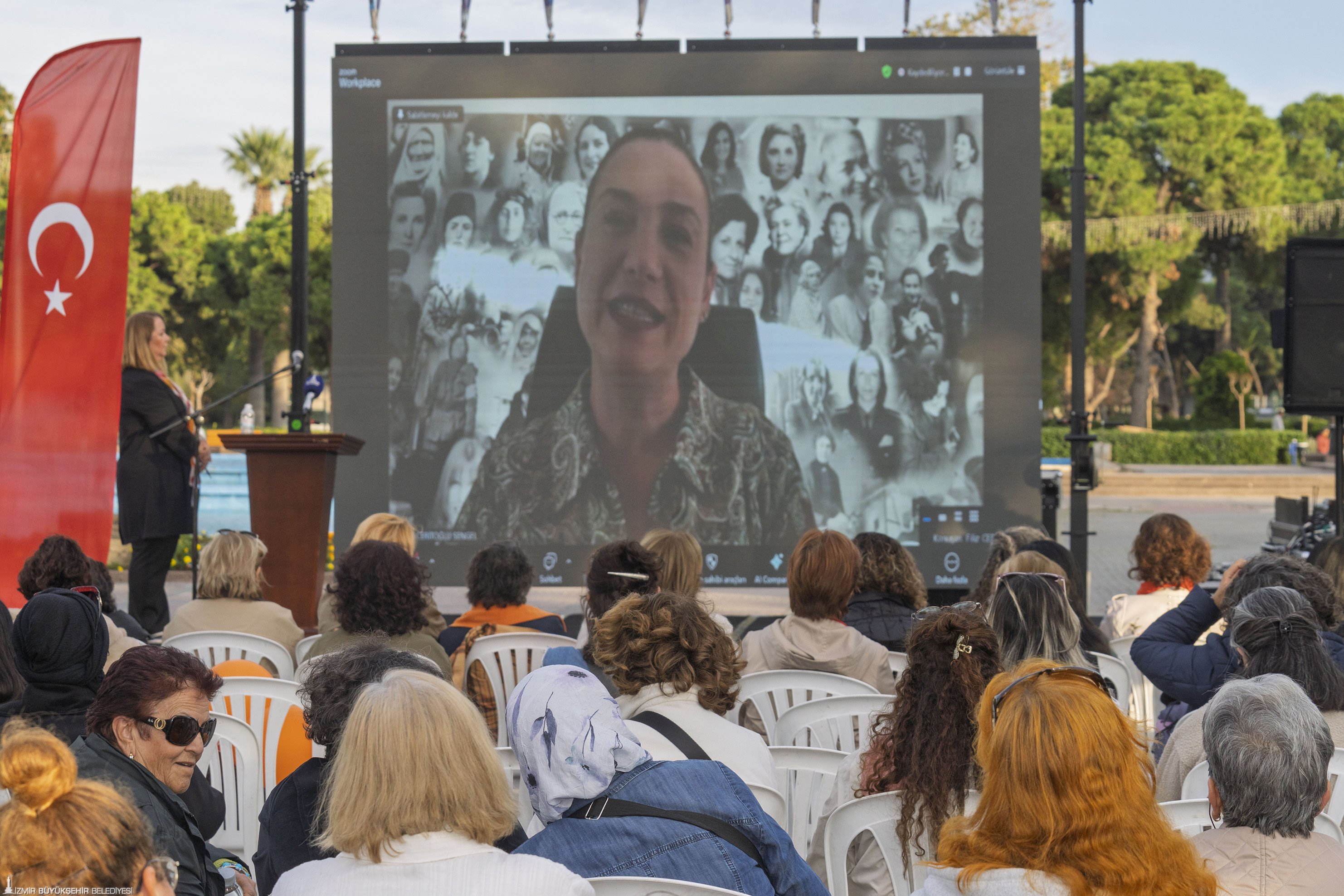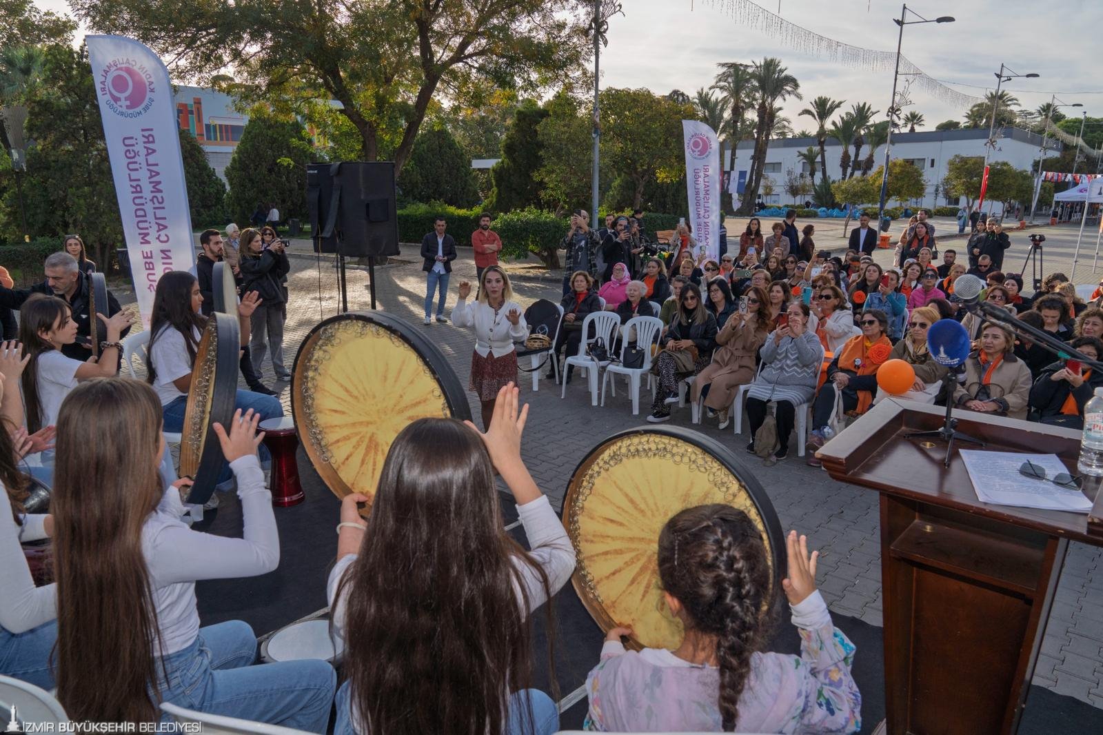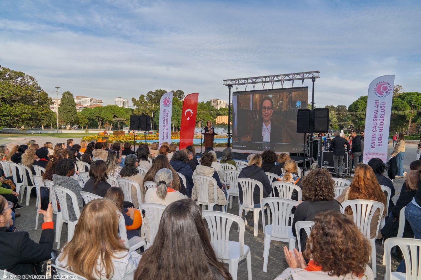 25 Kasım Kadına Yönelik Şiddete Karşı Uluslararası Mücadele Günü’nde, İzmir’in farklı noktalarında çok sayıda etkinlik düzenlendi. İzmir Büyükşehir Belediyesi Kadın Çalışmaları Şube Müdürlüğü organizasyonunda gerçekleştirilen etkinlikler arasında “Eşit İzmir Eşit Dünya” temalı uluslararası video konferans programı da yer aldı. Kültürpark’ta düzenlenen etkinliğe kadın alanında uzman isimler, işçiler, gazeteciler, akademisyenler, sanatçılar, aktivistler, siyasetçiler gibi farklı alanlardan katılımcılar canlı olarak bağlandı. Kadınlar, şiddete karşı mesajlarını alanda toplanan kadınlara iletti. Her konuşma, kampanya sloganı “Buradayım, iyiyim” cümlesi ile tamamlandı. Alanda bulunan kadınlar da “Buradayım, iyiyim” sloganları attı. Etkinlikte, Çocuk Çalışmaları Şube Müdürlüğü Yenişehir Çocuk Merkezi’nden hizmet alan çocuklar, ritim gösterisi de sundu.