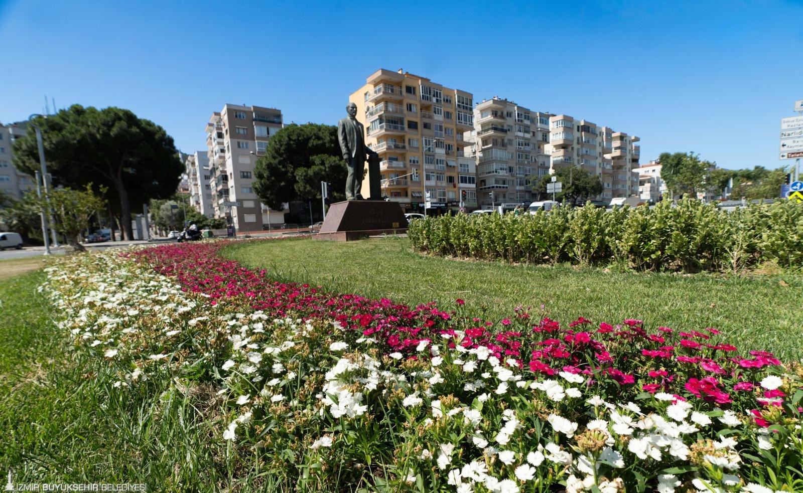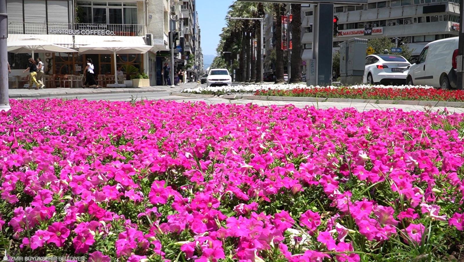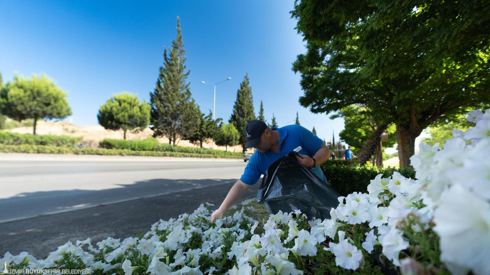 İzmir Büyükşehir Belediyesi şehrin yol kenarlarını, meydanlarını, yeşil alanlarını renk renk çiçeklerle güzelleştirmeye devam ediyor. İzmir Büyükşehir Belediyesi Park ve Bahçeler Dairesi Başkanlığı, sıcaklıkların artmasıyla beraber peyzaj çalışmalarında yazlık döneme geçti. Şehrin temiz ve estetik bir görünüme kavuşması için sahada çalışma yürüten ekipler, bir yandan yeni çiçek ekimleri yaparken bir yandan da yeşil alanların bakımlarını sürdürüyor.