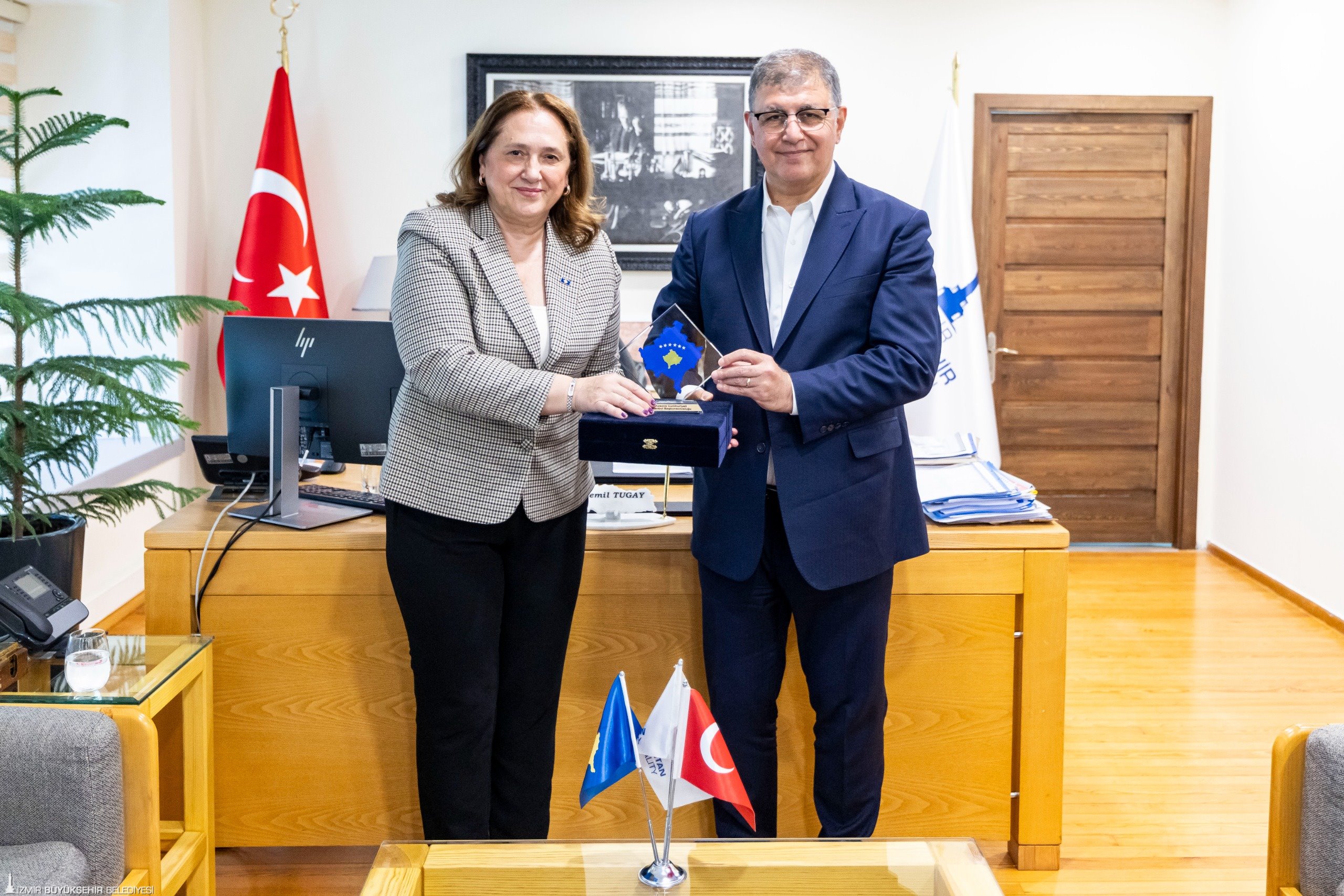 İzmir Büyükşehir Belediye Başkanı Dr. Cemil Tugay, yabancı konuklarını ağırlamaya devam ediyor. Kosova Cumhuriyeti İstanbul Başkonsolosu Suzan Novoberdaliu, Kosova Cumhuriyeti İzmir Fahri Konsolosu Muharrem Toprak ve Kosova Rumeli Derneği Başkanı Uğur Şengöz Başkan Tugay’ı makamında ziyaret etti. Ziyarette İZFAŞ Genel Müdürü Tuğçe Cumalıoğlu ile İzmir Büyükşehir Belediyesi bürokratları da yer aldı. Görüşmede Kosova Cumhuriyeti ve İzmir arasındaki ticari olmak üzere birçok alanda yapılabilecek iş birlikleri ve bu yıl 94. kez düzenlenecek İzmir Enternasyonal Fuarı (İEF) gündeme geldi.