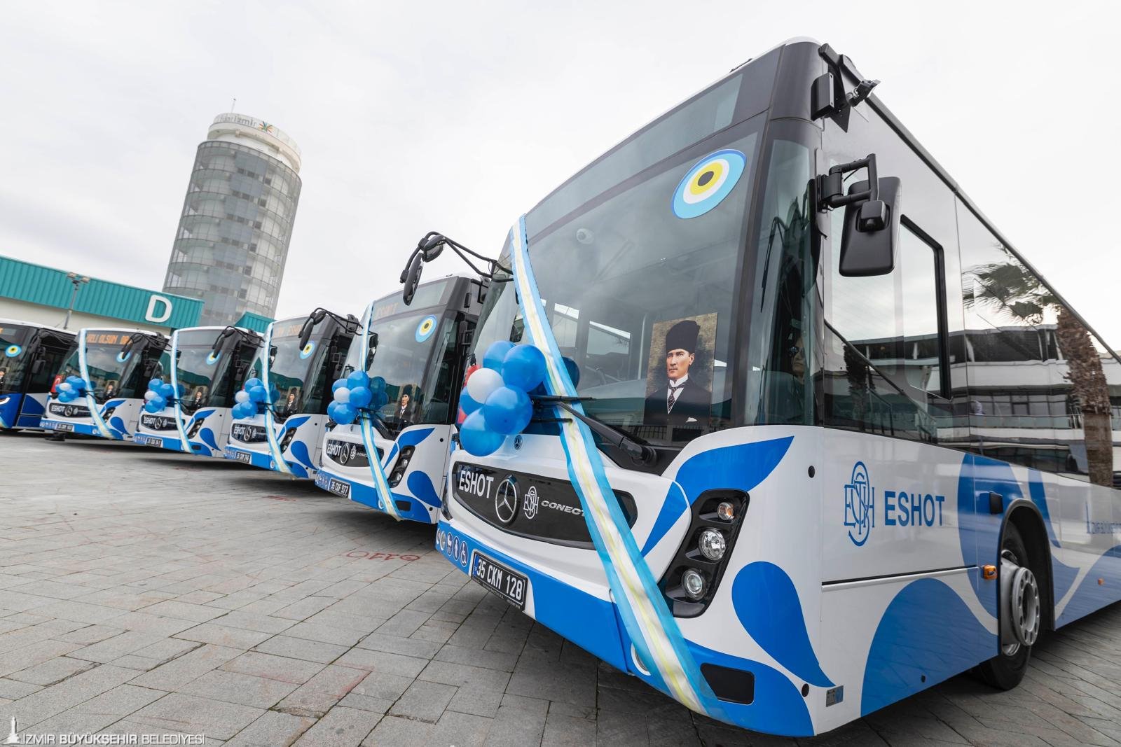 İzmir Büyükşehir Belediyesi, toplu ulaşım filosunu güçlendirmeye devam ediyor. Vatandaşların konforlu, güvenli ve rahat yolculuğu için çalışan İzmir Büyükşehir Belediyesi, ESHOT Genel Müdürlüğü bünyesine 41 yeni otobüs daha ekledi. Filoya kazandırılan yeni araçlar, İzmir Büyükşehir Belediyesi’nin kurumsal rengi olan aynı zamanda İzmir’in denizini ve gökyüzünü simgeleyen mavi renkte tasarlandı. Yeni otobüslere İzmirliler için şans ve güveni simgelemesi için “nazar boncuğu otobüsleri” adı verildi. Fuar İzmir Havuzlu Meydan’da gerçekleştirilen törene İzmir Büyükşehir Belediye Başkanı Dr. Cemil Tugay, İzmir Büyükşehir Belediyesi Başkan Vekili Dr. Zafer Levent Yıldır, ESHOT Genel Müdürü Övünç Özgen, ilçe belediye başkanları, İzmir Büyükşehir Belediyesi ve ESHOT Genel Müdürlüğü bürokratları, siyasi parti temsilcileri, muhtarlar ve meclis üyeleri katıldı. Isuzu Satış Direktörü Yusuf Teoman ve Satış Müdürü Murat Küçük ile Mercedes-Benz Türk AŞ Otobüs Kamu Satış Müdürü Selim Eyüboğlu Başkan Tugay'a plaket takdim etti. ESHOT Genel Müdürü Övünç Özgen de sembolik olarak nazar boncuğu şeklinde tasarlanan otobüs anahtarını Başkan Dr. Cemil Tugay'a teslim etti.