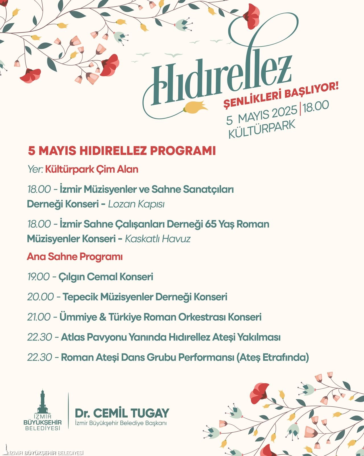 Hıdrellez etkinlikleri, 5 Mayıs’ta Kültürpark çim alanda olacak. Etkinlik kapsamında 18.00’de İzmir Müzisyenler ve Sahne Sanatçıları Derneği, Lozan Kapısı bölümünde konser verecek. Kaskatlı Havuz’da ise İzmir Sahne Çalışanları Derneği 65 Yaş Roman Müzisyenler Konseri yine 18.00’de başlayacak. Ana Sahne’de ise 19.00’da Çılgın Cemal, 20.00’de Tepecik Müzisyenler Derneği konseri var. 21.00’de Ümmiye & Türkiye Roman Orkestrası konseri eğlenceyi doruğa taşıyacak. 22.30’da ise ateş etrafında Roman Ateşi Dans Grubu’nun performansı olacak.