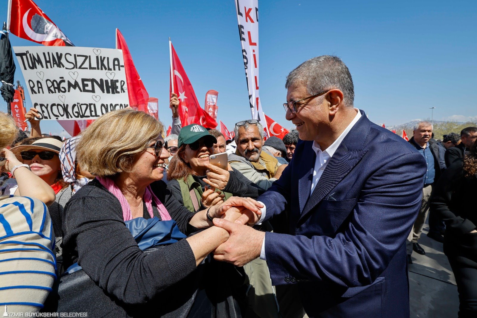 CHP’nin 19 Mayıs’ta İzmir’de düzenleyeceği miting hakkında da konuşan Başkan Tugay, herkese çağrıda bulundu. Tugay, “İzmir’in kendi duygusunu gösterdiği bir miting olacak. İzmir dışından da insanların geleceğini biliyorum. Bizim için 19 Mayıs bir bayram. Genel başkanımız o gün miting yapılmasını istedi. İzmir, İzmir halkı Cumhuriyet’e ne kadar aşık, demokrasiyi ne kadar istiyor, adaleti ne kadar istiyor, yanlışa nasıl ‘dur’ diyor, nasıl ‘dur’ demek için bir araya geliyor, Atatürk’ün izinde ne kadar yürüyor, ülkedeki haksızlığa uğramış her insanın yanında yer alma ile ilgili o vicdana ne kadar sahip… Bunları gösterdiği gün olacak. O gün İzmir tarihinin en önemli günlerinden biri olacak. İzmir’in o gün her yaştan insanı ile orada olması gerekiyor. İzmirli o gün orada olmak zorunda. Biz hiçbir yerle ve hiç kimse ile yarışmak için değil, gerçekten İzmir olduğumuzu hissetmek, yürek birlikteliğini yaşamak için orada olacağız. İzmir Türkiye’nin her zaman en onurlu, en dik duran, Cumhuriyet değerlerine en fazla sahip çıkan şehirlerinden biri oldu. İzmir’i İzmir yapan değerlerin farkındayız. ‘Ben Türkiye Cumhuriyeti vatandaşıyım. Cumhuriyete, demokrasiye, insan haklarına, adalete inanıyorum. Doğruluk için yaşıyorum’ diyen herkesin o gün orada olacağından şüphem yok. Bütün İzmir’i oraya bekliyoruz. Türkiye’nin neresinden gelirse gelsin… ‘Haksızlığa uğramış, cezaevinde olan o güzel insanlar için buradayız. Onların hakkını savunmak için buradayız’ diyen herkes gelmeli” dedi.