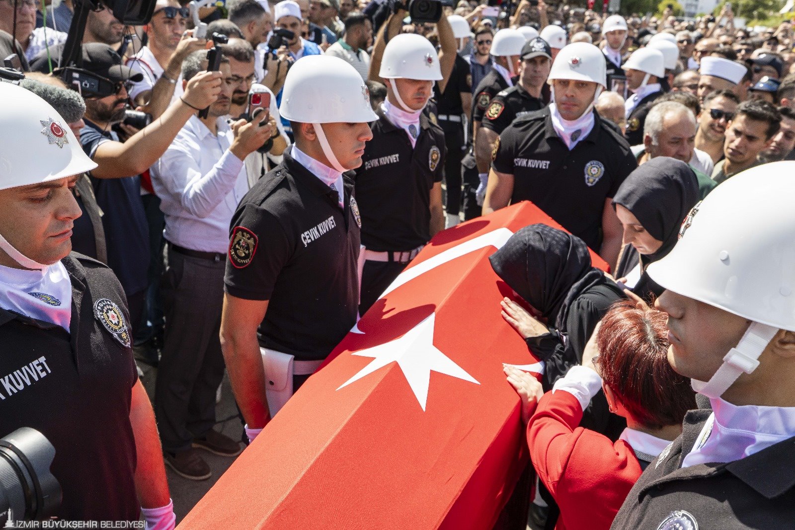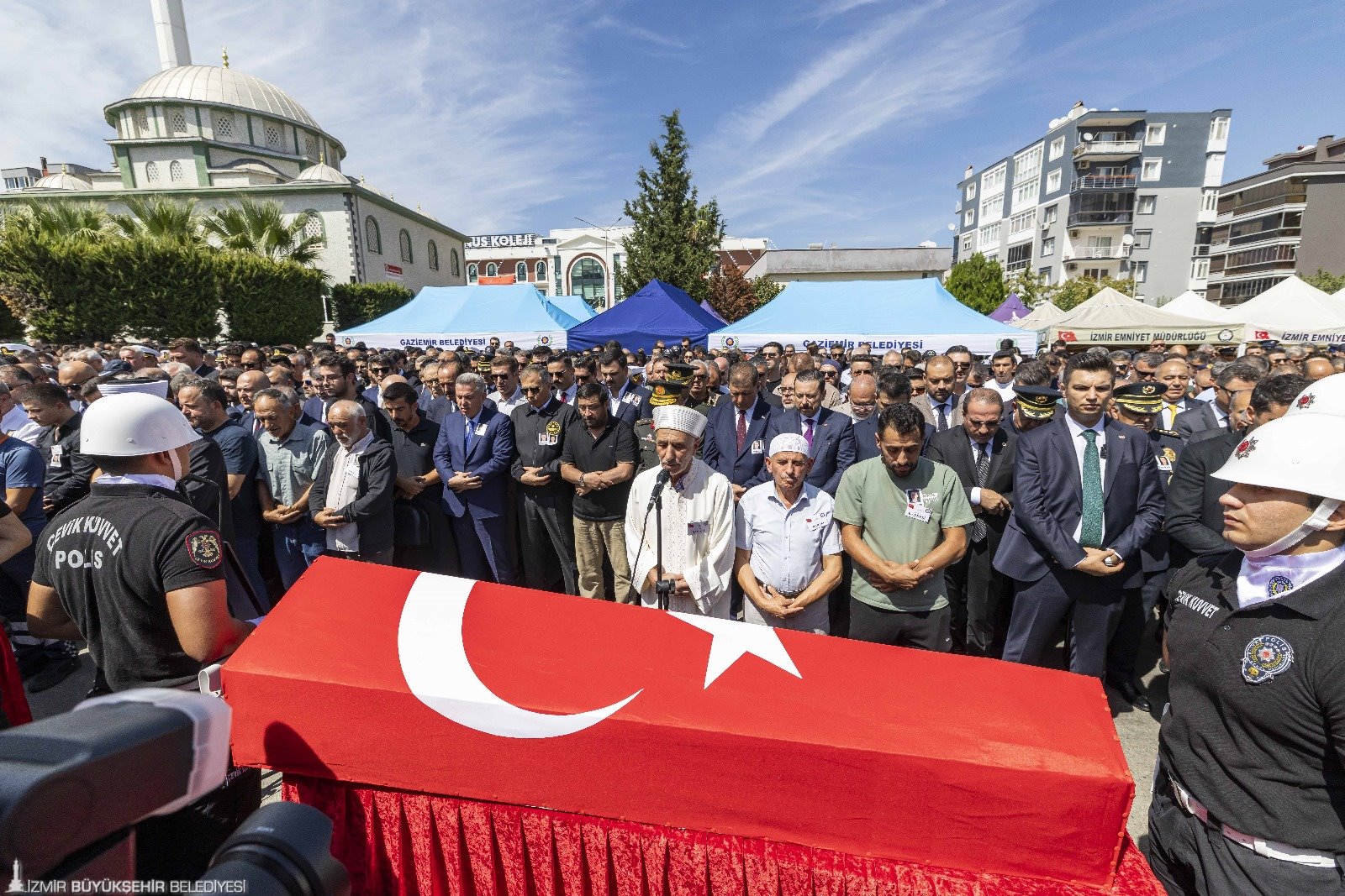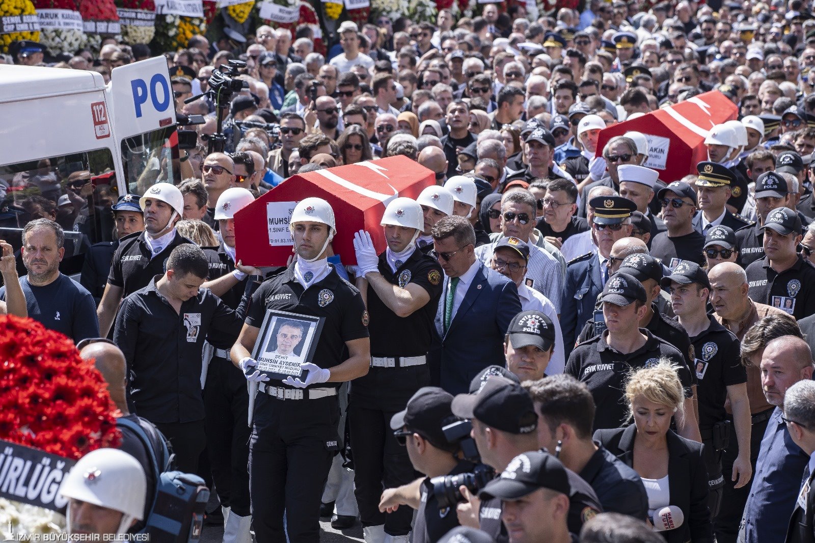 Şehitlerin ay yıldızlı bayrağa sarılı naaşı çalışma arkadaşları tarafından sirenler eşliğinde 15 Temmuz Şehitler Camii'ne getirildi. Birinci Sınıf Emniyet Müdürü ve Polis Başmüfettişi Muhsin Aydemir’in cenaze namazını İzmir İl Müftüsü Sinan Kazancı, Polis memuru Hasan Akın’ın cenaze namazını ise şehidin babası emekli din görevlisi Ferhat Akın kıldırdı. Cenaze namazının ardından Şehit Emniyet Müdürü Muhsin Aydemir’in cenazesi Bornova Işıkkent Polis Şehitliği’ne, Şehit Polis Memuru Hasan Akın’ın cenazesi ise Urla Kuşçular Mahallesi Ova Mezarlığı’na defnedilmek üzere uğurlandı.