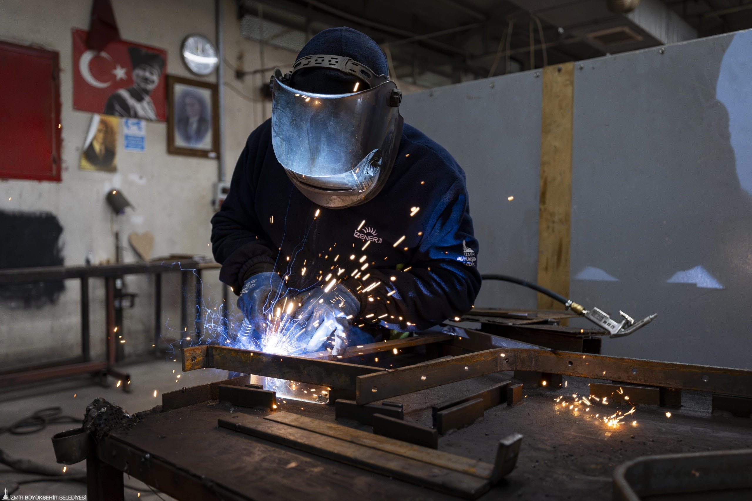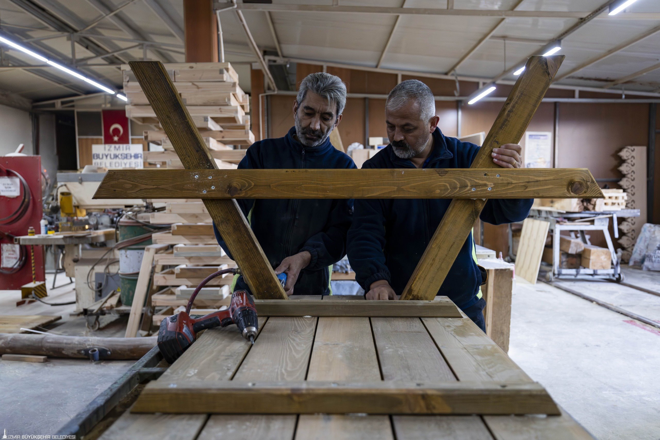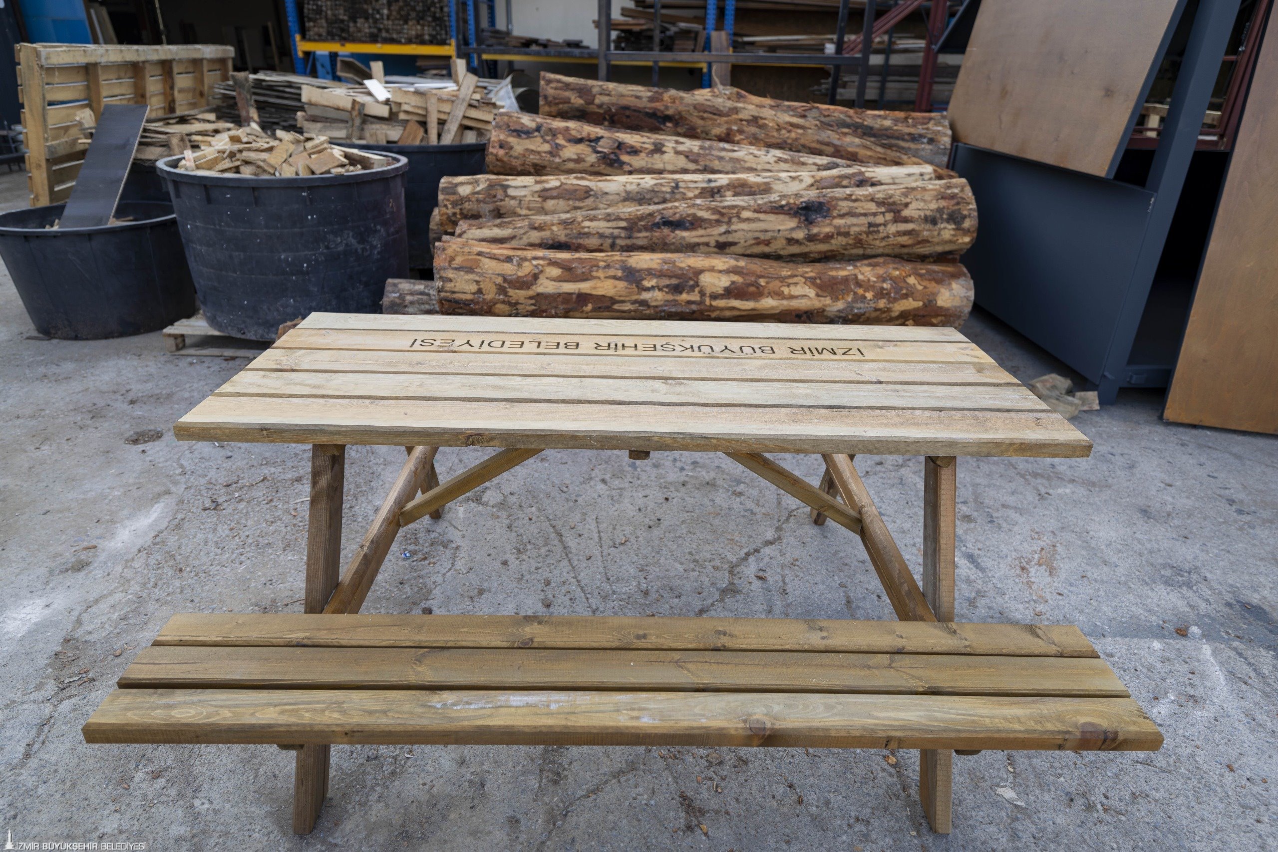 Çalışmalar hakkında bilgi veren Fırat Atölye Şefi Mete Kalaç, “Şu an atölyemizde İzmir genelinde kullanılan bank, çöp kovası, piknik masası, oturma grupları, oyun grupları, kondisyon grupları gibi ekipmanları üretiyoruz. Yeni tasarımlarımızda, kendi atölyemizde imal ettiğimiz küllüklü çöp potalarımız var. Tamamen dönüşümden sağladığımız, çevrede budama yapılırken bize gelen tomruklardan bank ve piknik masası üretimlerimiz bulunuyor. Bostanlı bölgesinde uygulamasına başlayacağımız mısır tezgâhlarımız var. Onların üretimini de kendi personelimizle, atölyemizde yapıyoruz” diye konuştu.
