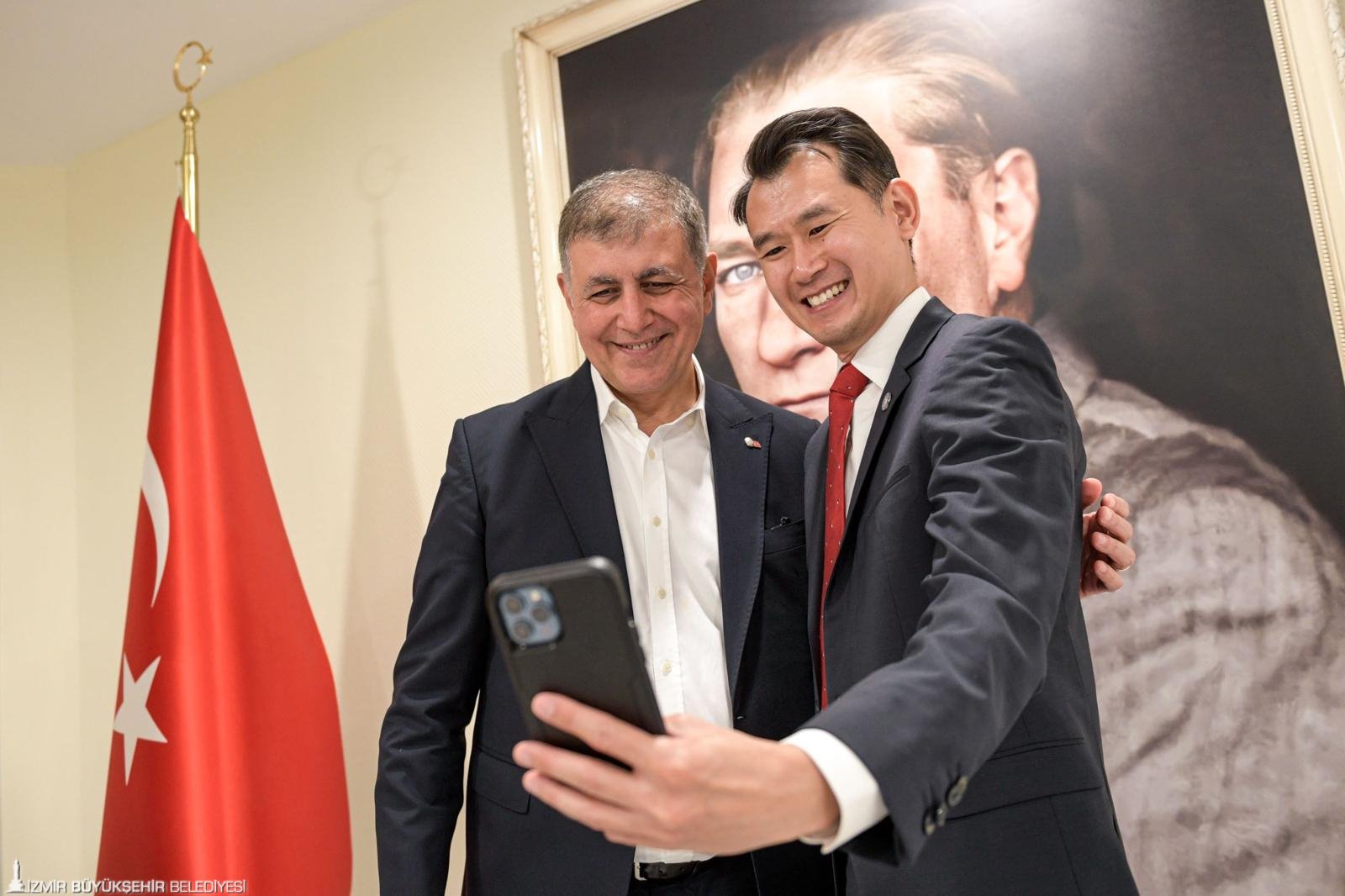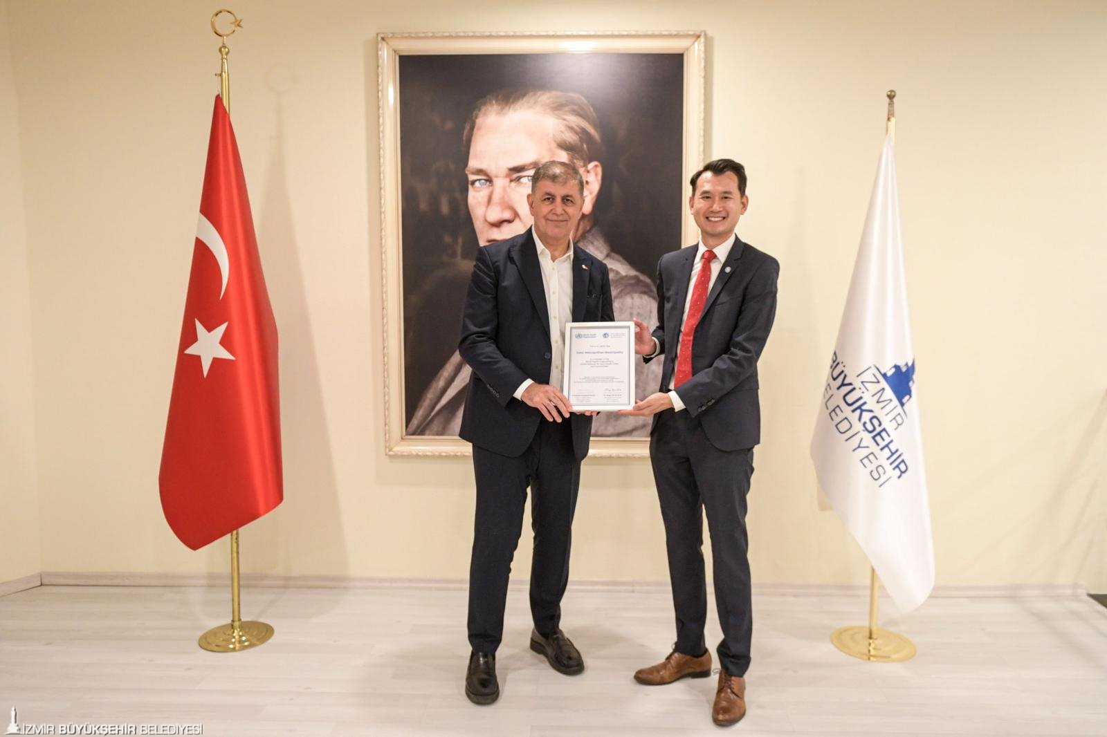 Ziyaretin sonunda Dünya Sağlık Örgütü Avrupa Bölgesi Yaşlanma Ve Sağlık Teknik Sorumlusu Dr. Yongjie Yon, İzmir Büyükşehir Belediye Başkanı Dr. Cemil Tugay ile özçekim yaptı.