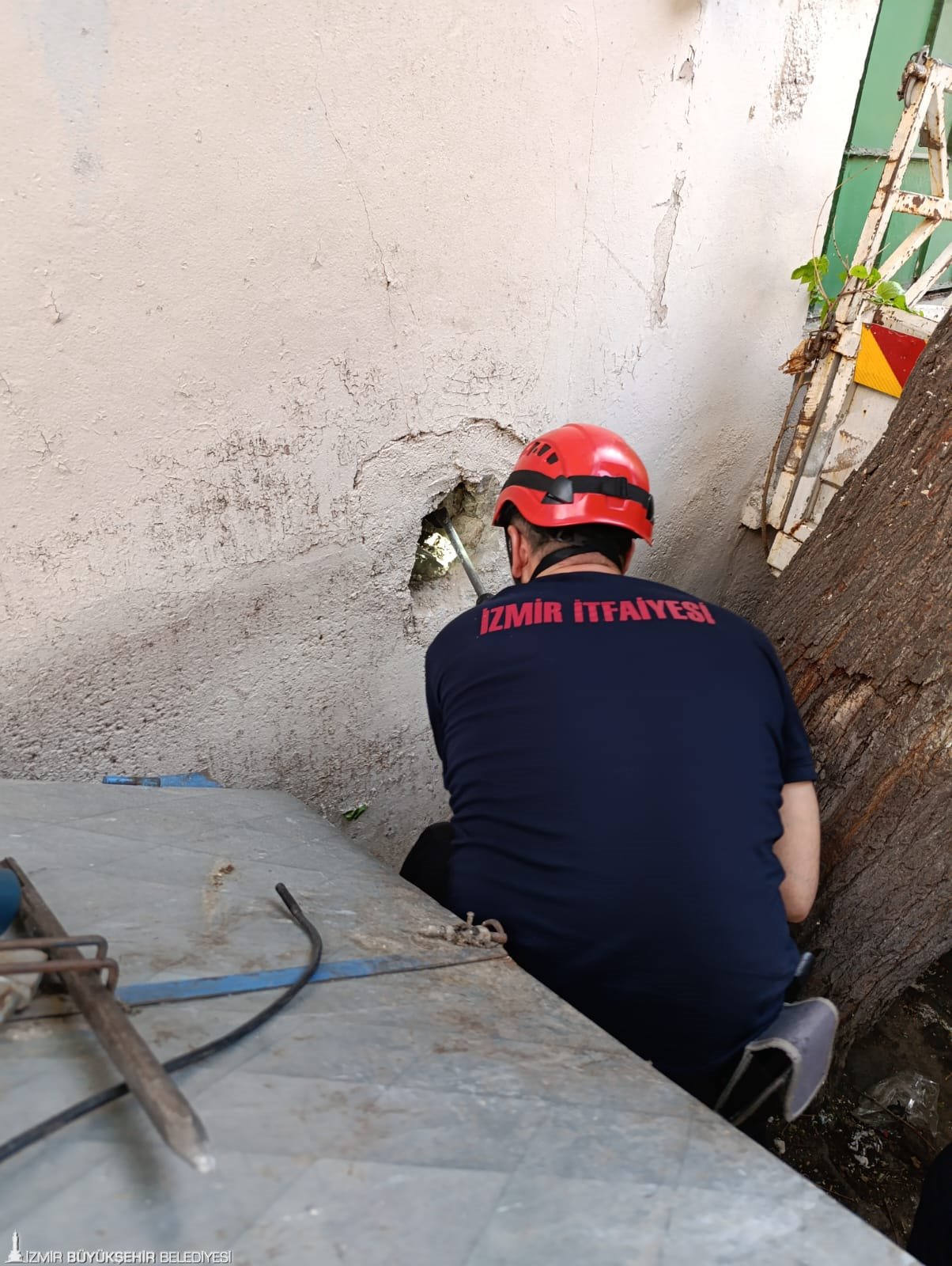 Yapılan taramada kedinin bina temelinin içerisinde yer alan havalandırma borularında olduğu belirlendi. İtfaiyenin kurtarma ekipleri, duvar içerisinde yaklaşık 80 santimetre alan açtı. Kedinin zarar görmesini önlemek amacıyla 4 kurtarma ekibi 4 saat süren titiz bir çalışmanın ardından, sevimli yavruyu bulunduğu yerden çıkarmayı başardı. Kedi, tedavi edilmek üzere İzmir Büyükşehir Belediyesi Veteriner İşleri Dairesi Başkanlığı’nın Kültürpark içerisinde yer alan Küçük Hayvan Polikliniği’ne teslim edildi.