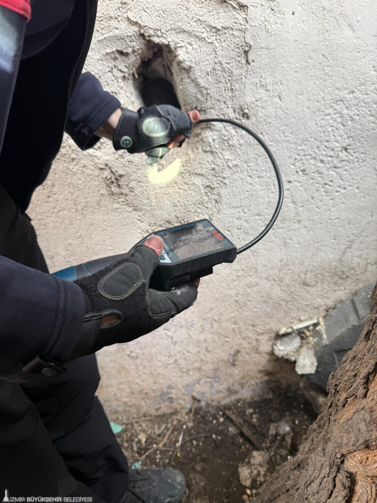 İzmir Büyükşehir Belediyesi İtfaiye Dairesi Başkanlığı ekipleri, Konak Altınordu Mahallesi Anafartalar Caddesi’ndeki Hacı Veli Mumyakmaz Camii’nin duvarı içerisinde yer alan havalandırma bacasından kedi sesi geldiği ihbarı üzerine olay yerine gitti. Merkez İtfaiye Grubu’ndaki Dağda Arama Kurtarma aracı ile olay yerine gelen ekipler, erişilmesi zor yerlerde kullanılan, yılan kamera olarak da adlandırılan kamera ile kedinin yerini belirlemek için çalışmalara başladı.