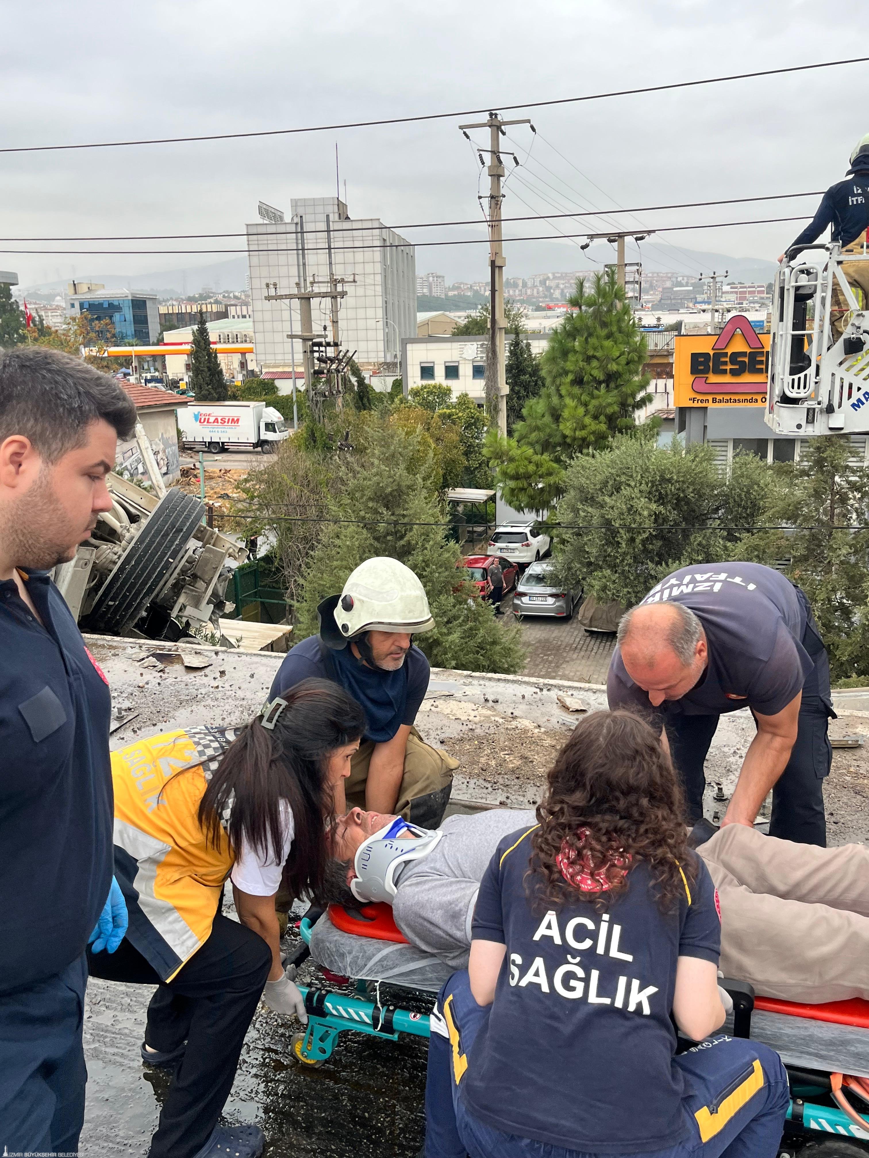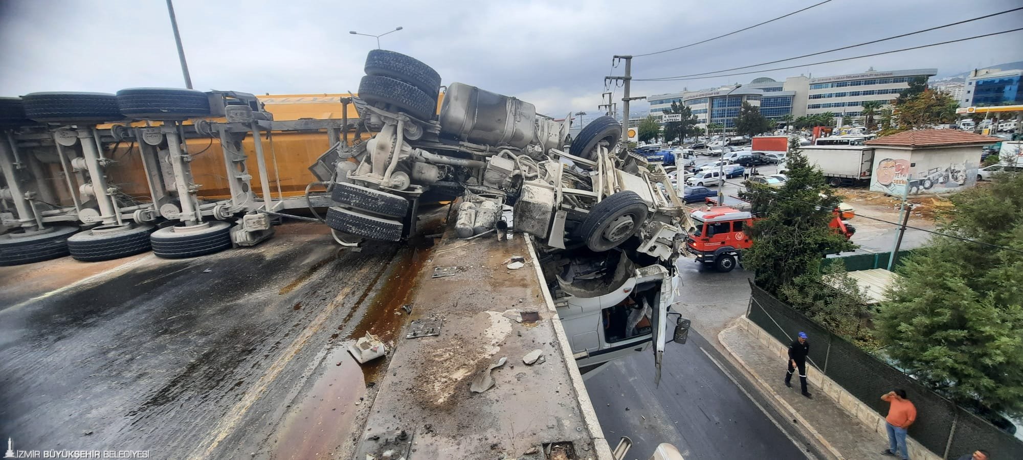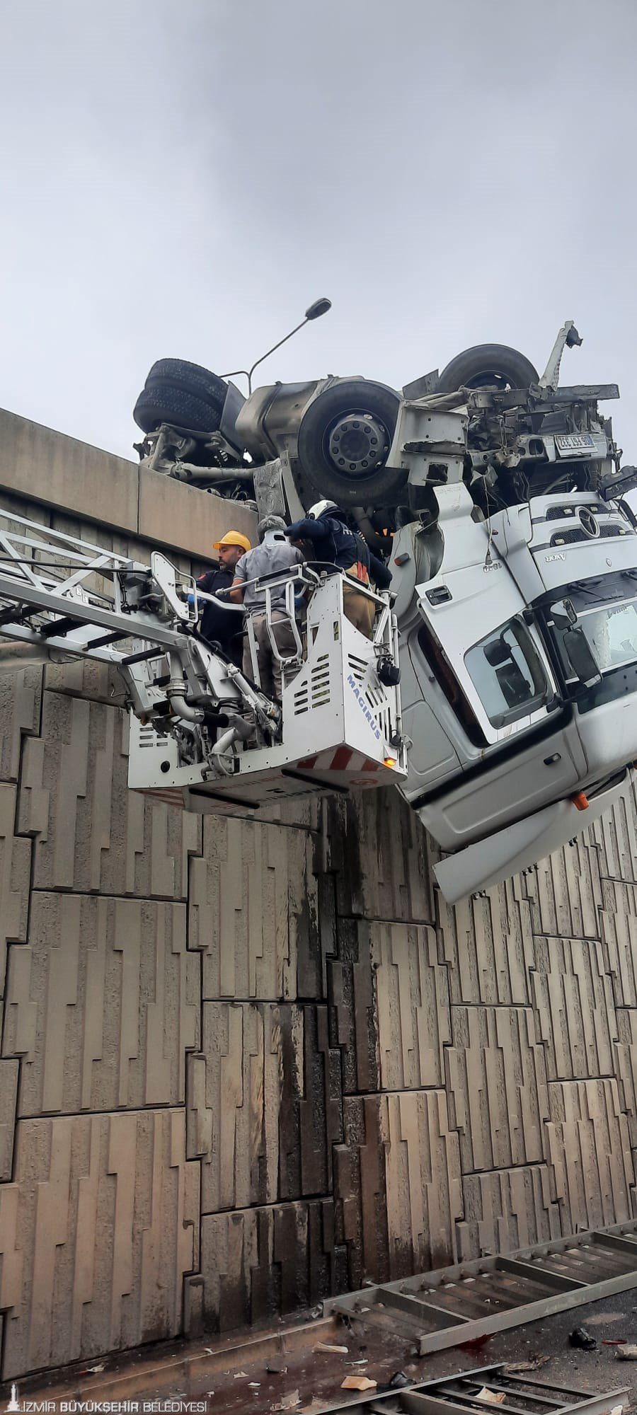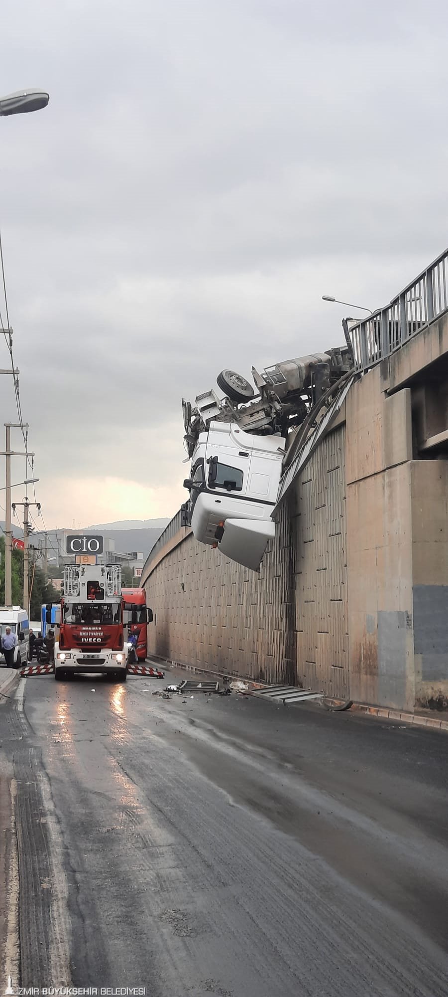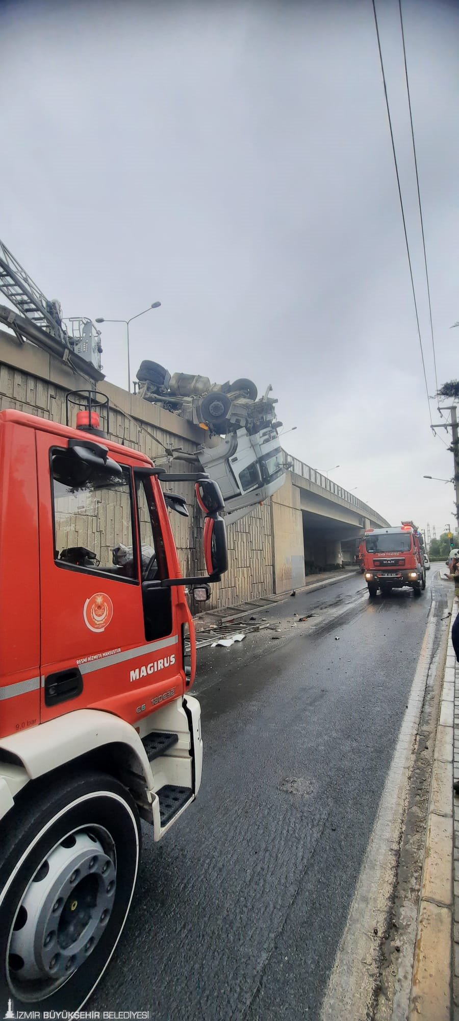 İzmir Büyükşehir Belediyesi İtfaiye Dairesi Başkanlığı ekipleri, bugün ölümle burun buruna gelen tır sürücüsünü kurtardı. Ankara Caddesi 4. Sanayi Sitesi girişindeki yolda kontrolden çıkan tır, yaklaşık 12 metrelik viyadükte asılı kaldı. Bornova Türkan Özilhan Devlet Hastanesi karşısında bulunan viyadük üzerinde, kupası sarkar vaziyette yan yatan tırın sürücüsü, araçta mahsur kaldı. İrfan Öngen isimli yurttaşın yardımına koşan itfaiye ekipleri, başarılı bir çalışma ile şoförü bulunduğu yerden kurtardı. Bilincinin açık olduğu öğrenilen sürücü tedavi altına alındı.