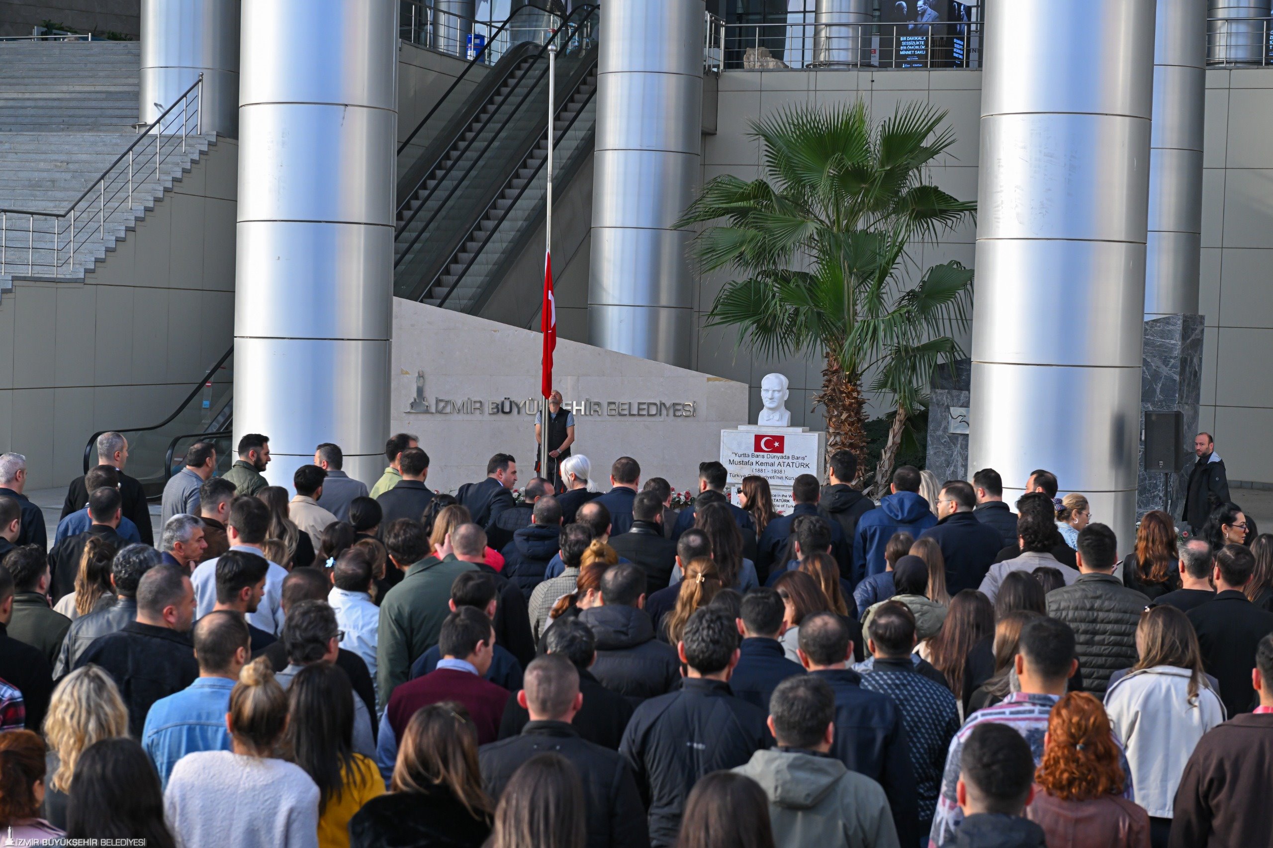 Saatler 9.05’i gösterdiğinde başta Kültürpark hollerindeki hizmet birimleri olmak üzere İZSU, ESHOT, İZFAŞ, İZMİR METROSU, İZDENİZ olmak üzere İzmir Büyükşehir Belediyesi’nin tüm birimlerindeki görevli personel saygı duruşunda bulundu.