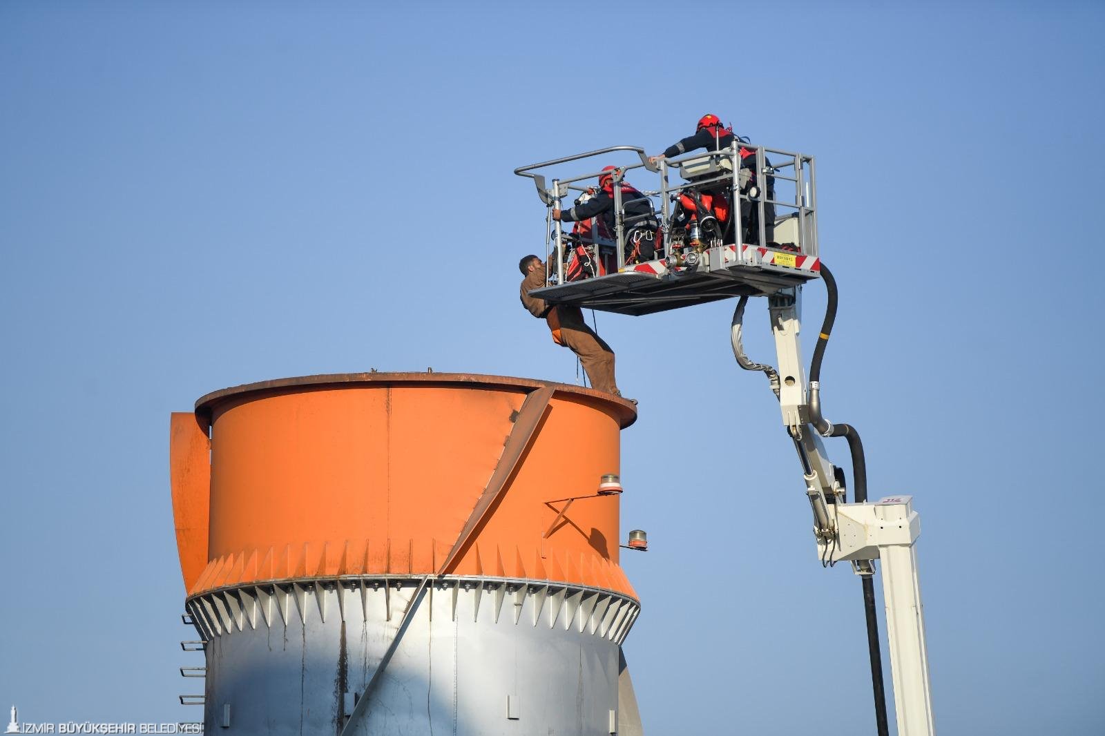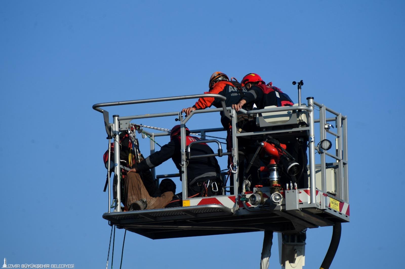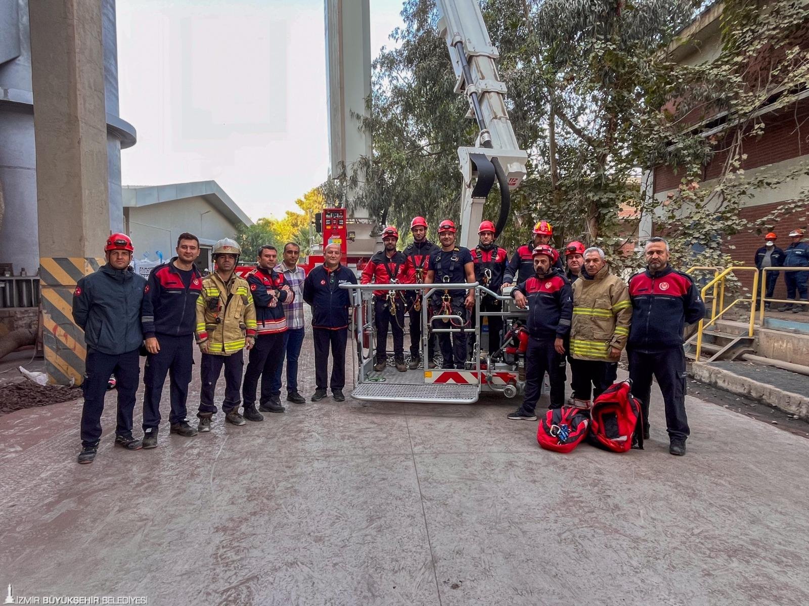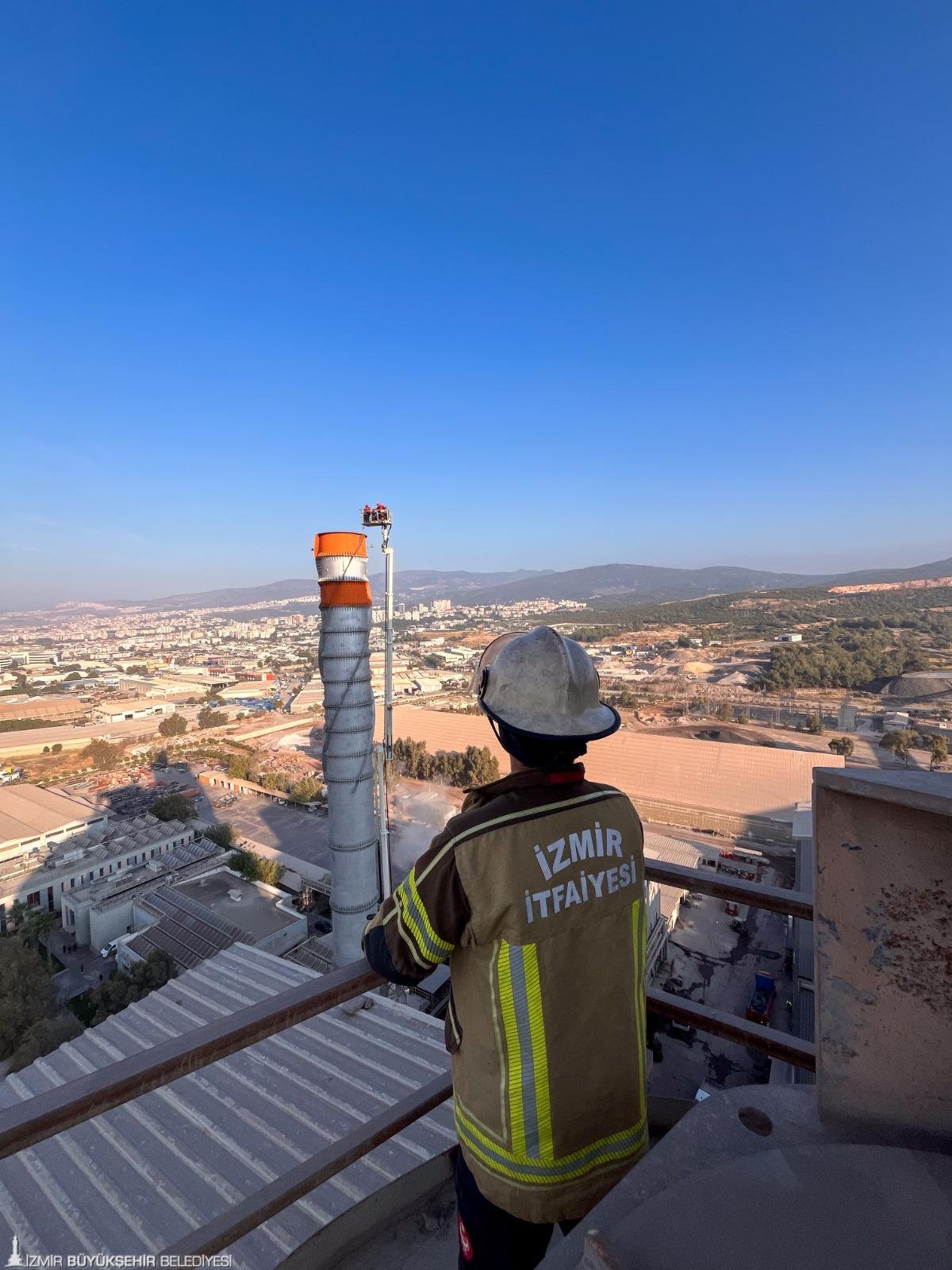 Bornova’da Ankara Caddesi üzerinde bulunan bir çimento fabrikasına ait 70 metre yüksekliğindeki bacaya temizlik amacıyla çıkan 2 işçi, iskelenin çökmesi sonucu yaklaşık 10 metre aşağıya düşerek baca içerisinde mahsur kaldı. Olayın ihbar edilmesi üzerine bölgeye İzmir Büyükşehir Belediyesi İtfaiye Dairesi Başkanlığı ve AFAD ekipleri sevk edildi. Ekipler, 90 metrelik merdivenli araçla bacanın üst kısımlarına doğru çıkarak işçilere ulaştı. Ekipler, yaklaşık dört saatlik titiz ve kontrollü çalışmaların ardından işçileri mahsur kaldıkları yerden kurardı. Sağlık durumlarının iyi olduğu belirlenen işçiler, tedbir amacıyla 112 Acil Sağlık ekiplerine teslim edildi.