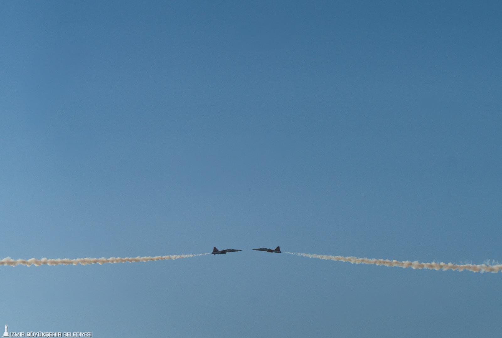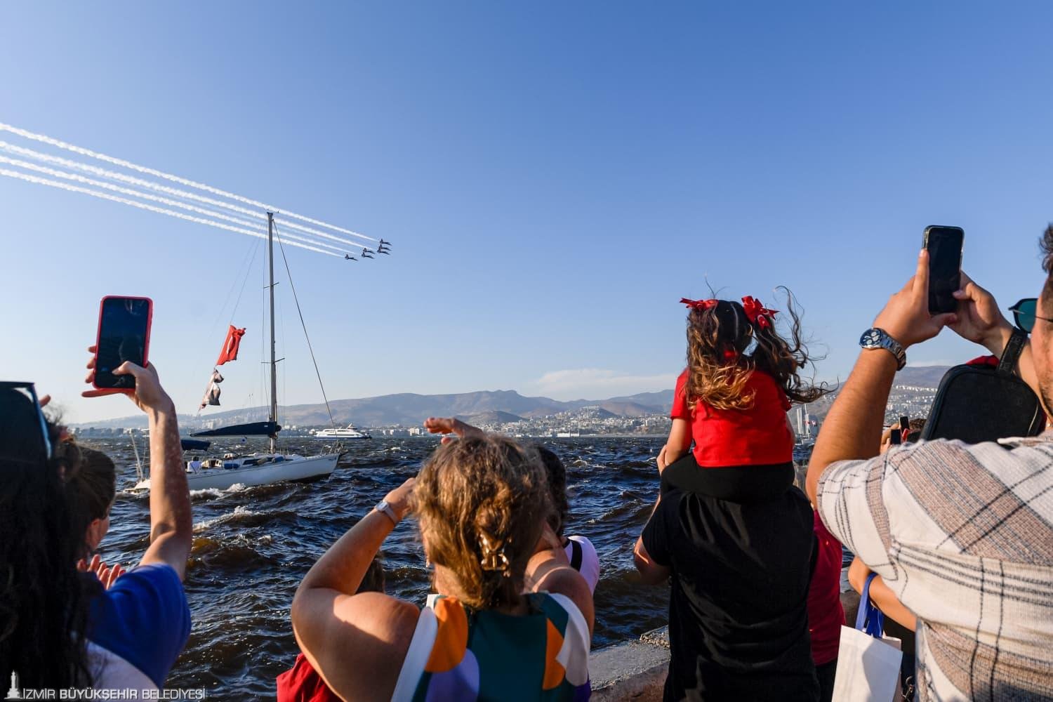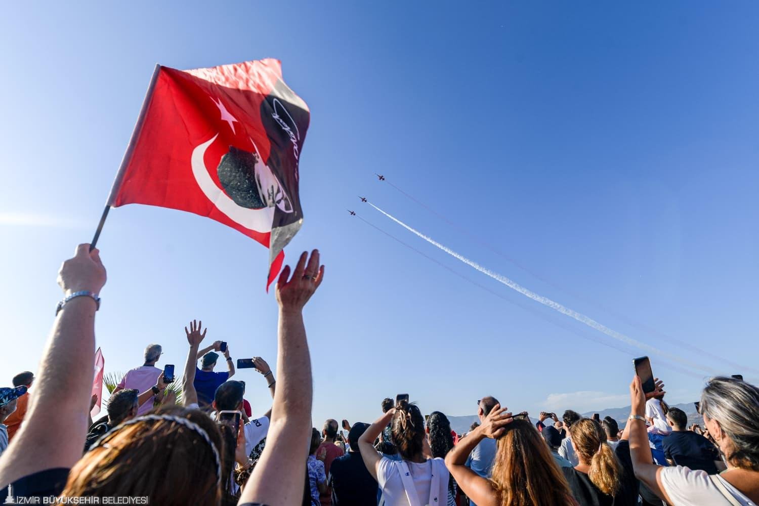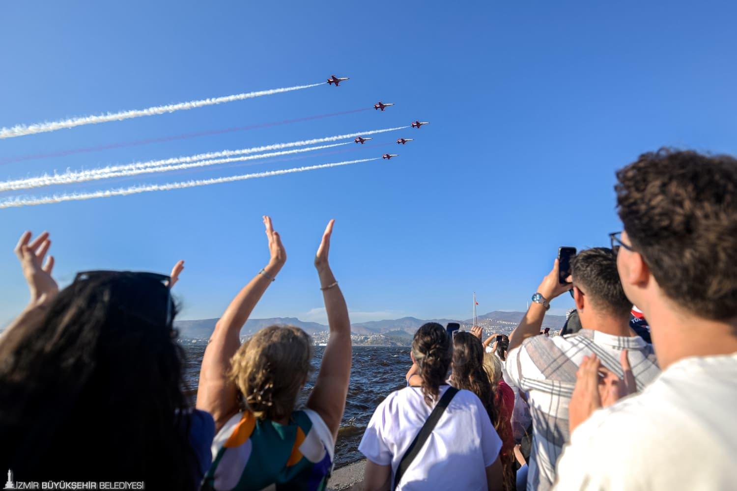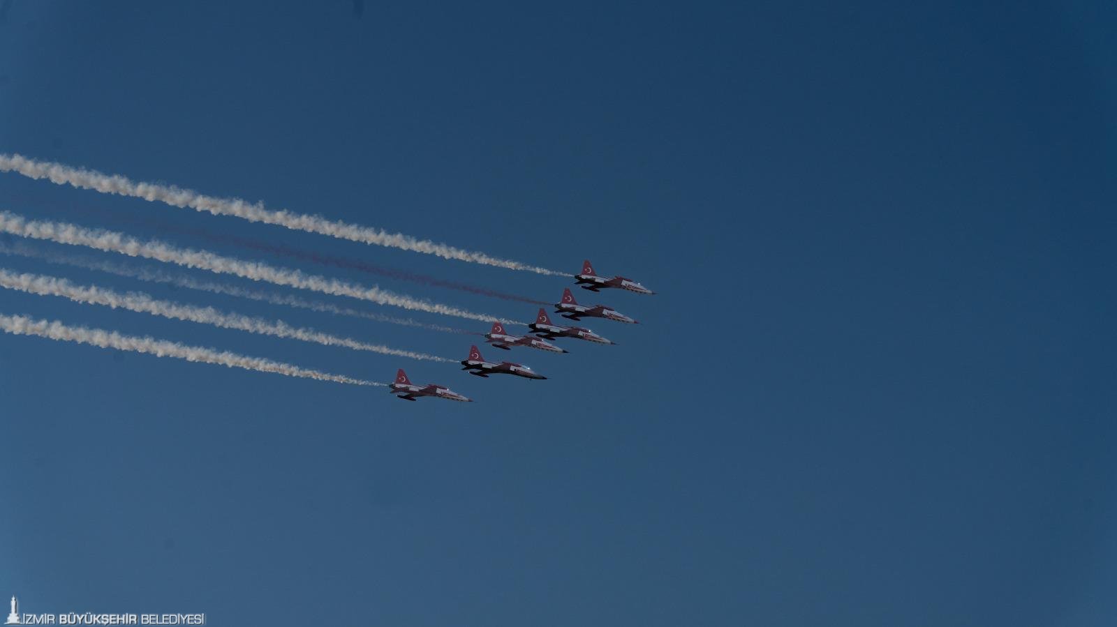 İzmir’in düşman işgalinden kurtuluşunun 103’üncü yıl dönümü, gün boyunca düzenlenen etkinliklerle kutlandı. Sabah saatlerinde başlayan program, akşam da gökyüzü şovuyla devam etti. 9 Eylül kutlamalarının heyecanla beklenen bölümlerinden biri de Türk Hava Kuvvetleri’ne bağlı Türk Yıldızları ve Solo Türk'ün gösterileri oldu. Binlerce İzmirli bu gösteriyi kaçırmamak için ellerinde Türk bayrakları ile Körfez çevresini kırmızı beyaza boyadı. Türk Hava Kuvvetleri'nin akrobasi timi olan Türk Yıldızları, gökyüzünde unutulmaz bir gösteri sundu. Hemen sonrasında ise tek pilotla gerçekleştirilen yüksek hız ve çeviklik içeren Solo Türk gösterisi, İzmir semalarında adeta görsel bir şölen yaşattı.