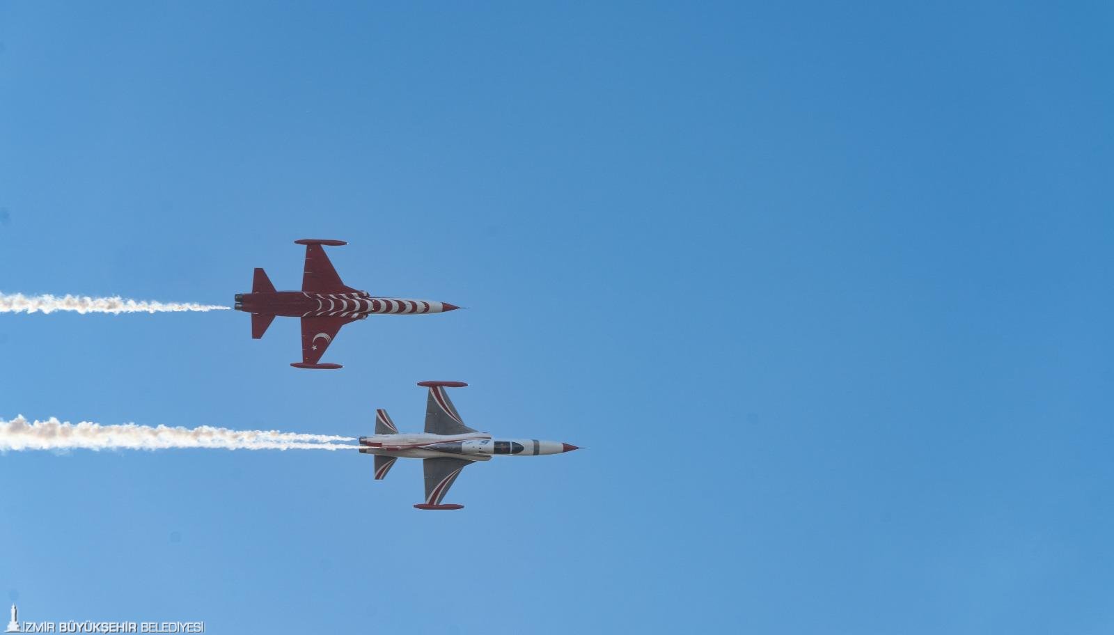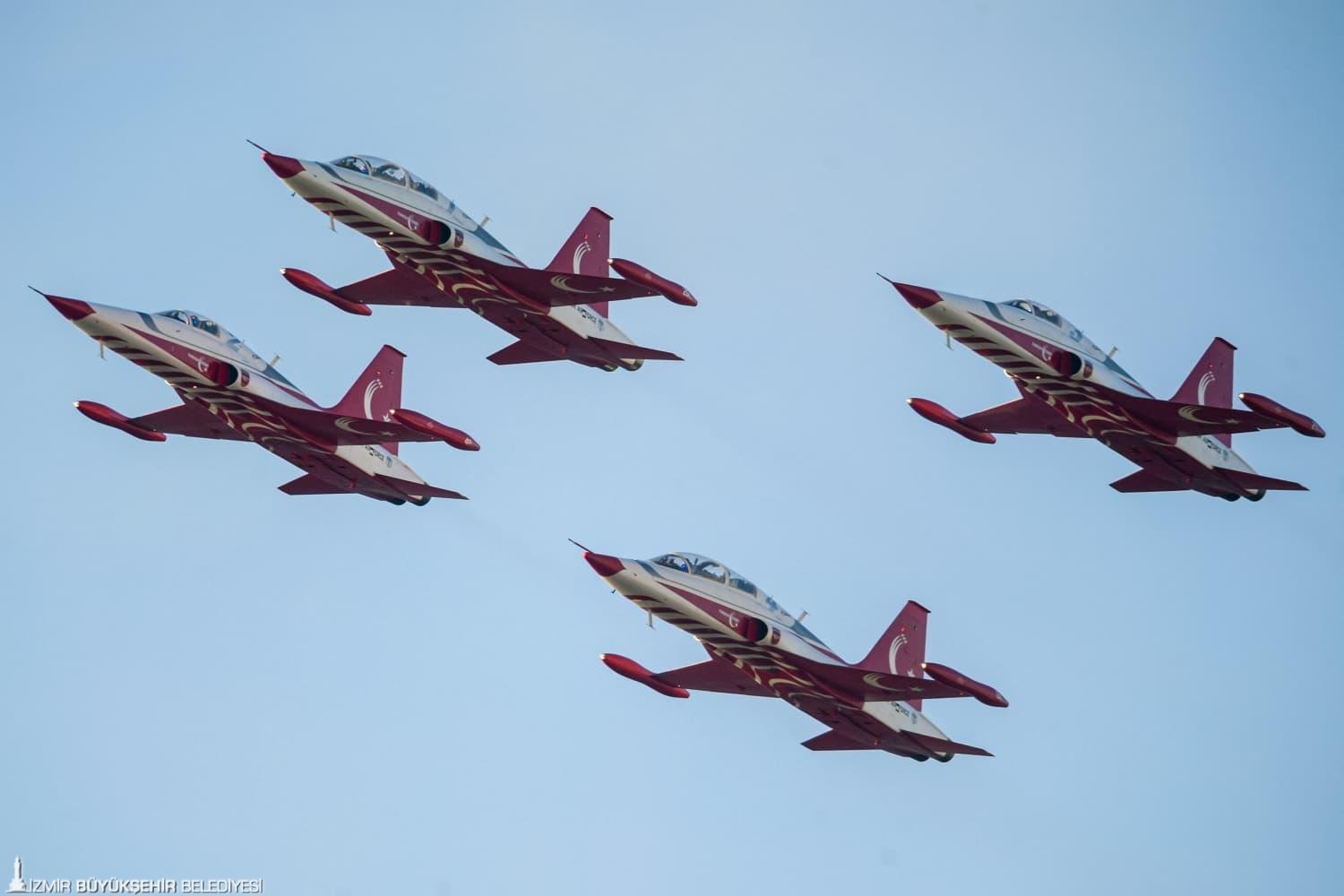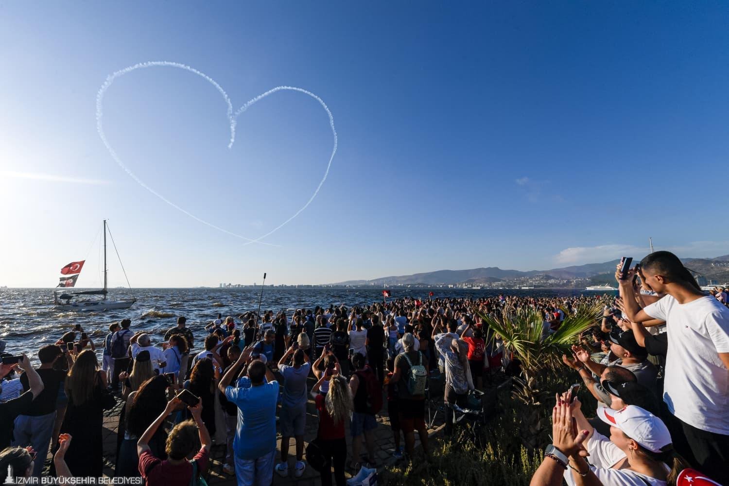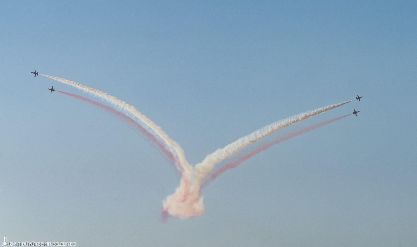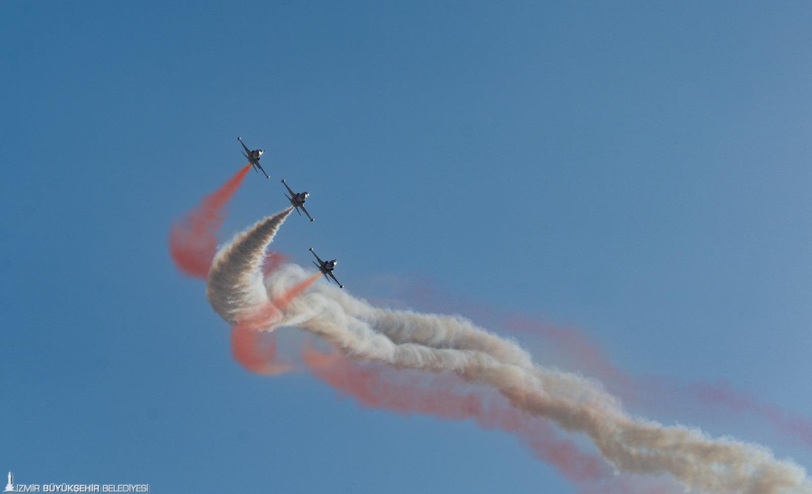 İzmir’in düşman işgalinden kurtuluşunun 103’üncü yıl dönümü, gün boyunca düzenlenen etkinliklerle kutlandı. Sabah saatlerinde başlayan program, akşam da gökyüzü şovuyla devam etti. 9 Eylül kutlamalarının heyecanla beklenen bölümlerinden biri de Türk Hava Kuvvetleri’ne bağlı Türk Yıldızları ve Solo Türk'ün gösterileri oldu. Binlerce İzmirli bu gösteriyi kaçırmamak için ellerinde Türk bayrakları ile Körfez çevresini kırmızı beyaza boyadı. Türk Hava Kuvvetleri'nin akrobasi timi olan Türk Yıldızları, gökyüzünde unutulmaz bir gösteri sundu. Hemen sonrasında ise tek pilotla gerçekleştirilen yüksek hız ve çeviklik içeren Solo Türk gösterisi, İzmir semalarında adeta görsel bir şölen yaşattı.