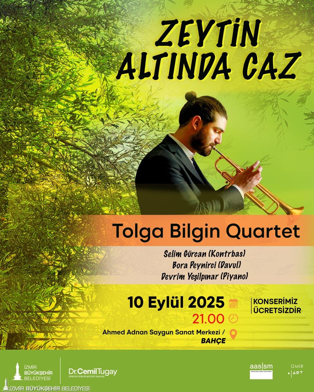 Ahmed Adnan Saygun Sanat Merkezi (AASSM), Zeytin Altında Konserleri'nde Tolga Bilgin Quartet'i ağırlıyor. 10 Eylül günü saat 21.00'de başlayacak konserde, trompette Tolga Bilgin, kontrbasta Selim Gürcan, davulda Bora Peynirci ve piyanoda Devrim Yeşilpınar yer alacak. Quartet, sanatseverlere unutulmaz bir caz ziyafeti sunacak.