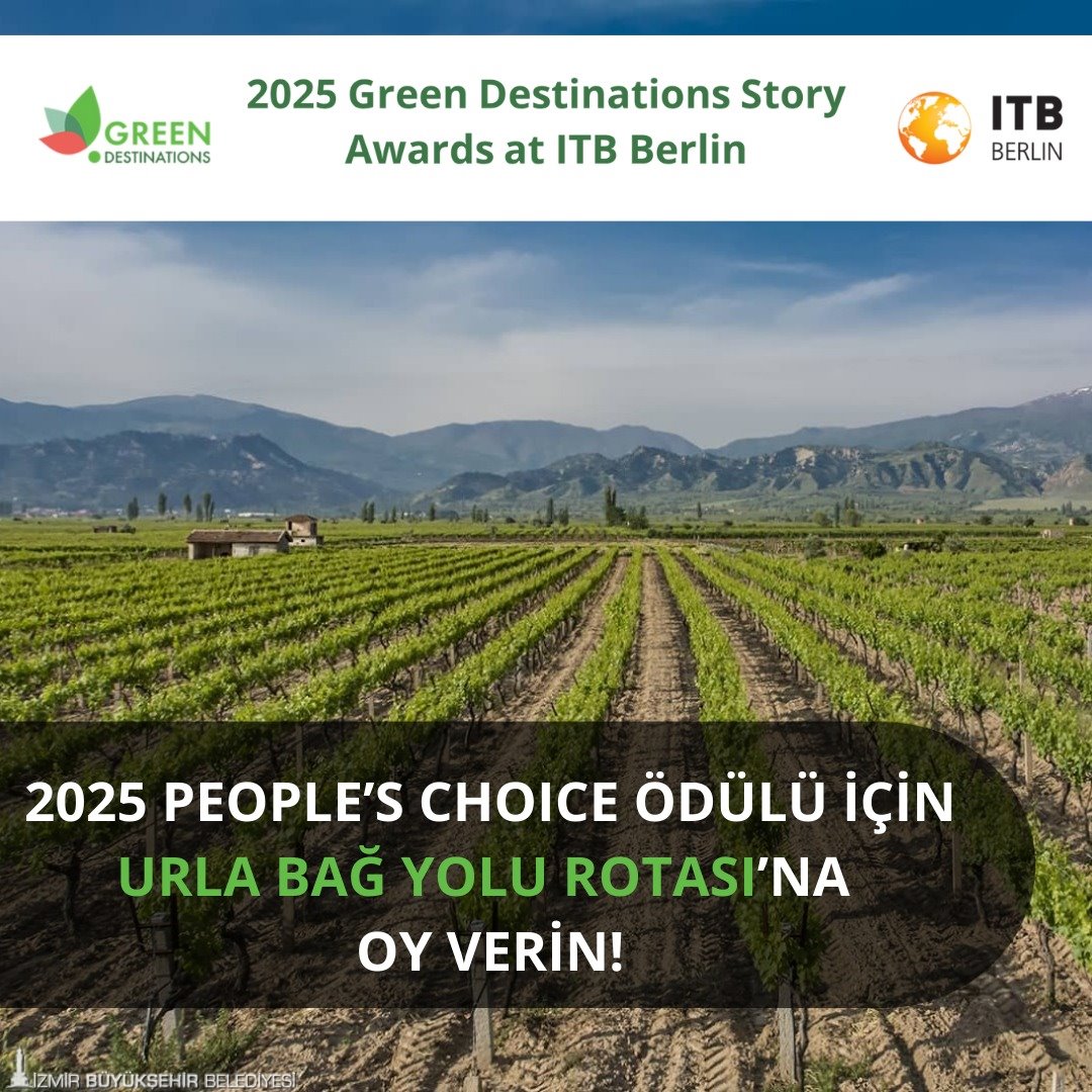 “2024 Yeşil Destinasyonlar En İyi 100 Hikaye” listesine seçilen Urla Bağ Yolu, şimdi de “2025 Yeşil Destinasyonlar Halkın Seçimi Ödülü” için finale kaldı. İzmir’e bu anlamlı ödülü kazandırmak için https://opavote.com/en/vote/5100820134100992 linkine tıklayarak Turkey - Urla/İzmir seçeneği ile oy verilebiliyor.