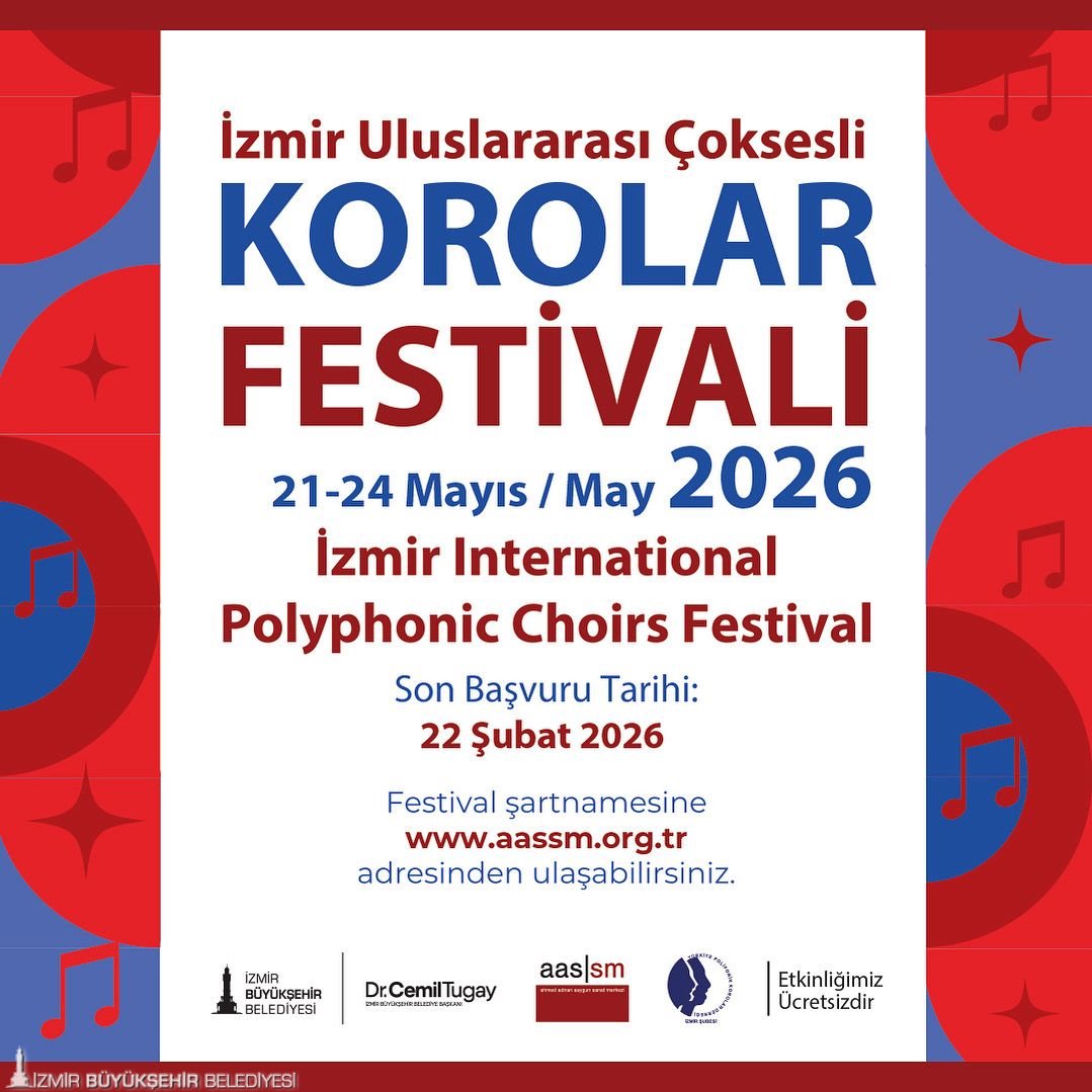 Geçtiğimiz yıllarda yüzlerce korist ve binlerce konuğu ağırlayan, bu yıl 5’incisi düzenlenecek İzmir Uluslararası Çoksesli Korolar Festivali, çoksesli koro müziği aracılığıyla ulusal müziğimizi evrensel bir perspektife taşımayı, koro şefleri ve müzik eğitimcileri arasında ilham ve etkileşimi artırmayı hedefliyor. Festival kapsamında, Türk ve dünya koro repertuvarından seçilen nitelikli eserler müzikseverlerle buluşturulacak. İzmir Büyükşehir Belediyesi ile Türkiye Polifonik Korolar Derneği İzmir Şubesi iş birliğinde 21-24 Mayıs tarihleri arasında Ahmed Adnan Saygun Sanat Merkezi’nde yapılacak festivale katılmak isteyen korolar için son başvuru tarihi 22 Şubat olarak belirlendi. Başvuru koşulları ve festival şartnamesine https://www.aassm.org.tr/ adresinden ulaşabiliyor.