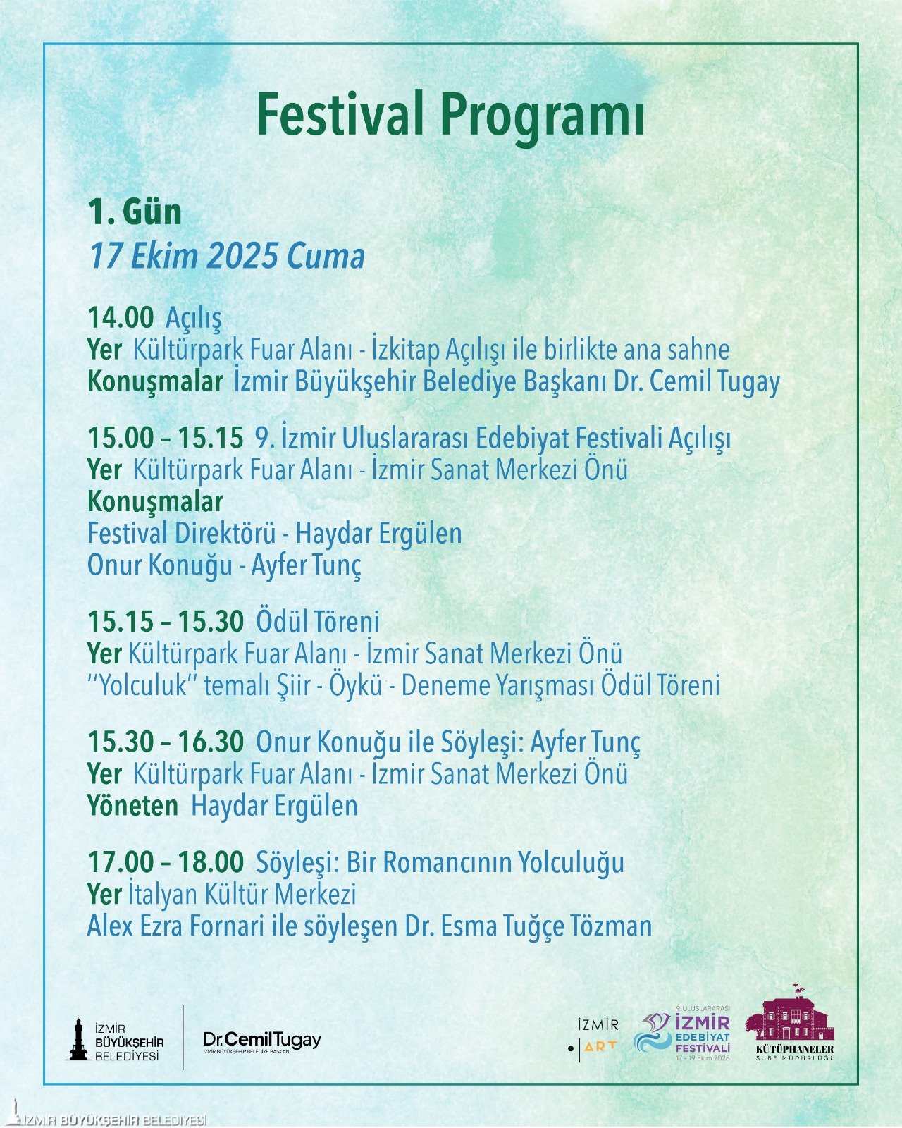 Bu yıl “Edebiyat Yolculuktur” temasıyla İzmir Büyükşehir Belediyesi tarafından gerçekleştirilecek 9. İzmir Uluslararası Edebiyat Festivali, 17-19 Ekim tarihleri arasında edebiyat dünyasını buluşturacak. Direktörlüğünü Şair Haydar Ergülen’in üstlendiği festivalin onur konuğu ise yazar Ayfer Tunç olacak. Türkiye’den ve dünyadan toplam 36 yazar ve şairin katılacağı 9. İzmir Uluslararası Edebiyat Festivali, 17 Ekim günü, Kültürpark’ta İZKİTAPFEST-6. İzmir Kitap Fuarı ile eş zamanlı başlayacak. Açılış gününde, lise öğrencileri için festival kapsamında düzenlenen “Yolculuk” temalı şiir, öykü ve deneme yarışmasının ödülleri sahiplerini bulacak. Ayrıca, Kültürpark İzmir Sanat Merkezi önünde onur konuğu yazar Ayfer Tunç ile özel bir söyleşi de gerçekleştirilecek.