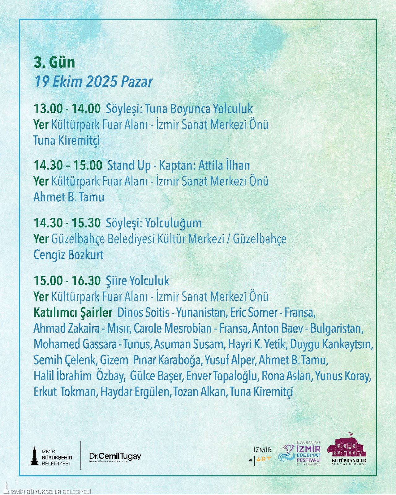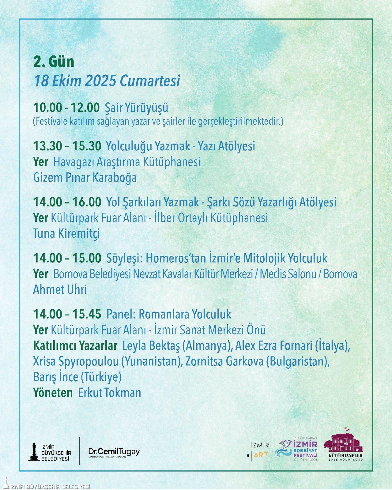 Etkinlikler, Kültürpark ile sınırlı kalmayacak. Urla Belediyesi Kent Tarihi ve Arşivi Salonu, Güzelbahçe Belediyesi Kültür Merkezi ve Bornova Belediyesi Nevzat Kavalar Kültür Merkezi gibi kent genelindeki mekanlarda paneller, söyleşiler ve atölyeler düzenlenecek. Böylece festival, İzmir’in farklı noktalarında yurttaşlara edebiyatın izlerini sürme fırsatı sunacak.