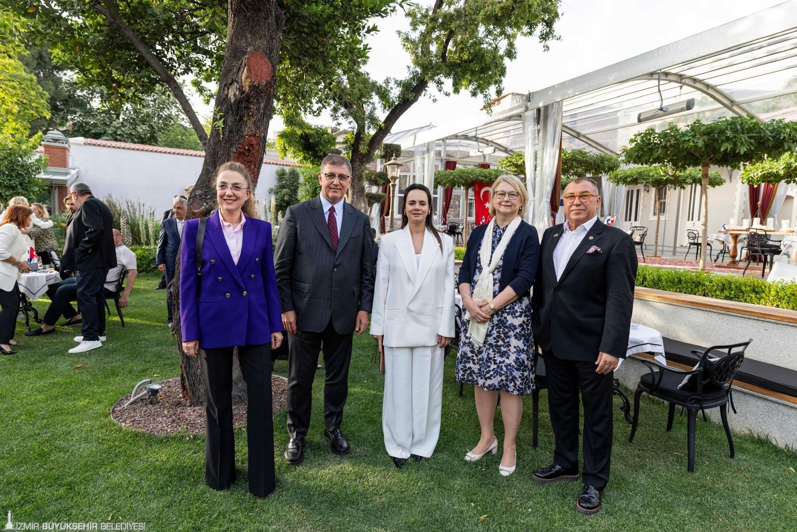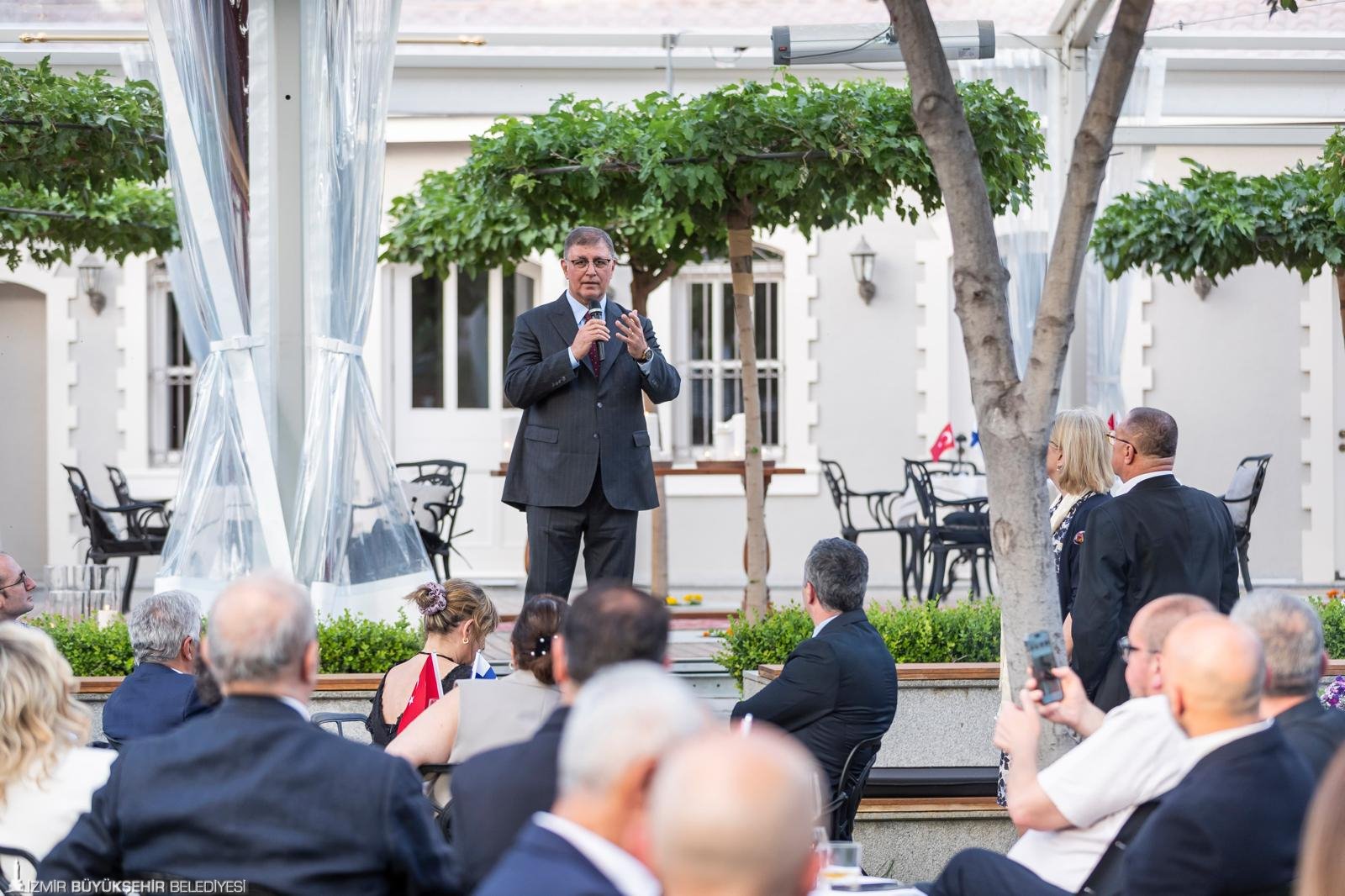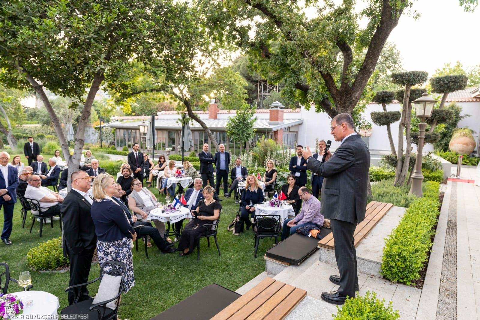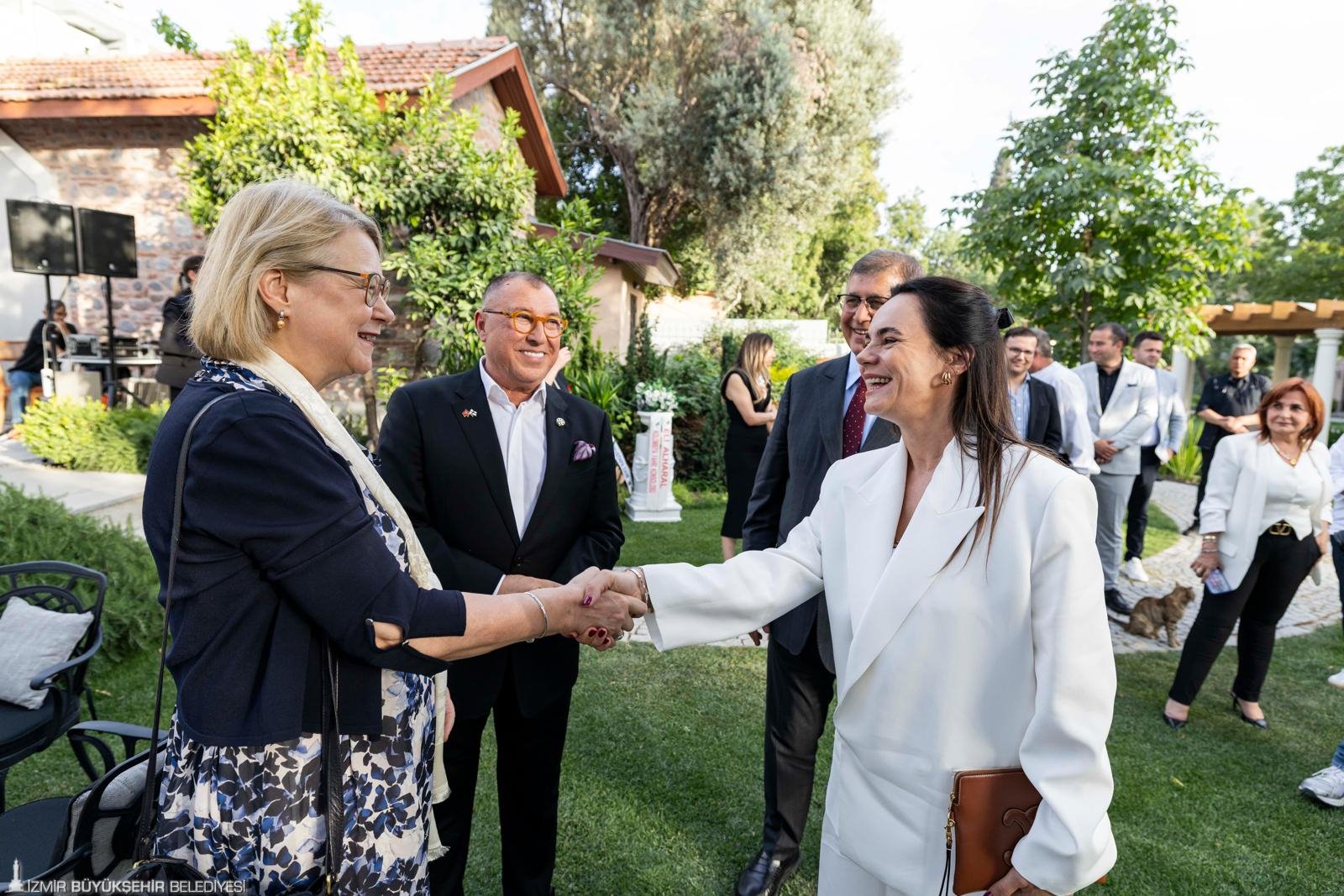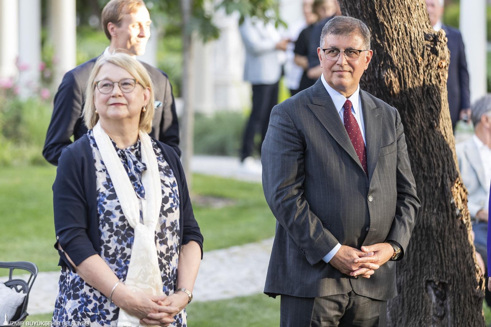 İzmir Büyükşehir Belediye Başkanı Dr. Cemil Tugay eşi Öznur Tugay ile Finlandiya Büyükelçiliği tarafından düzenlenen resepsiyona katıldı. Bornova Mattheys Köşkü’ndeki gecede Finlandiya Büyükelçisi Pirkko Hämäläinen, Finlandiya’nın İzmir Fahri Konsolosu Haluk Özyavuz, iş dünyasının temsilcileri ve davetliler yer aldı. Başkan Dr. Cemil Tugay, İzmir’in bu tür etkinliklere ev sahipliği yapmasının önemine değinerek “İzmir asla kapalı kutu olmaması gereken bir şehir. Zaten genlerinde uluslararası olma özelliği var. Çok kültürlü bir yaşamı var. Ama bunu yansıtacak şekilde şehir dinamiği olmalı. Bize misafir olan insanları doğru ağırlamamız, doğru iletişim kurmamız lazım. Bu akşam burada olmak benim için hem keyif hem de bir görev. Finlandiya ile ilgili hep mutlu insanların ülkesi, huzur ülkesi diye bahsedilirdi. Bunu duyarak büyüdük. Finlandiya aynı zamanda bizim için özel bir dost. Finlerle Türkler arasında genetik bir benzerlik olduğu da söylenir. Aramızdaki dostluğun gelişmesine katkı sağlayan herkese çok teşekkür ediyorum. Bizim için paradan önce dostluk geliyor. Zaten ekonomik ilişkiler de sağlam dostluklar üzerine kuruluyor. Güven oluşmadan ilişki kurulamıyor. Finlandiya yüzde 100 güven duyduğumuz, yakın olmak istediğimiz ülkelerden birisi. Daha sık görüşmeyi diliyorum” dedi.