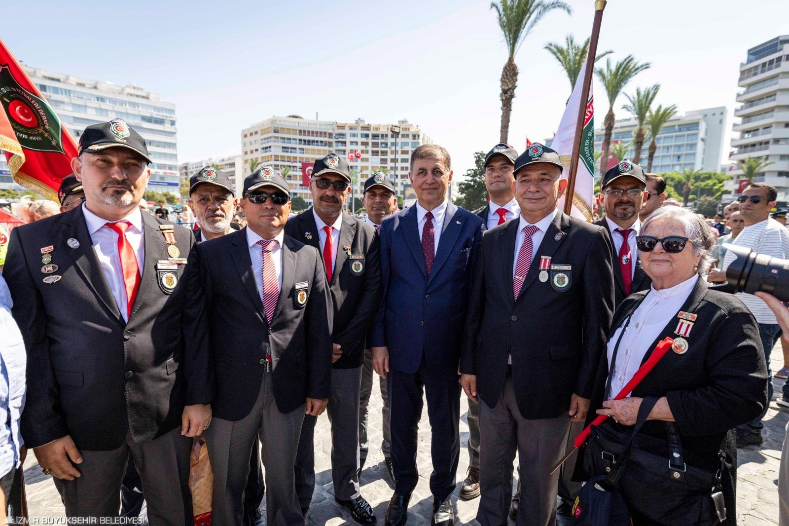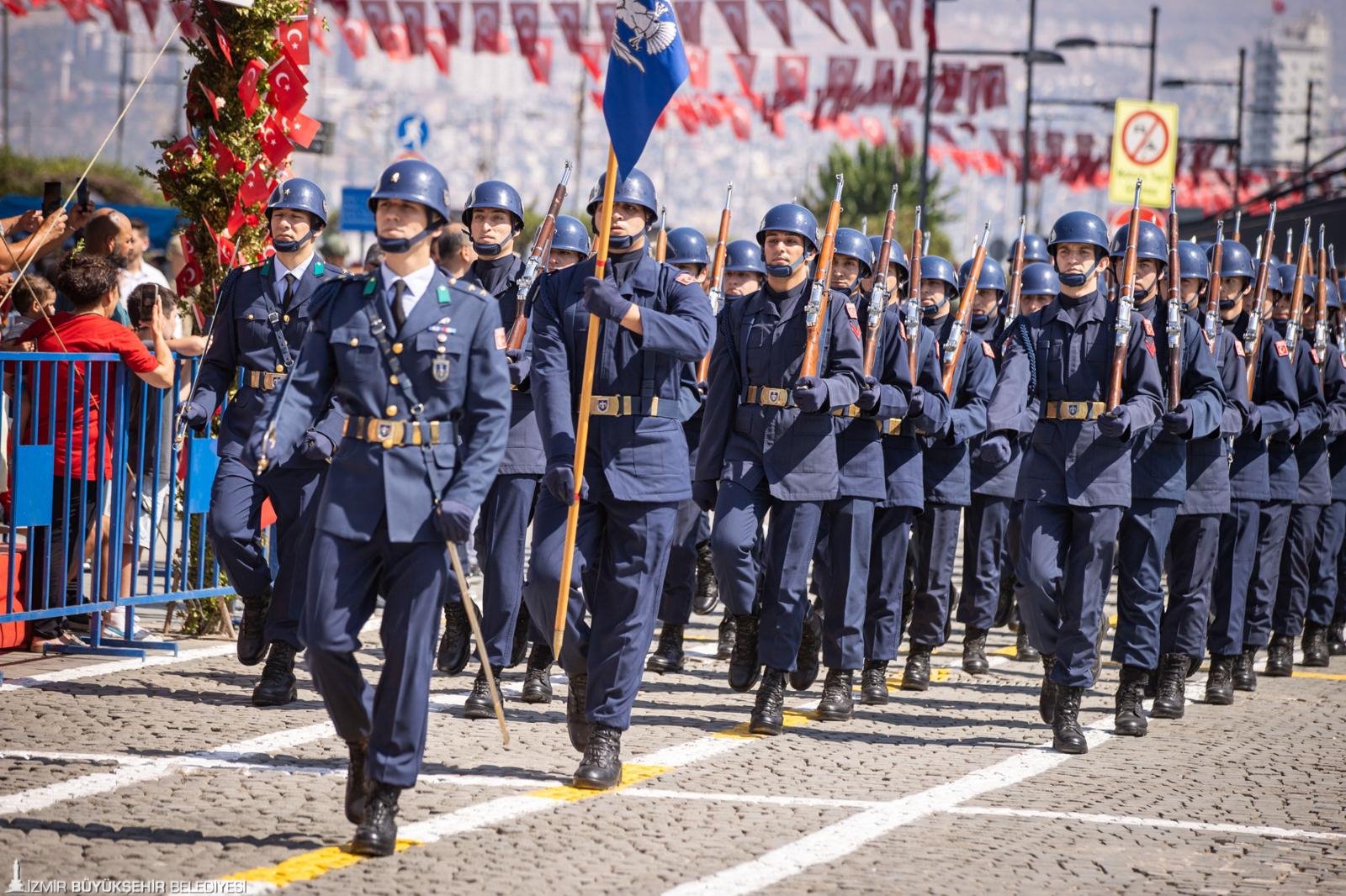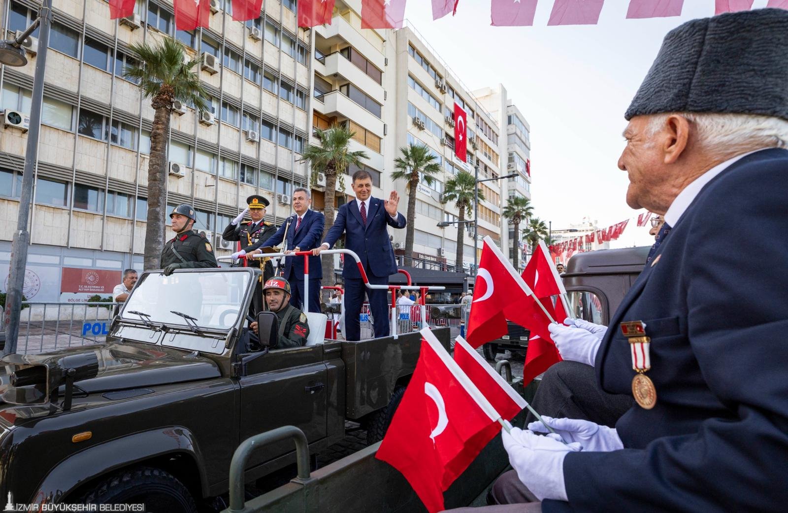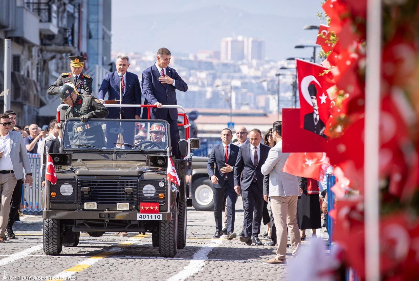 Askeri geçit töreni de büyük ilgi gördü. İzmirliler korteji “Mustafa Kemal’in askerleriyiz” sloganları ile ayakta alkışlayarak karşıladı.