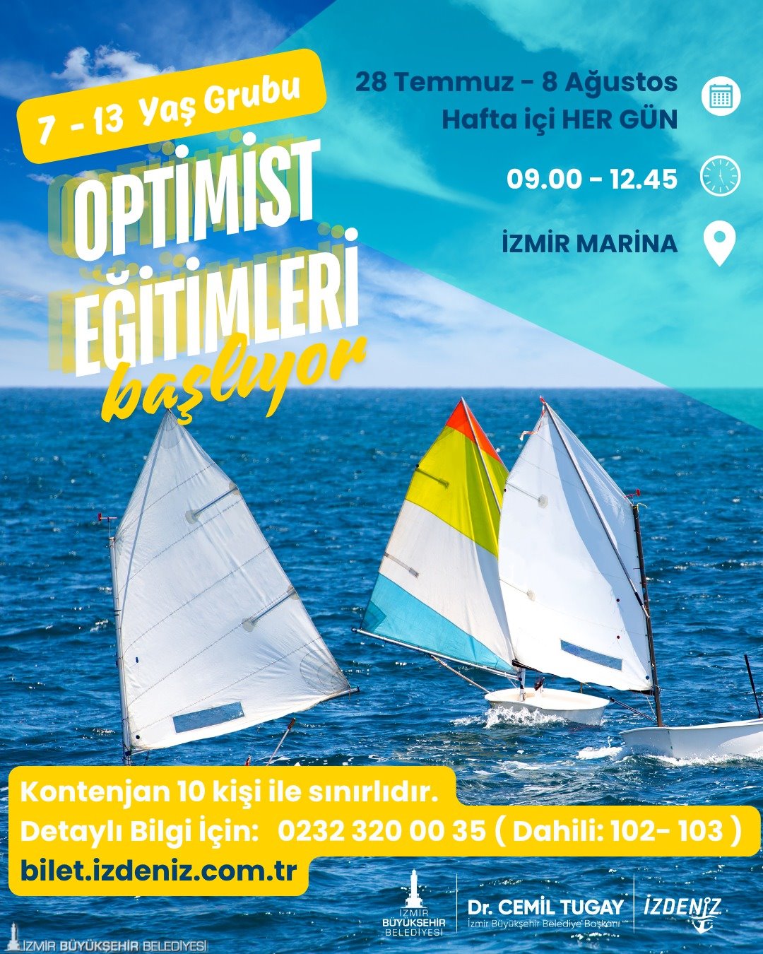 İzmir Marina’da ayrıca 7-13 yaş arası çocuklara özel Optimist Eğitimleri başlıyor. 28 Temmuz - 8 Ağustos tarihleri arasında hafta içi her gün düzenlenecek bu özel eğitimler, çocukların yaz tatilini hem aktif hem de öğretici bir etkinlikle değerlendirmesi için önemli bir fırsat sunacak. Kontenjan, 10 kişiyle sınırlandırıldı ve ücret kişi başı 10 bin TL olarak belirlendi. Eğitim sonunda katılımcılara “Türkiye Yelken Federasyonu D4 Eğitim Sertifikası” ve “Katılımcı Sertifikası” verilecek. Katılımcılar, bilet.izdeniz.com.tr adresinden kayıtlar yaptırılabilir. 0 232 320 00 35 -102 /103 numaralı telefondan bilgi alınabilir.