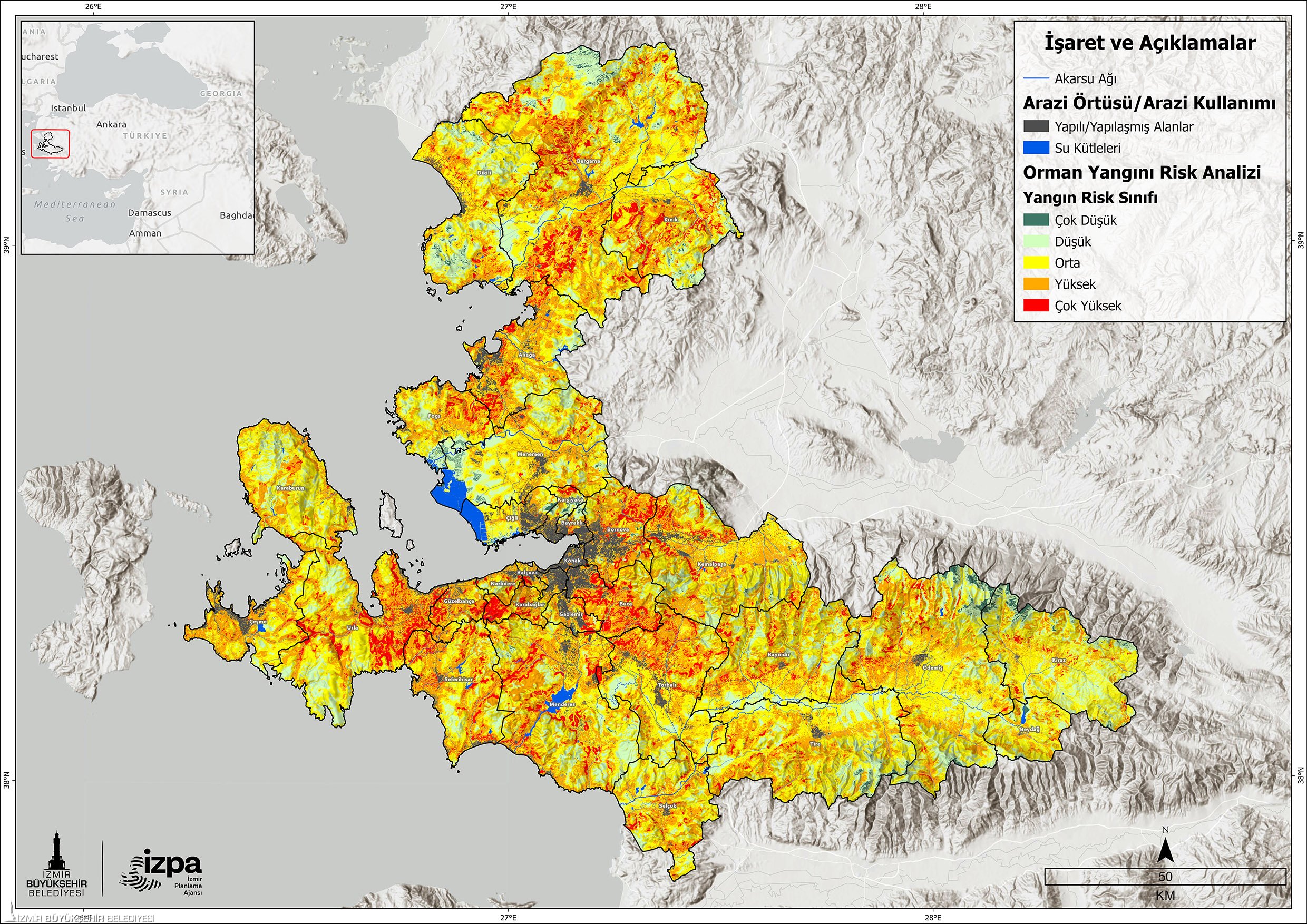 Mevsim normallerinin üzerindeki sıcaklıkların etkili olduğu İzmir, günlerce orman yangınları ile mücadele etti. Yerleşim yerlerini de etkileyen yangınlar İzmir için hala ciddi risk oluşturuyor. “İzmir’de Orman Yangını Riskinin Mekânsal Analizi” raporunu hazırlayan İzmir Planlama Ajansı (İZPA) da bu tehlikeye dikkat çekti. Raporda İzmir genelinde artan kuraklık, beşeri baskılar ve iklim değişikliğinin etkileriyle orman yangınlarının sıklığı ve etkisinin önemli ölçüde arttığı belirtildi. Bu çerçevede, İzmir Planlama Ajansı tarafından il genelindeki orman yangını riskini mekânsal olarak haritalamak ve önleyici müdahale planlamalarına veri temelli katkı sağlamak amacıyla kapsamlı bir analiz gerçekleştirildiği ifade edildi.