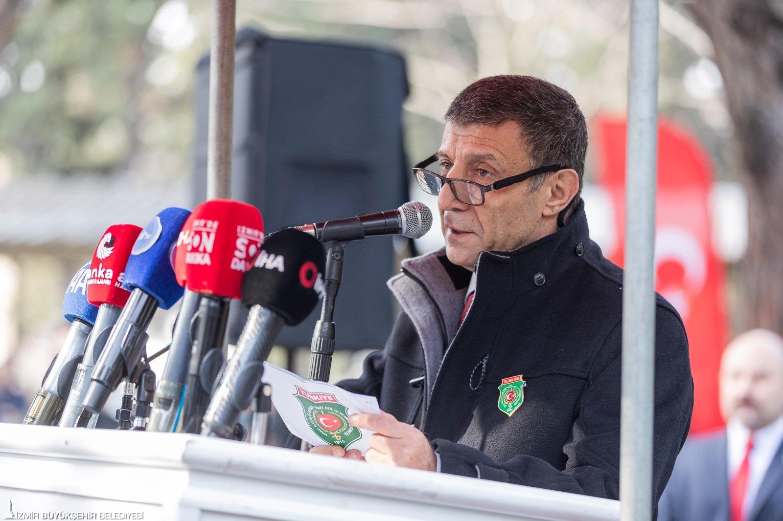 Cumhurbaşkanı Recep Tayyip Erdoğan’ın mesajının okunduğu törende, Türkiye Harp Malulü Gaziler Şehit, Dul ve Yetimleri Derneği İzmir Şubesi Başkanı Recep Doğru da bir konuşma yaptı. Doğru, “Son nefesimize kadar onurlu mirasımıza sahip çıkacağız. Çanakkale’de elde edilen büyük zaferin en önemli nedeni; düşman işgaline karşı Türk milletinin, tüm yokluk ve imkânsızlıklara rağmen, dini, inancı ve mezhebi ne olursa olsun tek yürek hâlinde vatan için kenetlenmesidir. O gün herkes kardeş olmuştu. Çanakkale, kardeşlerle düşmanların savaşıydı.