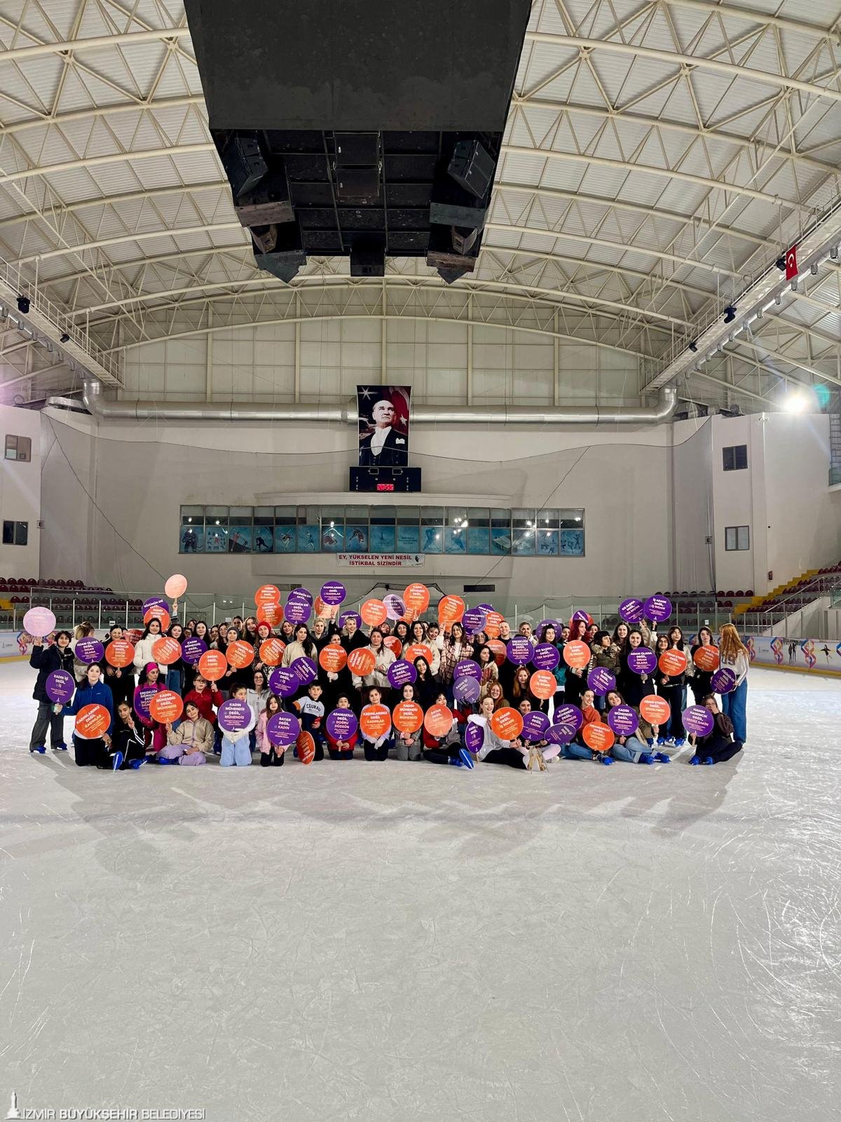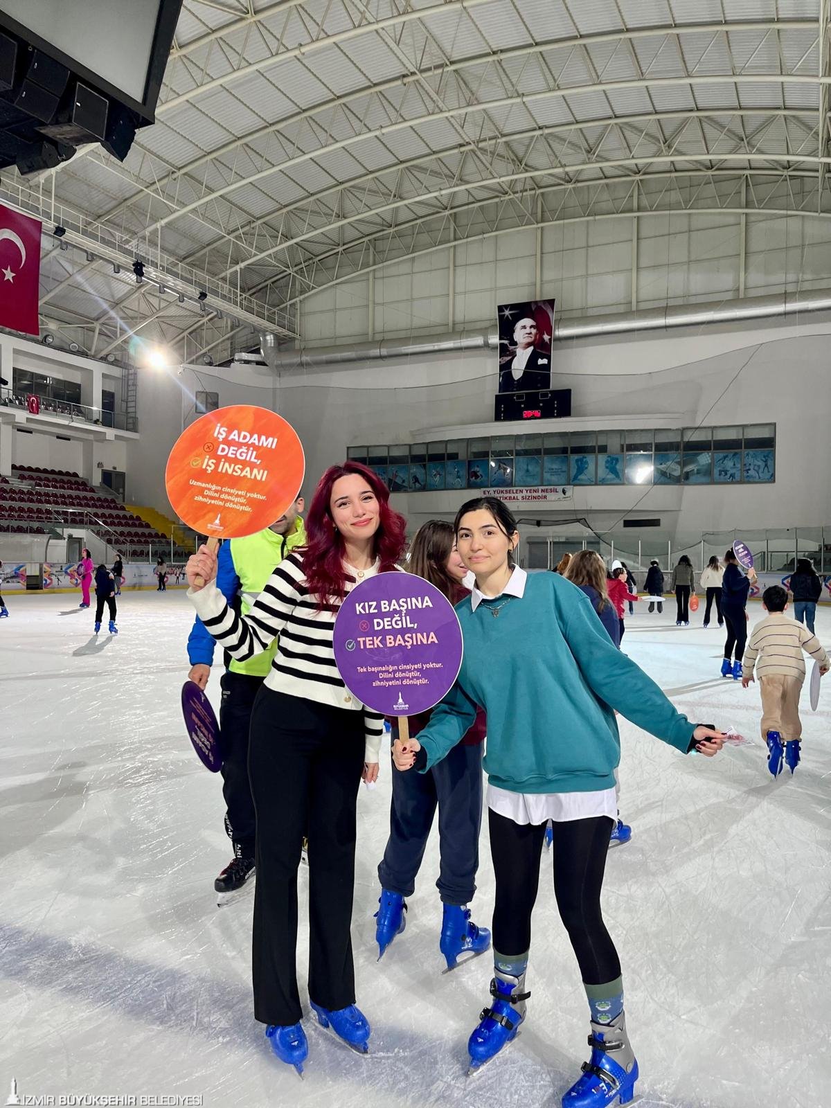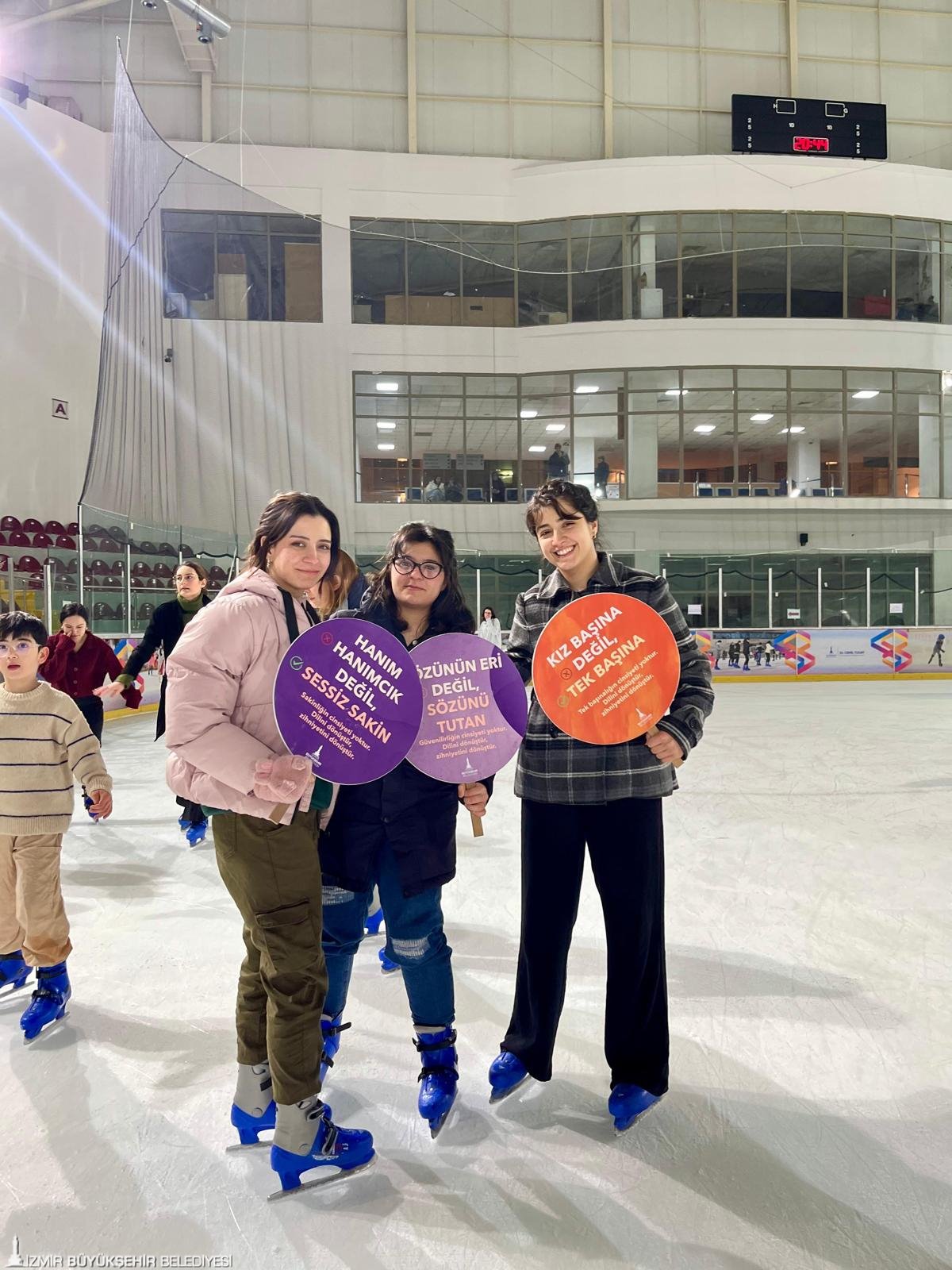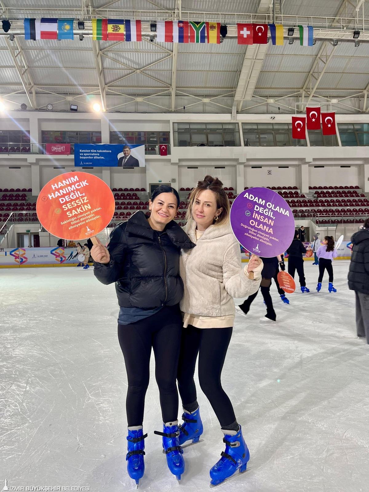 İzmir Büyükşehir Belediyesi, 8 Mart Dünya Emekçi Kadınlar Günü'nü "Kadın Her Yerde" sloganı ile çok sayıda farklı etkinlikle kutluyor. Program kapsamındaki ilk organizasyon, Bornova Aşık Veysel Rekreasyon Alanı'nda yer alan Buz Sporları Salonu'nda gerçekleştirildi. Buz pisti 16.00-16.45 ve 20.00-20.45 saatleri arasında kadınlara özel hizmet verdi. Ücretsiz seansta profesyonel eğitmenlerin gözetiminde buzda kaymayı deneyimleyen kadınlar müzik ve ışık gösterileri eşliğinde keyifli bir gün geçirdi. Kadınlar, organizasyon sırasında toplumsal cinsiyet eşitliğine vurgu yapan dövizler taşıdı.