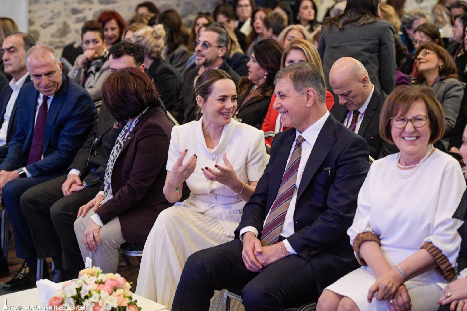 Programda “Öznur Tugay’ın eşi İzmir Büyükşehir Belediye Başkanı Dr. Cemil Tugay” şeklinde takdim edilen Başkan Tugay, “Hepinizin katılımı İzmir adına onurdur. Benimle ilgili takdimi onur duyarak kabul ediyorum. Biz aslında ilk defa bir toplantıda konuşuyoruz ve eşimi gururla dinledim. Bu toplantının organizasyonundaki emeğini takdir ediyorum. Onunla her zaman gurur duydum, bugün o gururu bir kez daha hissettirdi” diye konuştu.