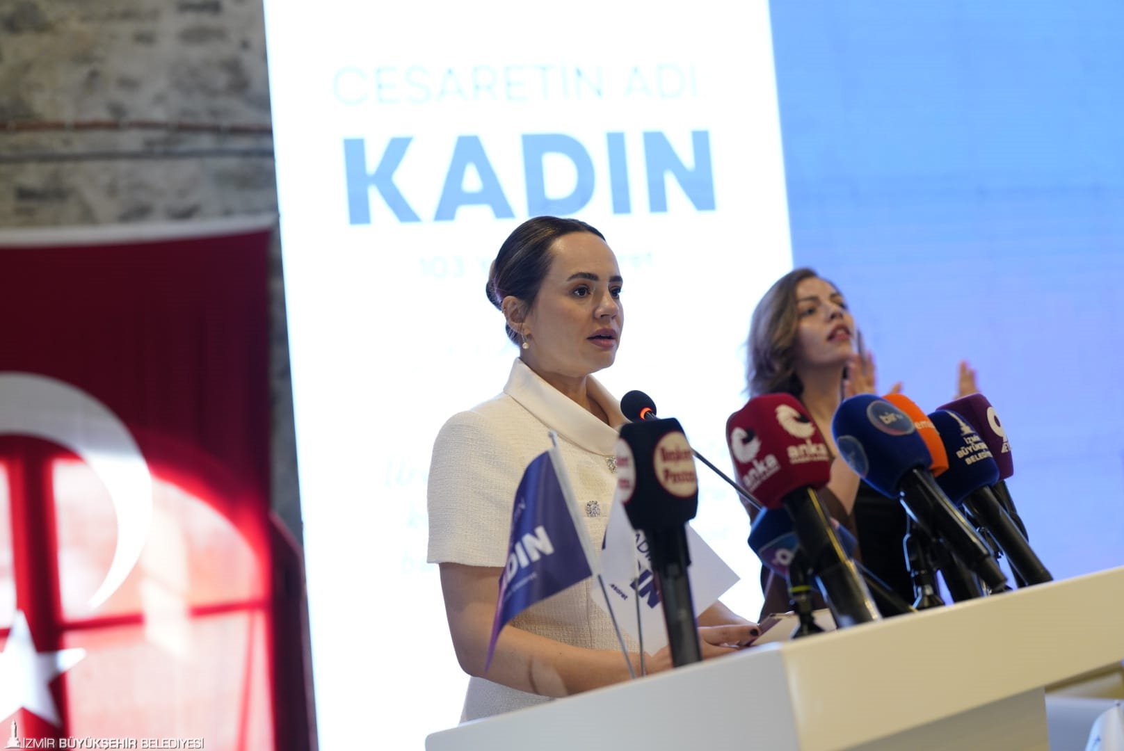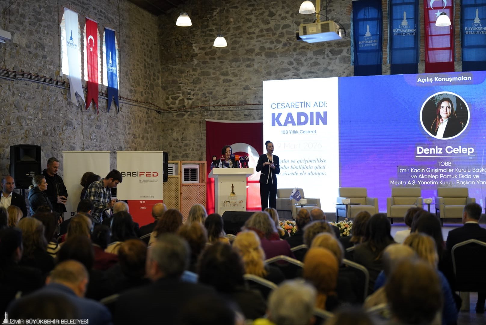 İzmir Büyükşehir Belediyesi, Batı Anadolu Sanayici ve İş İnsanları Dernekleri Federasyonu (BASİFED) ve TOBB İzmir Kadın Girişimciler Kurulu tarafından kadınların ekonomik hayattaki rolünü güçlendirmek ve ilham veren başarı hikâyelerini görünür kılmak amacıyla 8 Mart Dünya Kadınlar Günü kapsamında “Cesaretin Adı: Kadın-103 Yıllık Cesaret” zirvesi yapıldı. İş dünyasının temsilcilerini, kadın girişimcileri, akademisyenleri, sanatçıları, medya mensuplarını ve gençleri aynı çatı altında buluşturan zirvede, kadın girişimciliğinden liderliğe; yapay zekâ ve toplumsal cinsiyet ilişkisinden iş dünyasında ve medyada kadının yerine kadar pek çok önemli başlık ele alındı. Yalnızca ilham veren hikâyeler değil, somut çözüm önerileri, iyi uygulama örnekleri ve iş birliği modellerinin de konuşulduğu programa İzmir Büyükşehir Belediye Başkanı Dr. Cemil Tugay ve zirvenin fikir lideri eşi Öznur Tugay, BASİFED Yönetim Kurulu Başkanı Semiha Güneş, TOBB İzmir Kadın Girişimciler Kurulu Başkanı Deniz Celep, İzmir Büyükşehir Belediyesi Başkan Vekili Dr. Zafer Levent Yıldır ile İzmir Büyükşehir Belediyesi Genel Sekreter Yardımcısı Prof. Dr. Pınar Okyay da katıldı. Zirve; iş dünyası, girişimcilik, sanat, medya ve sivil toplum alanlarında ülkemize değer katan pek çok önemli ismin katkı sunduğu panellerle devam etti.